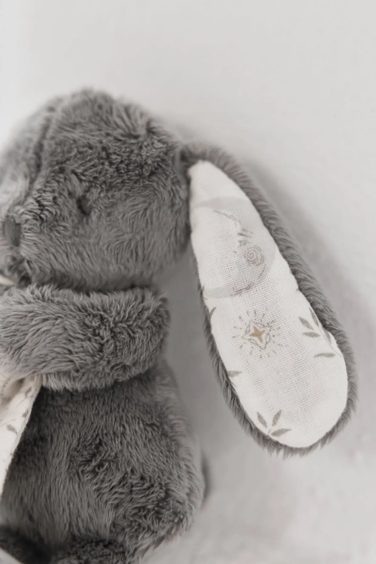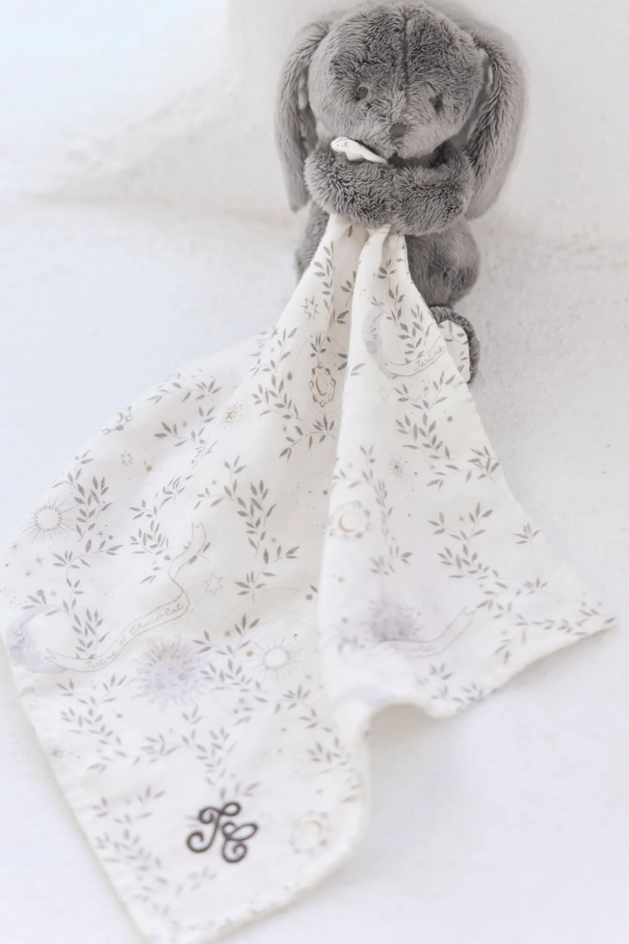 Augustin le lapin revient sous une nouvelle forme avec son imprimé poétique Rêve étoilé, dessiné par Tartine et Chocolat. Petit lapin câlin au pelage gris anthracite et aux longues oreilles doublées d’un motif étoilé, il est facile à attraper pour bébé. Avec son visage rassurant et sa douceur infinie, il accompagnera les plus tendres rêves de bébé. Cet adorable doudou est présenté dans une élégante boîte imprimée Rêve étoilé.