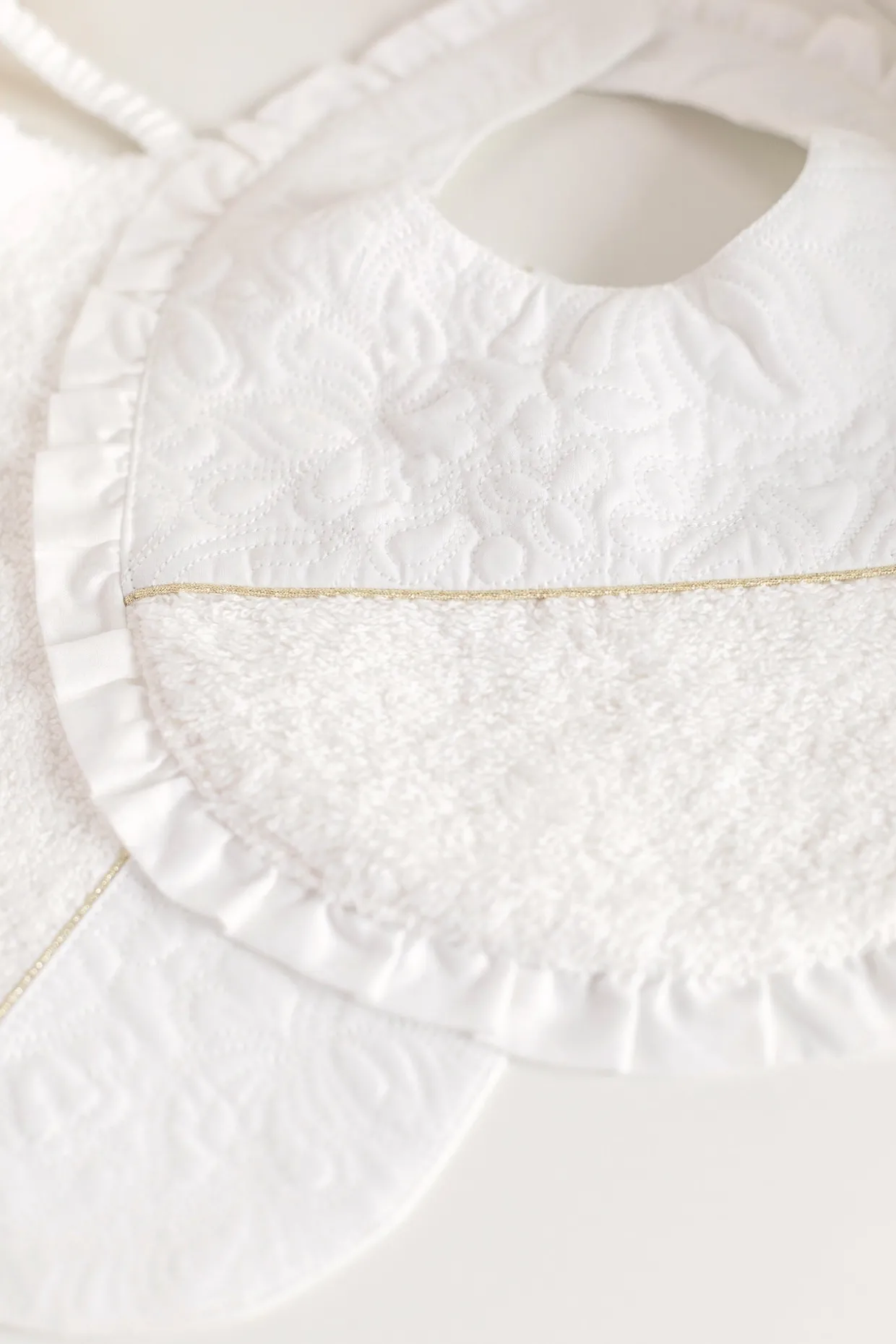 Bavoir Délicatesse nacre en percale de coton émérisée et broderies. Livré dans une pochette en organza. Ouverture par un bouton pression. Dimensions : 21 x 27,5 cm. La ligne Délicatesse : Le raffinement et l’élégance de cette ligne illuminent l’univers féérique de la petite fille. Plastron en percale brodée, fils d’or et signature nacrée réhaussent avec modernité les lignes épurées de cette collection. Fabriqué au Portugal.