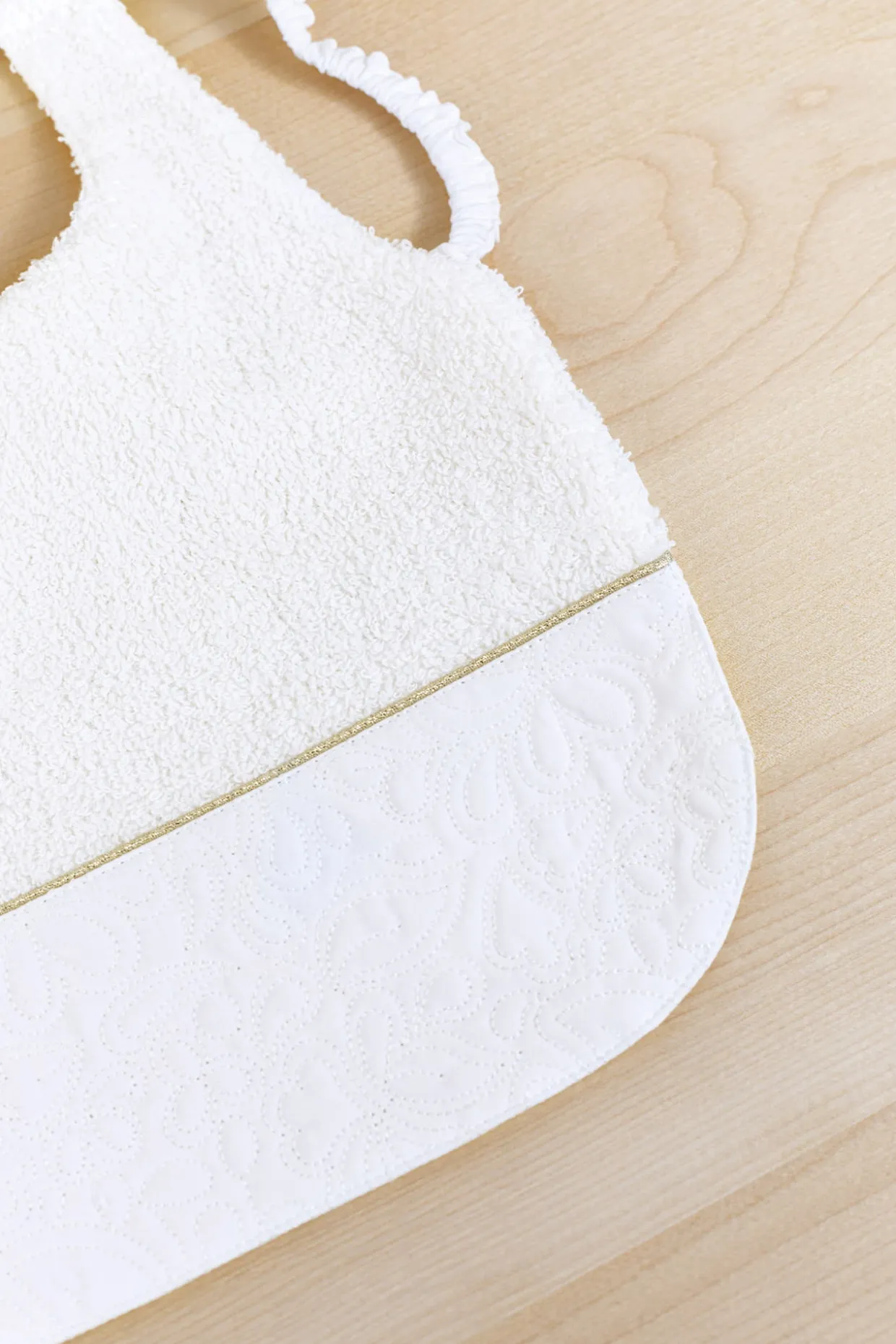 Bavoir Délicatesse nacre en percale de coton émérisée et broderies. Livré dans une pochette en organza. Passage pour les bras et la tête. Dimensions : 24 x 28 cm. La ligne Délicatesse : Le raffinement et l’élégance de cette ligne illuminent l’univers féérique de la petite fille. Plastron en percale brodée, fils d’or et signature nacrée réhaussent avec modernité les lignes épurées de cette collection. Fabriqué au Portugal.