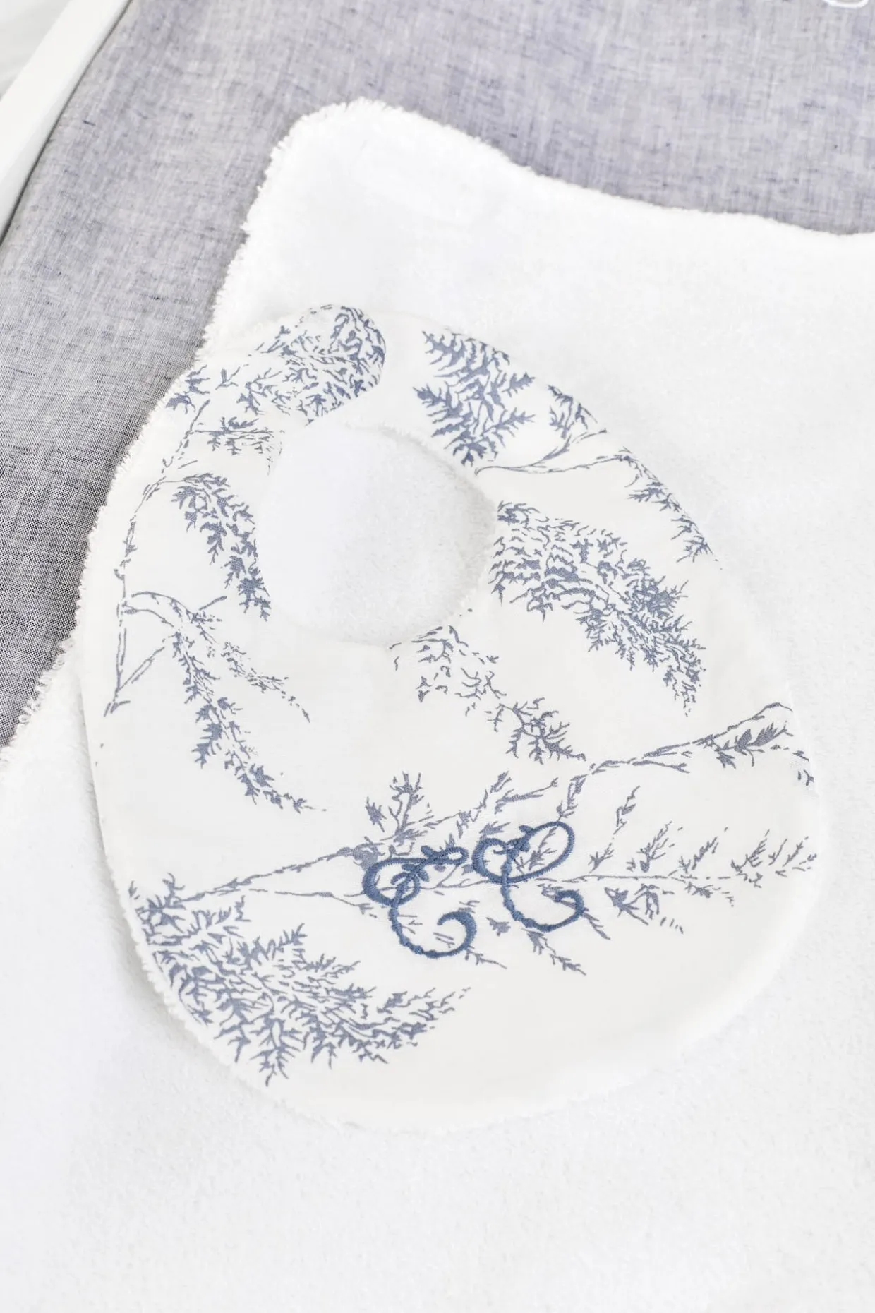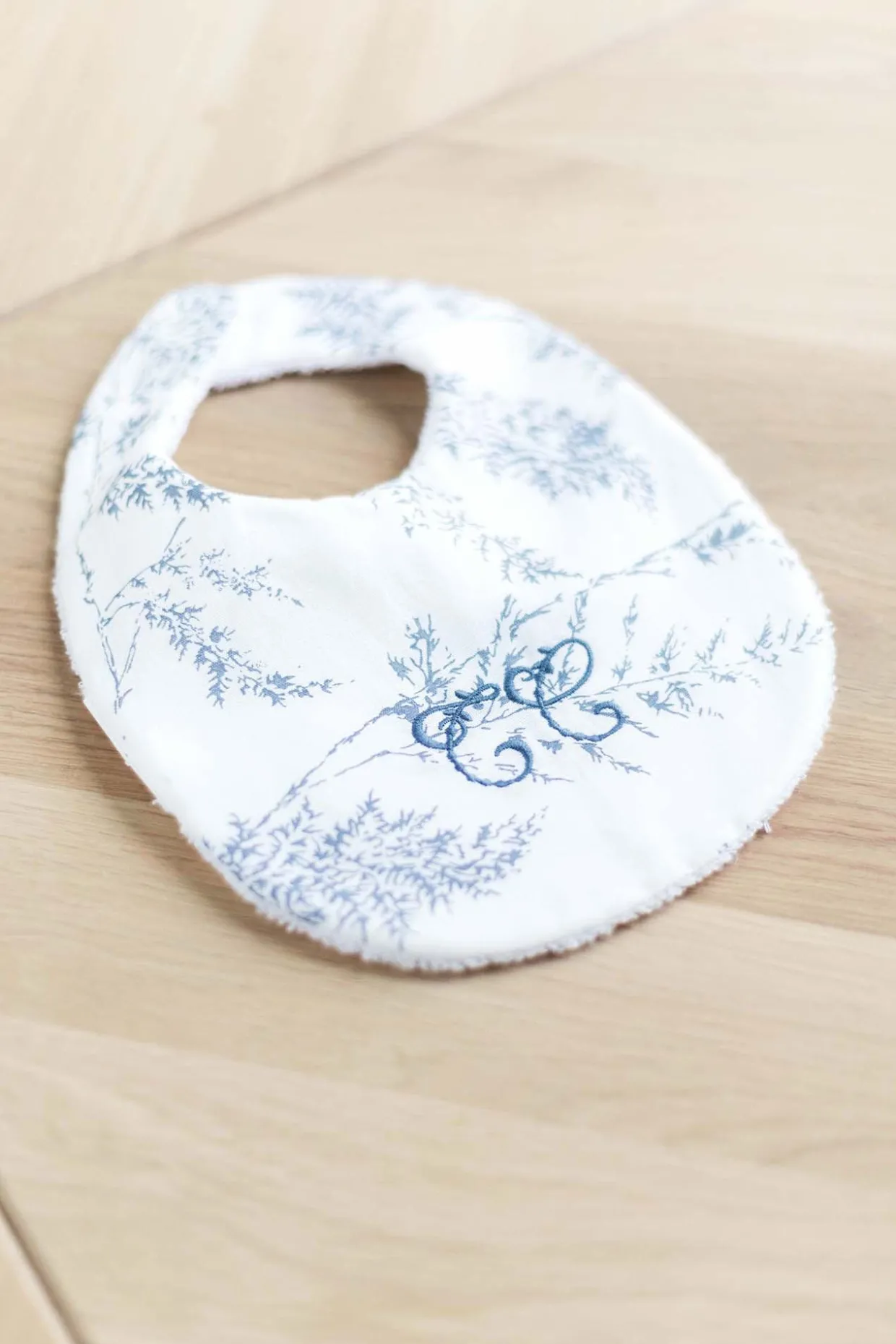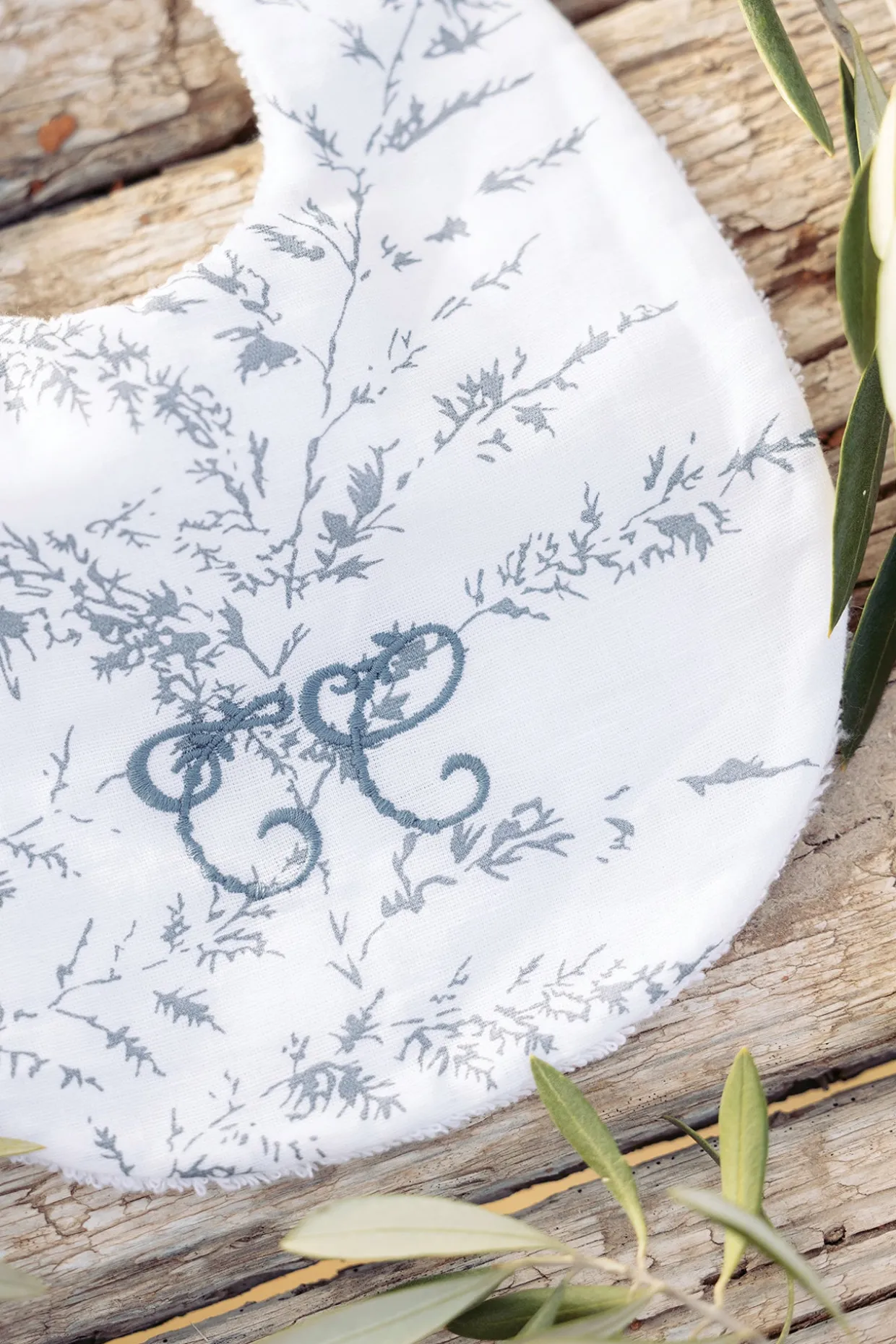 Bavoir Feuillage en coton et lin au délicat imprimé. Ouverture par bouton pression. Dimensions : 21 x 27,5 cm. Fabriqué au Portugal. La ligne Feuillage : une ligne coup de coeur chez Tartine et Chocolat. Feuillage allie l’intemporalité et la sobriété du chambray avec la fraicheur et la modernité de l’imprimé.