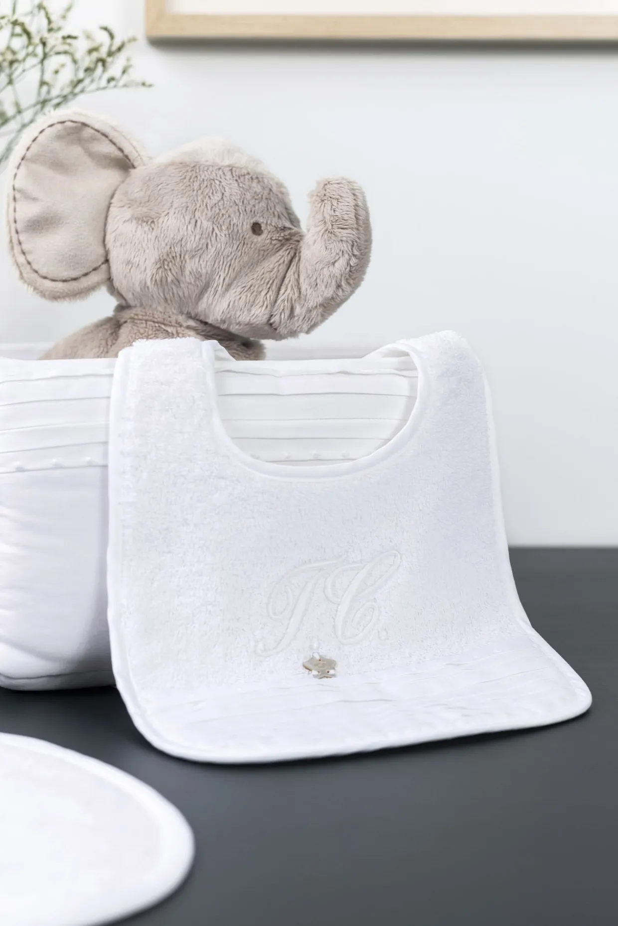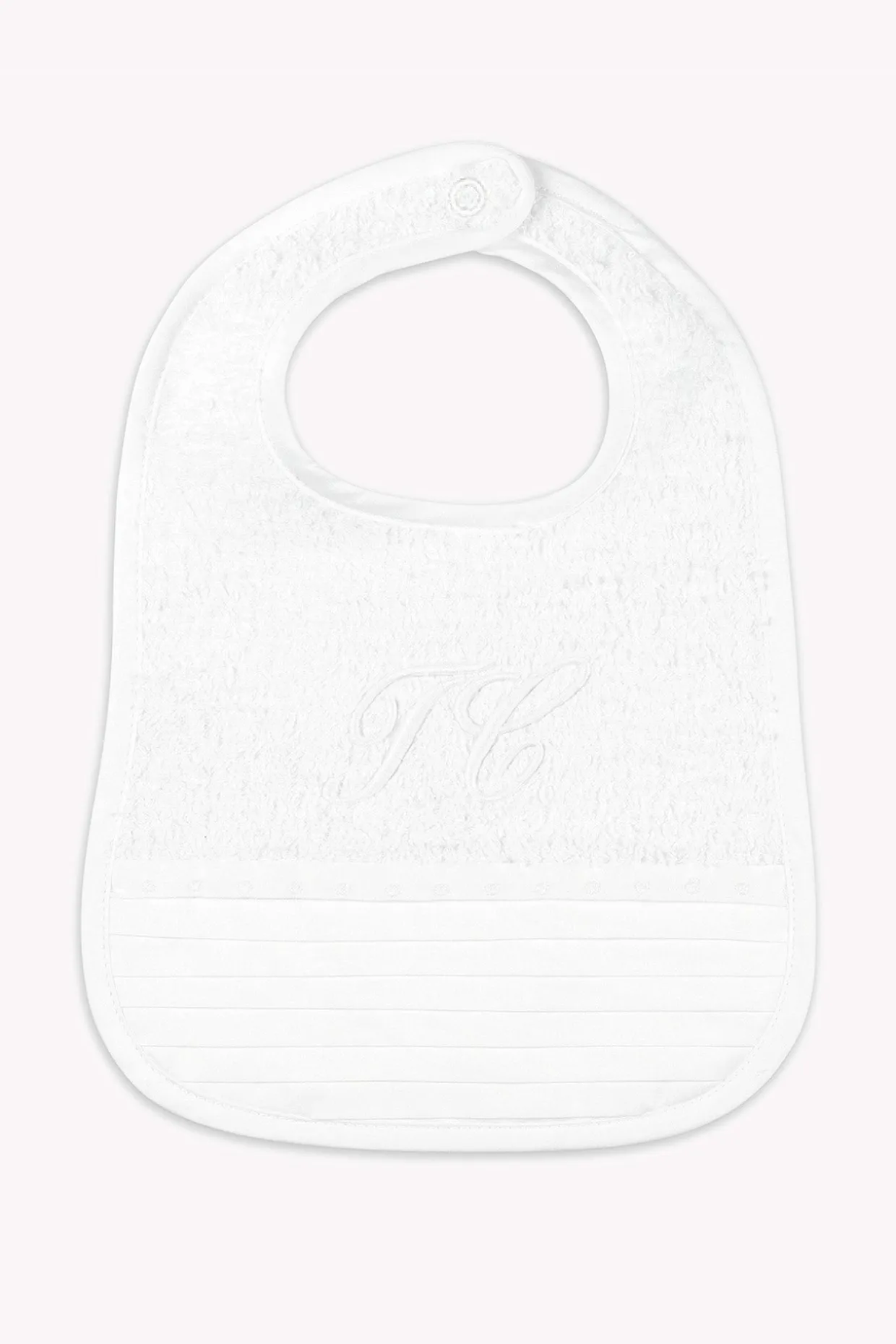 Bavoir Monogramme blanc en popeline de coton, piqué fil à fil et éponge. Ouverture par bouton pression. Dimensions : 25,5 x 29 cm. La ligne Monogramme : Etoiles de nacre, plis religieux et broderies réhaussent avec délicatesse l’élégance et la pureté de cette ligne. Discret et chic, cette ligne pour fille ou garçon est un véritable cocon de blancheur. Fabriqué au Portugal.