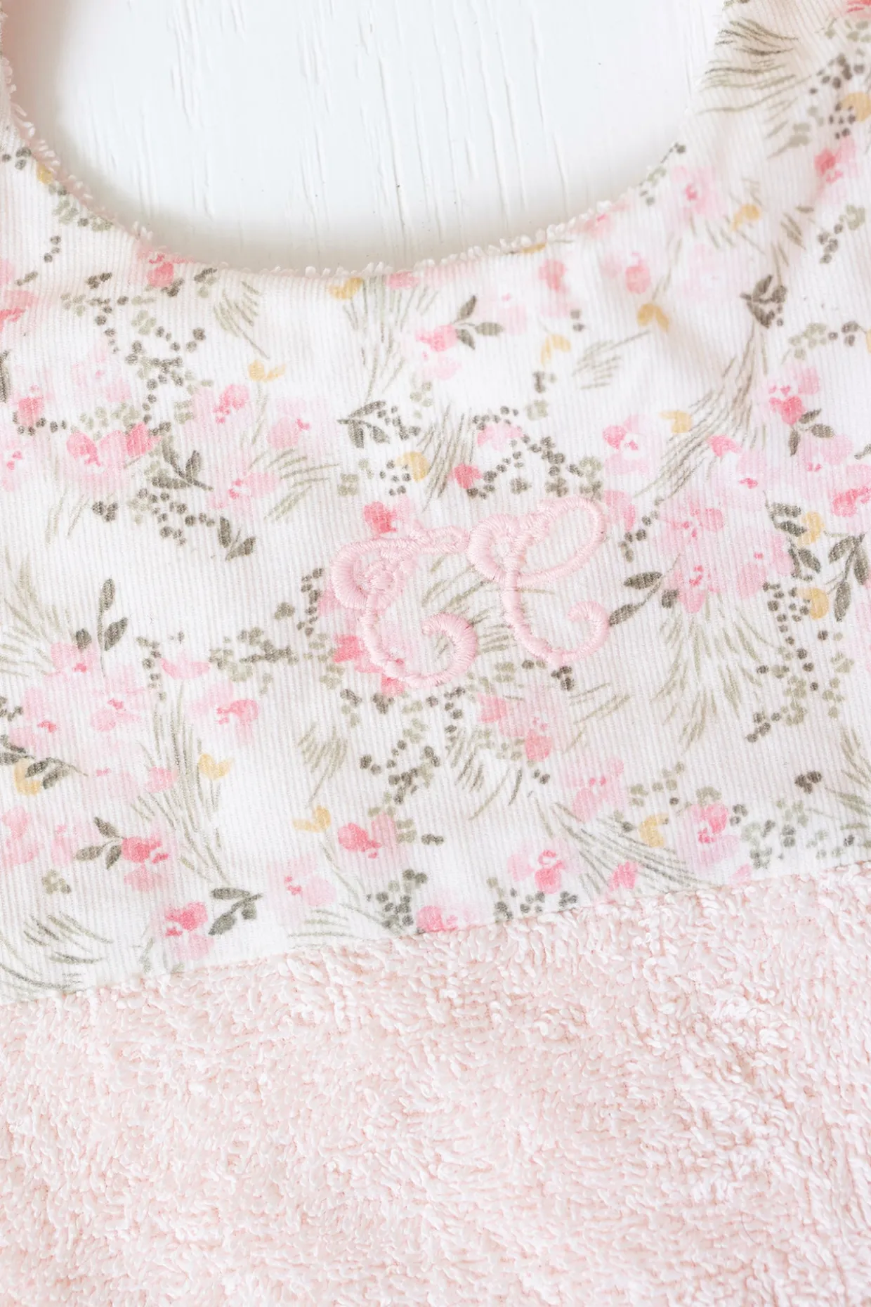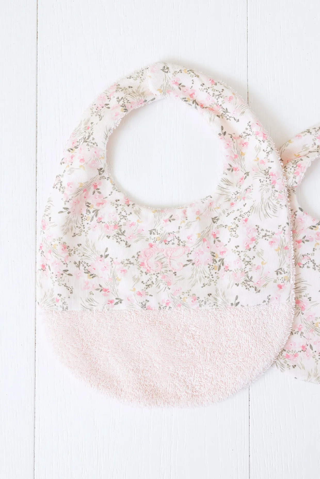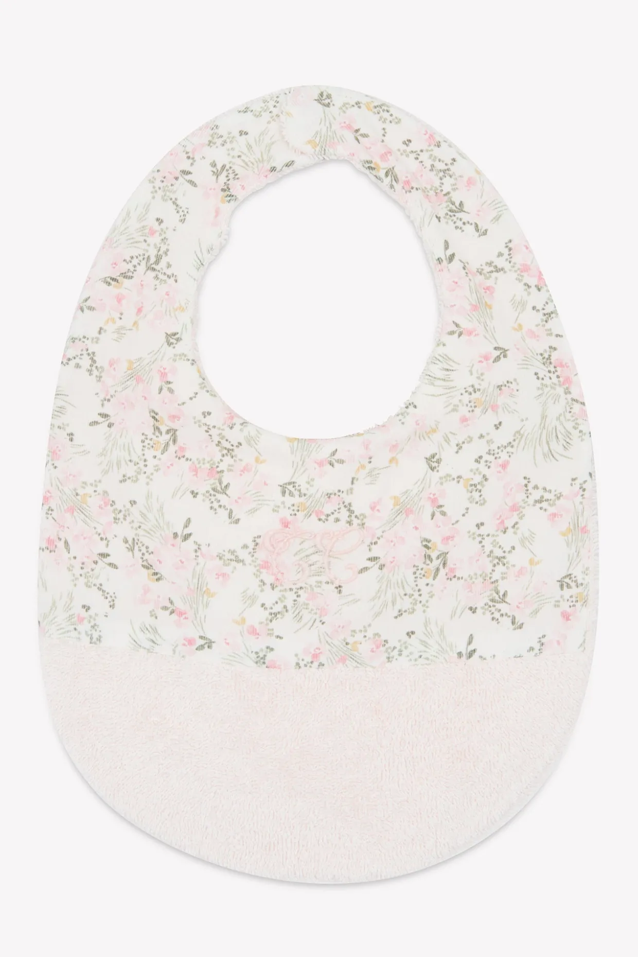 Bavoir imprimé fleuri inspiré d’un Jardin Hivernal. Fermeture avec bouton pression. Dimensions : 34 x 23 cm.