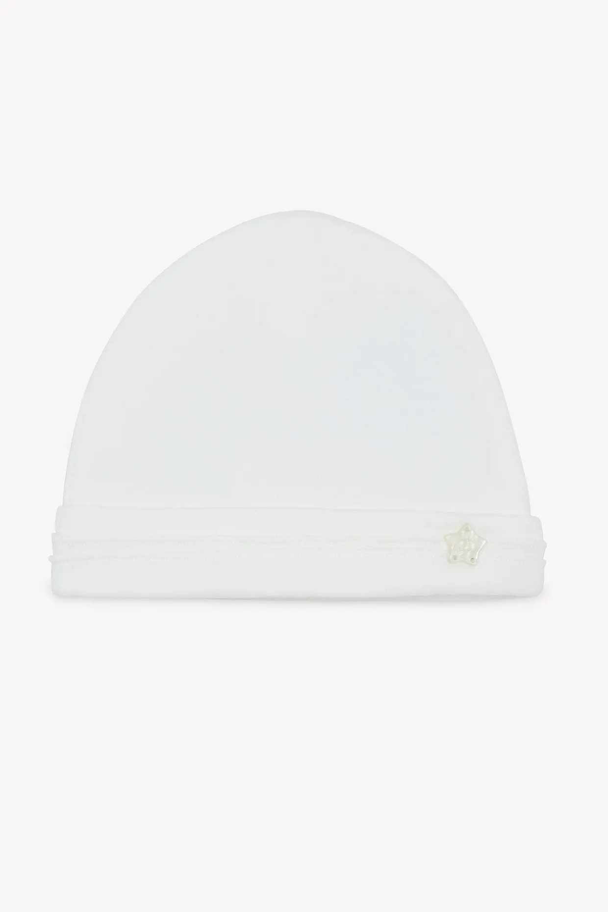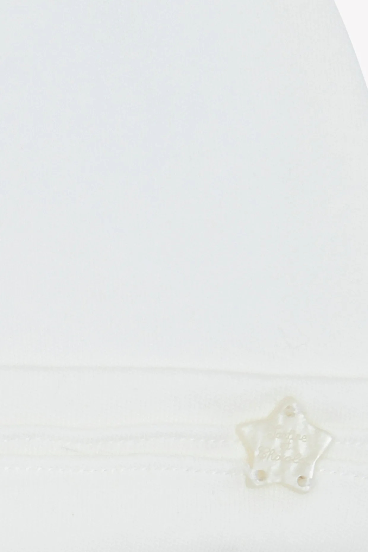 Bonnet Délicatesse nacre, en percale de coton émérisée. La ligne Délicatesse : Le raffinement et l’élégance de cette ligne illuminent l’univers féérique de la petite fille. Plastron en percale brodée, fils d’or et signature nacrée réhaussent avec modernité les lignes épurées de cette collection. Composition: 100% coton