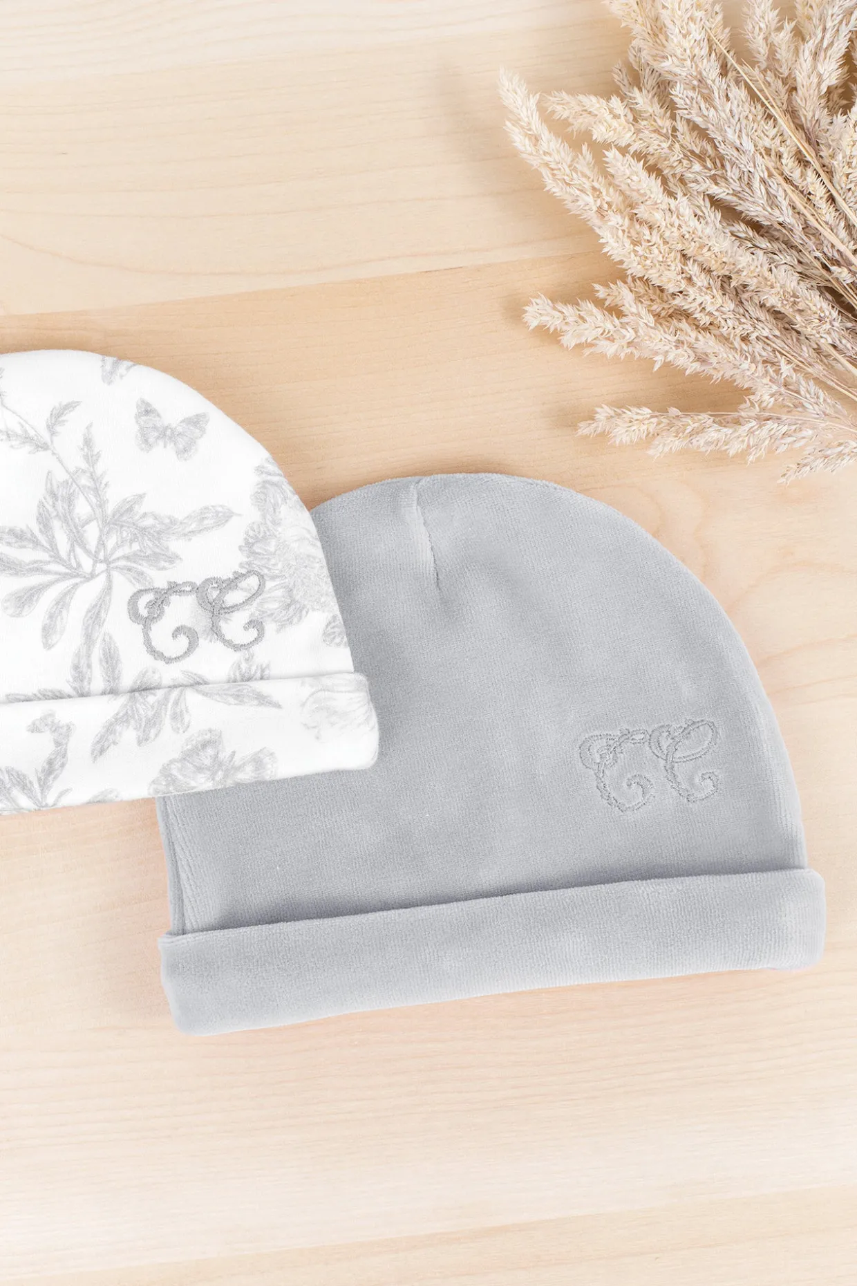 Bonnet en velours imprimé inspiration Toile de Jouy gris dessiné par Tartine et Chocolat, assorti au pyjama du thème Toile de Jouy.