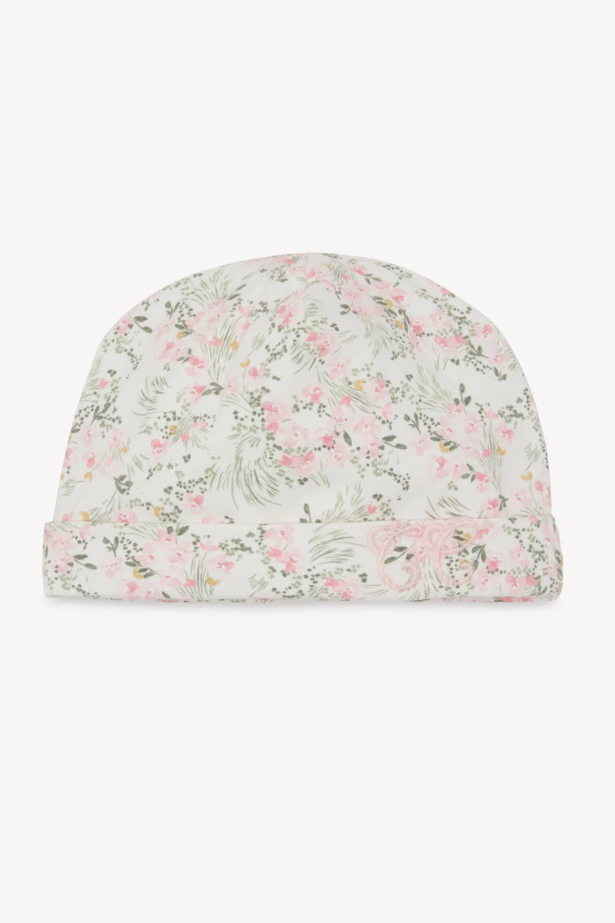 Bonnet en jersey imprimé fleuri inspiré d’un Jardin Hivernal, assorti au pyjama du thème Jardin Hivernal.