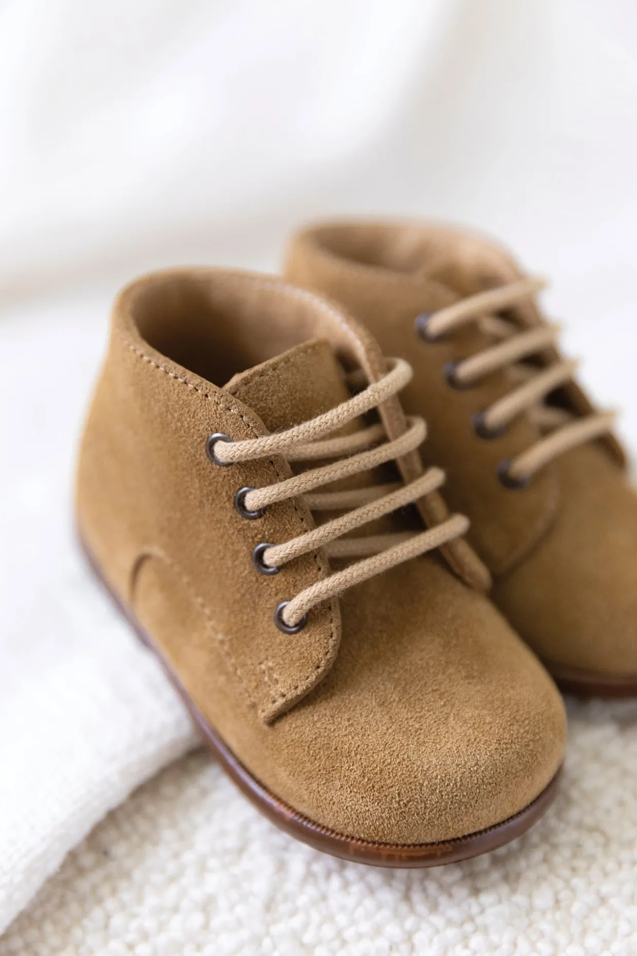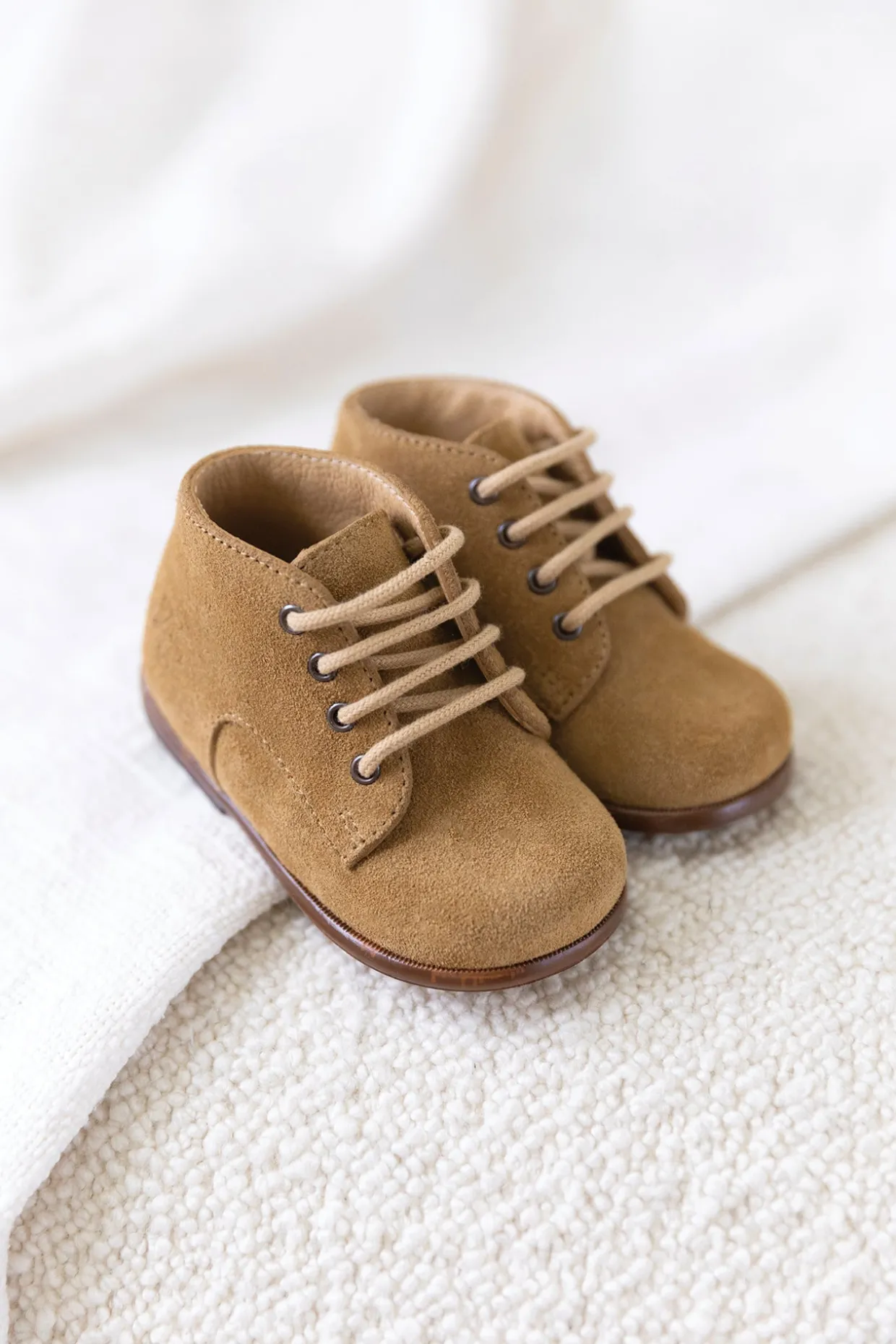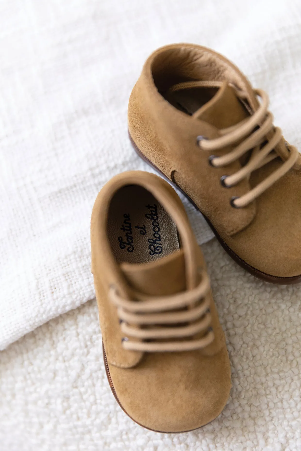 Ces chaussures premiers-pas à lacets sont présentées dans une version en cuir velours camel. Elles est conçues avec des matériaux de qualité pour le bon développement du pied et l’apprentissage de la marche. Dotées d’un contrefort asymétrique et d’un emboîtage arrière fin, elles se chaussent facilement grâce à ses lacets permettant un bon ajustement et un maintien de la cheville. La semelle intérieure ne possède pas de voûte plantaire afin de laisser le pied se muscler librement. On adore ces bottines pour garder les petits pieds confortables et élégants, que ce soit pour une promenade en famille ou une occasion spéciale.