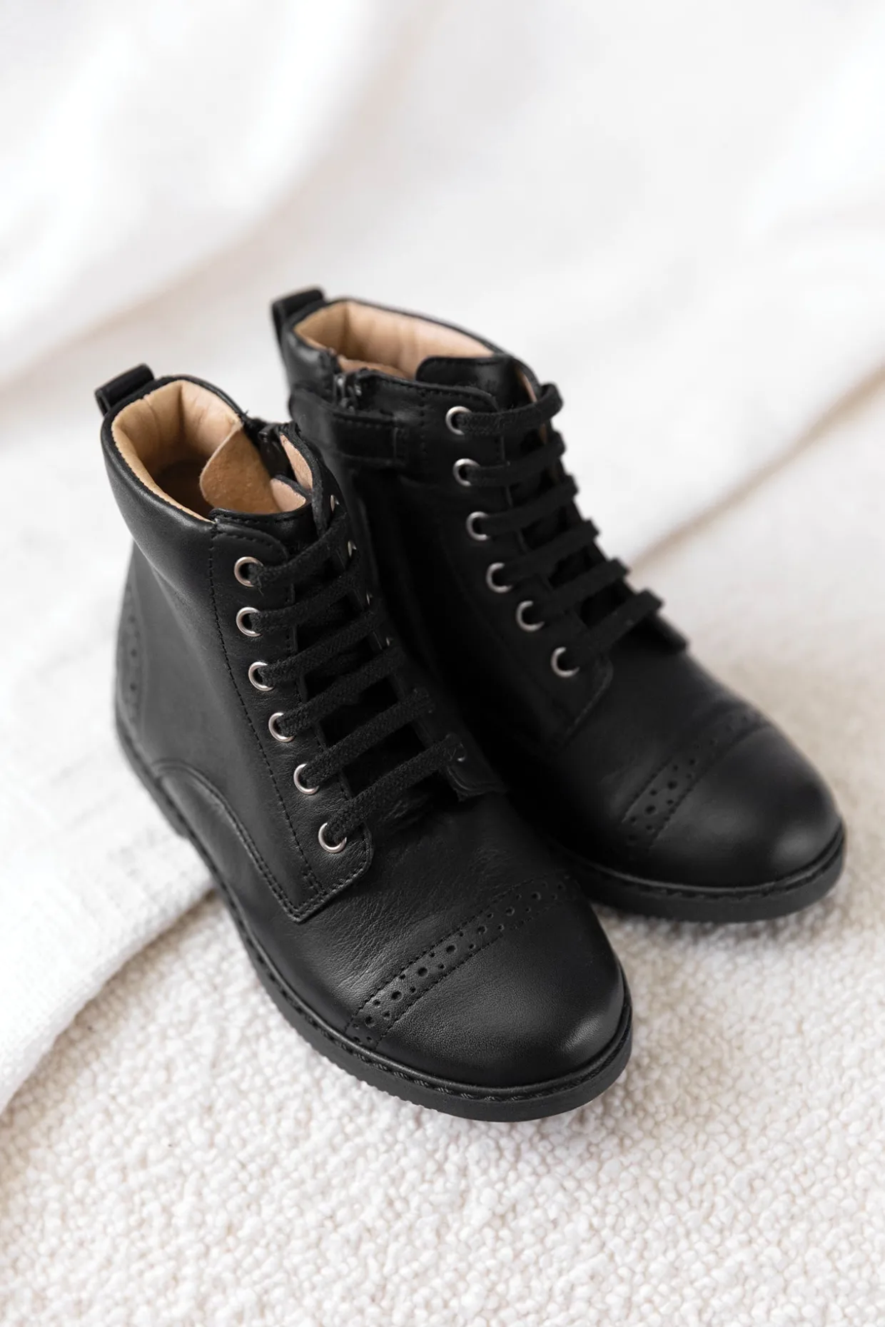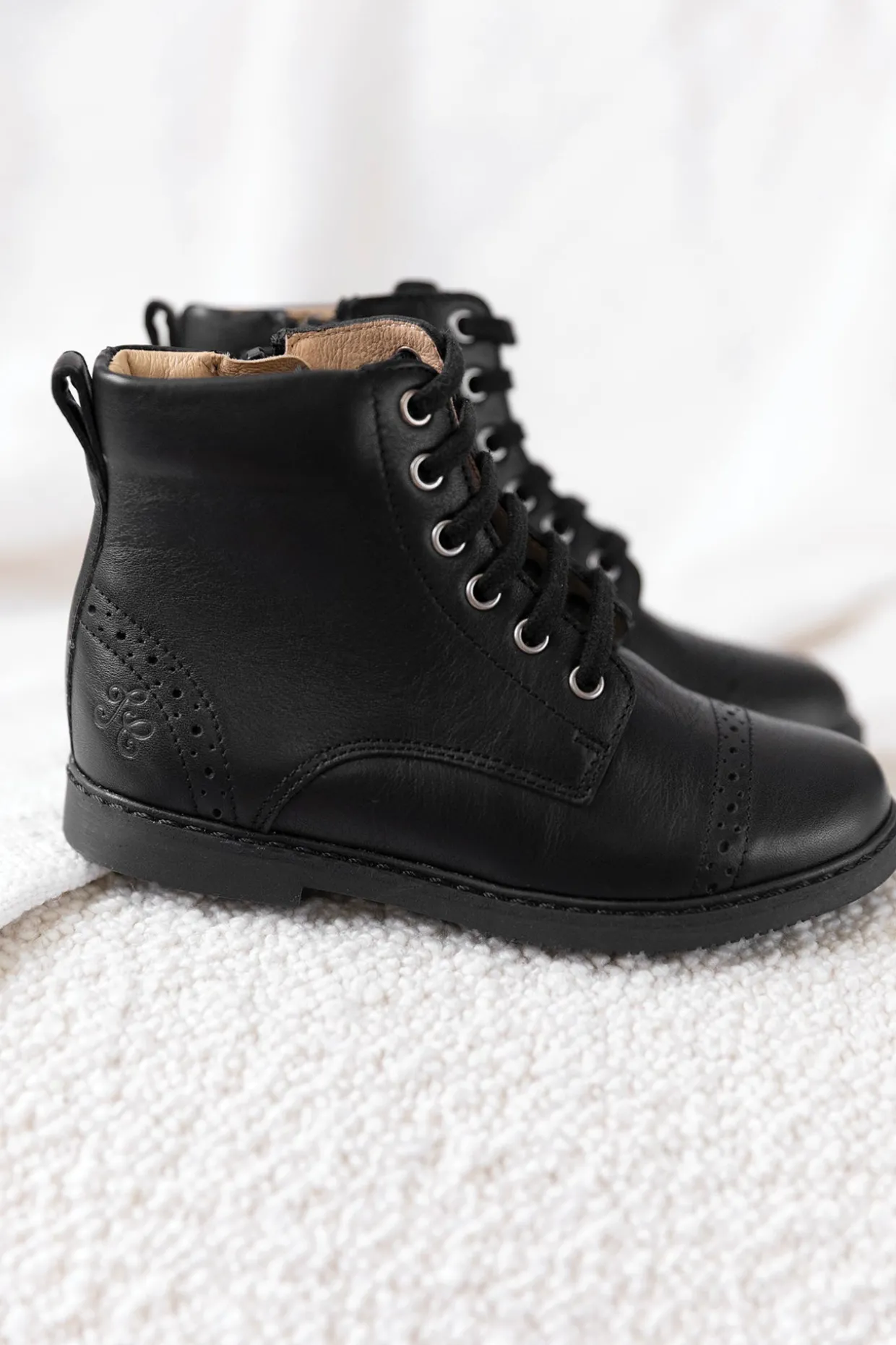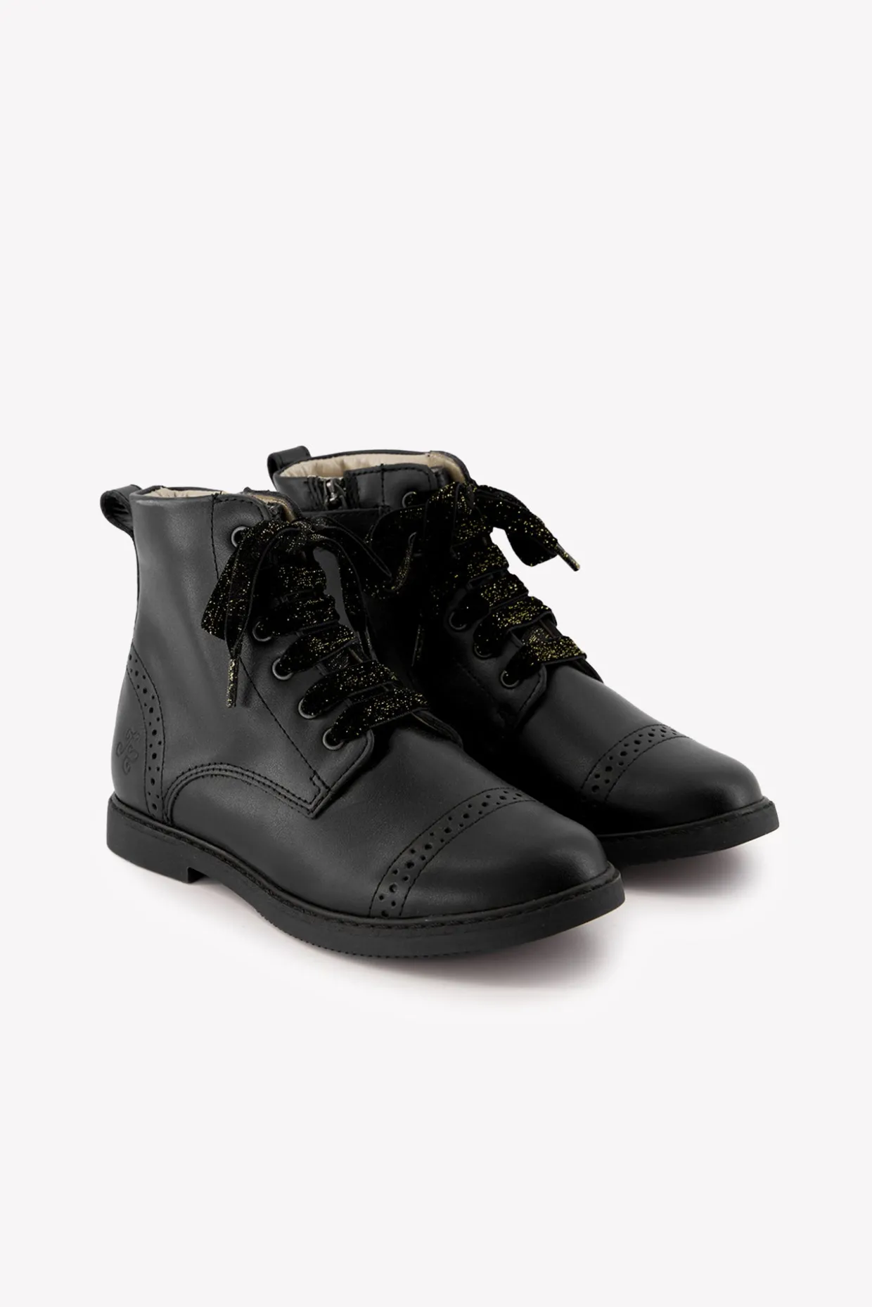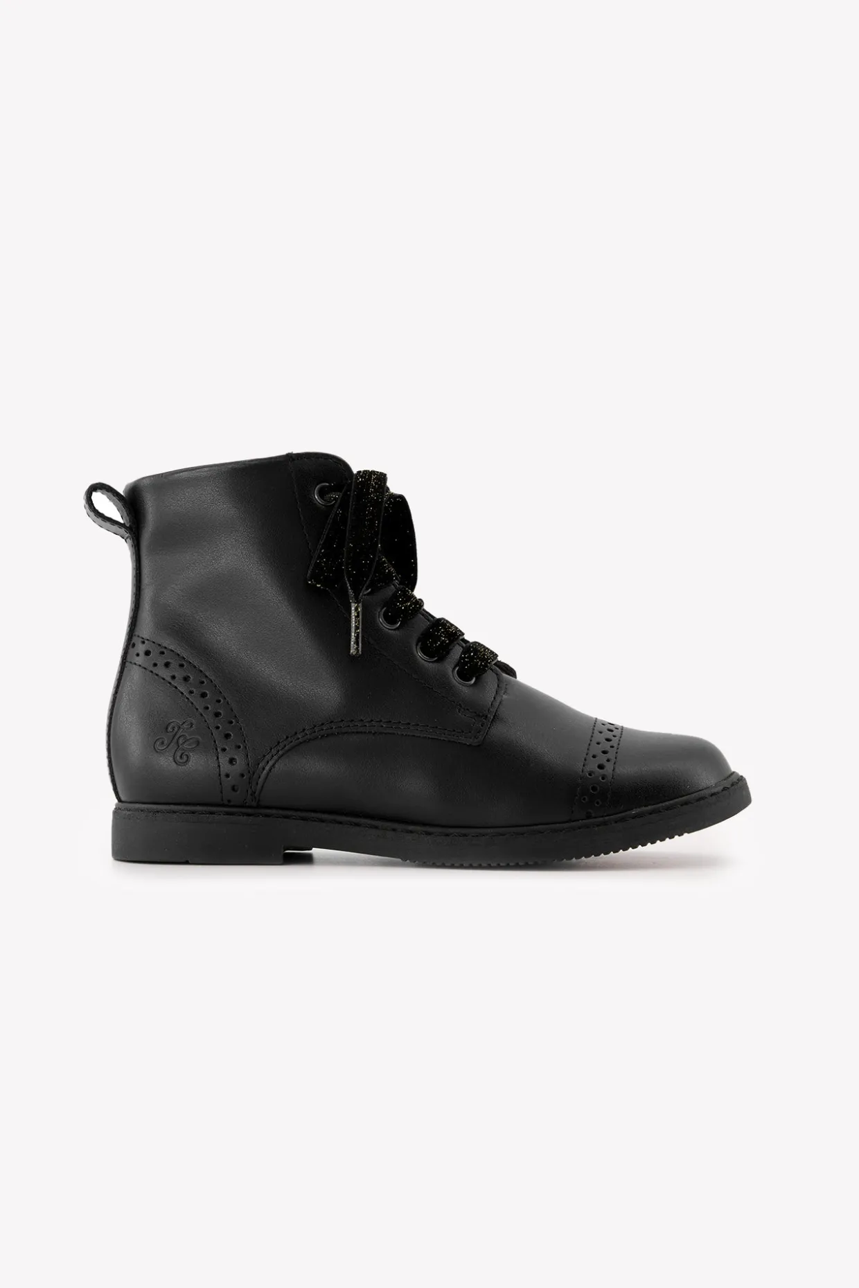 Ces bottines pour enfants sont présentées dans une version en cuir lisse noir. Elles sont conçues avec des matériaux de qualité pour le bon développement du pied et l’apprentissage de la marche. Dotées d’un contrefort d’un col matelassé, elles se chaussent facilement grâce à un lacet et un zip intérieur auto bloquant permettant un bon ajustement et un maintien de la cheville. Ces bottines allient tendance et praticité. Elles sont parfaites pour compléter toutes les tenues de votre fille avec élégance et confort.