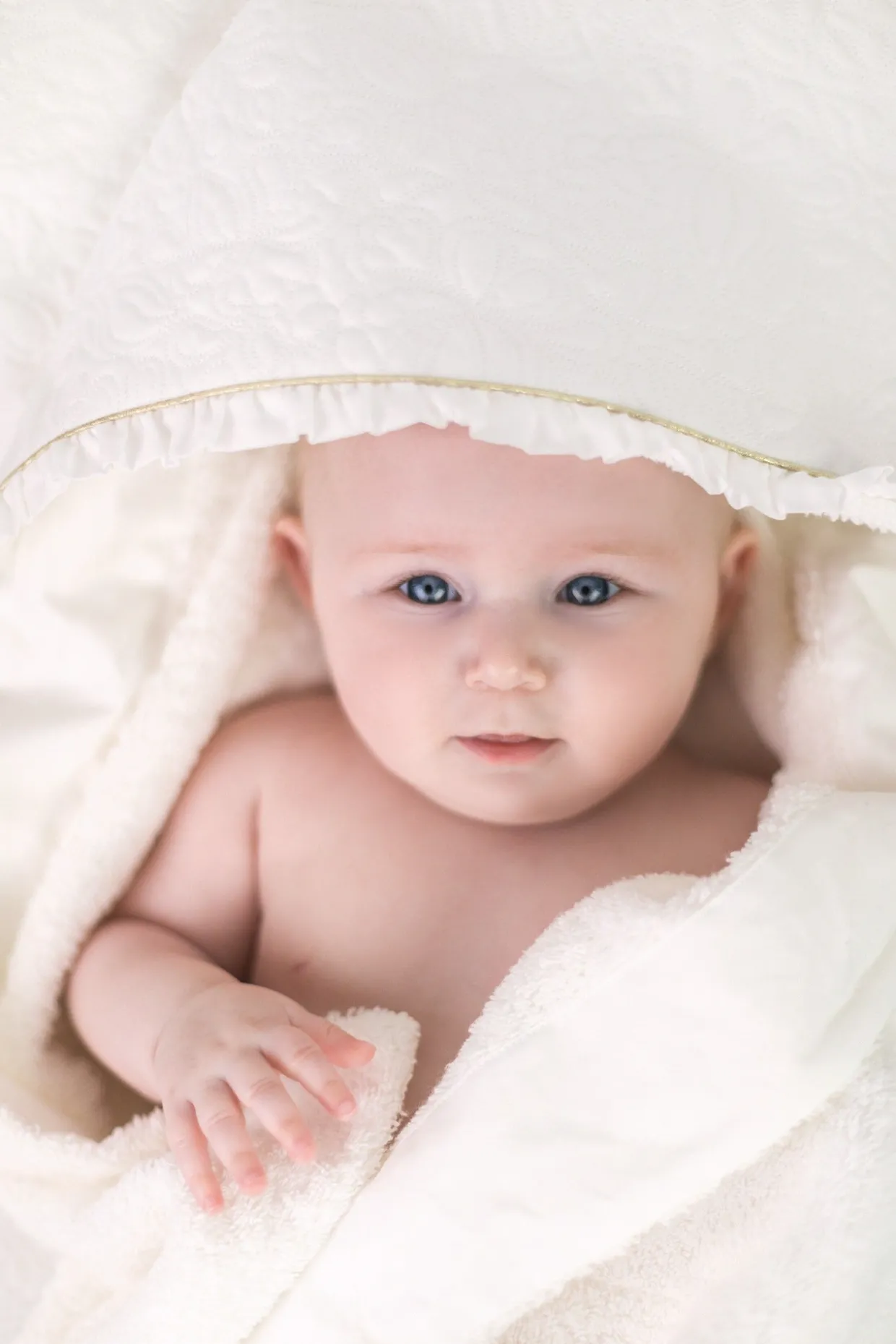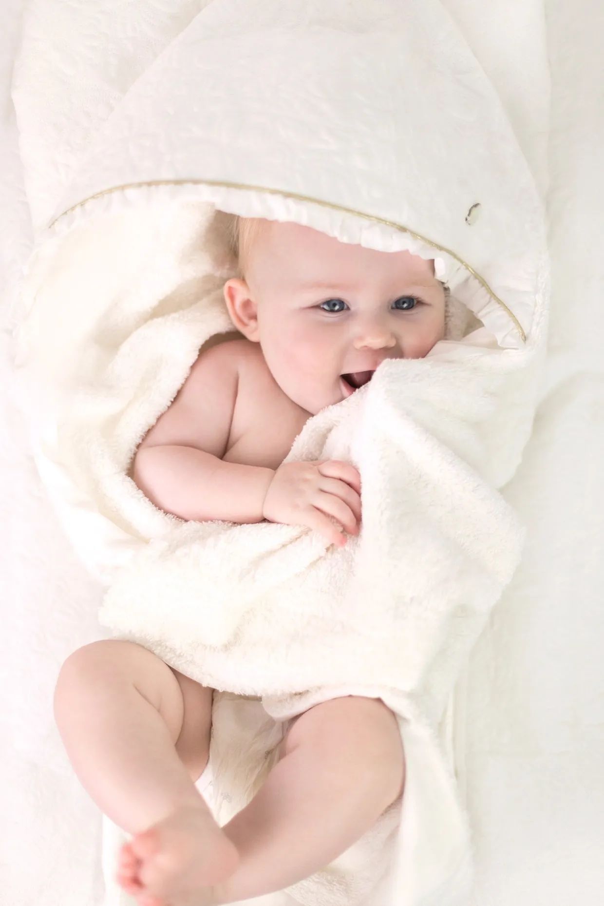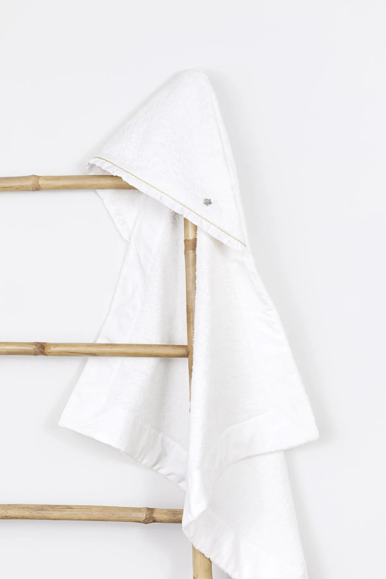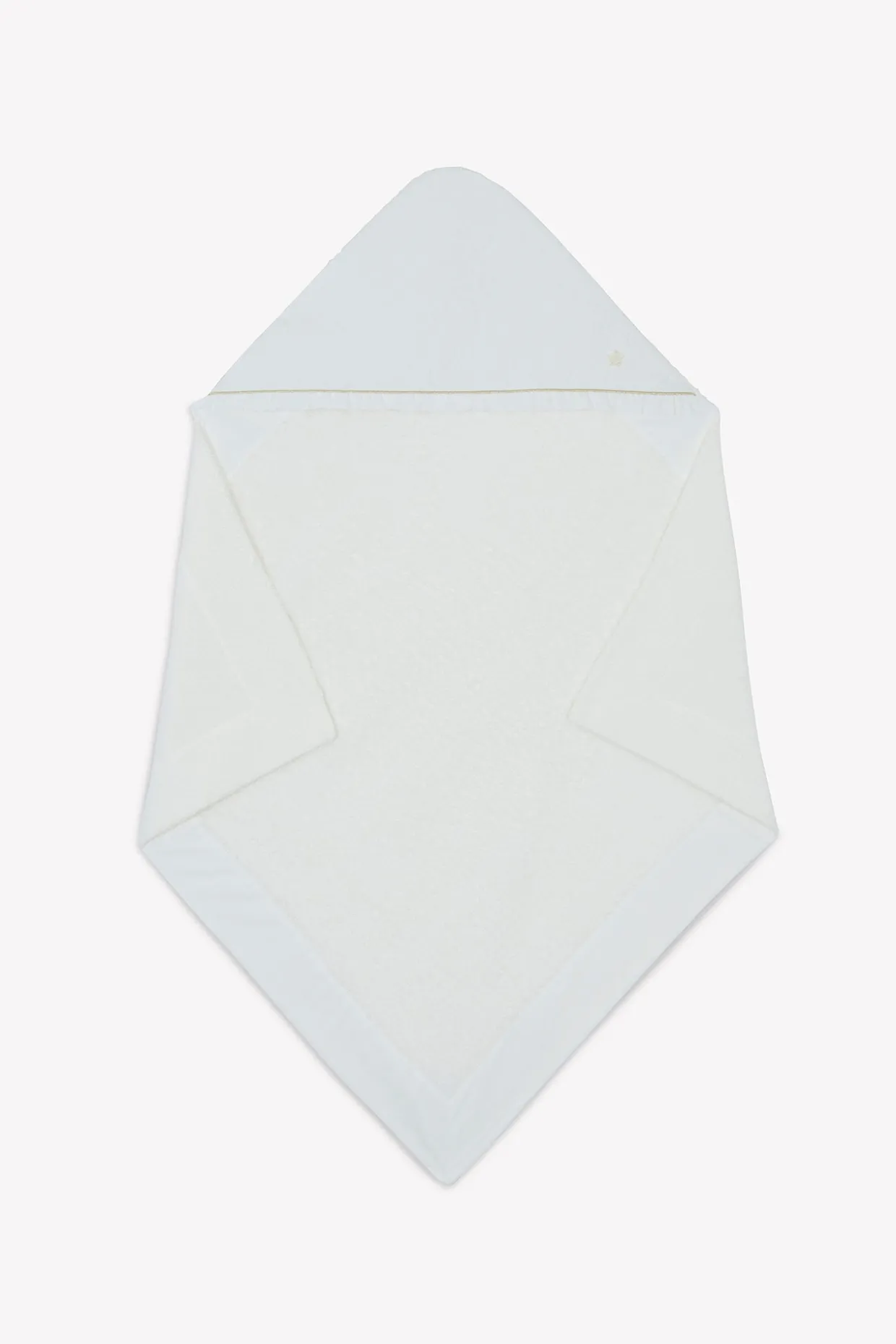 Cape de bain Délicatesse nacre, en percale de coton émerisée et éponge. Dimensions : 80 x 80 cm. La ligne Délicatesse : Le raffinement et l’élégance de cette ligne illuminent l’univers féérique de la petite fille. Plastron en percale brodée, fils d’or et signature nacrée réhaussent avec modernité les lignes épurées de cette collection. 100% coton. Fabriqué au Portugal. Dimensions : 70x70cm