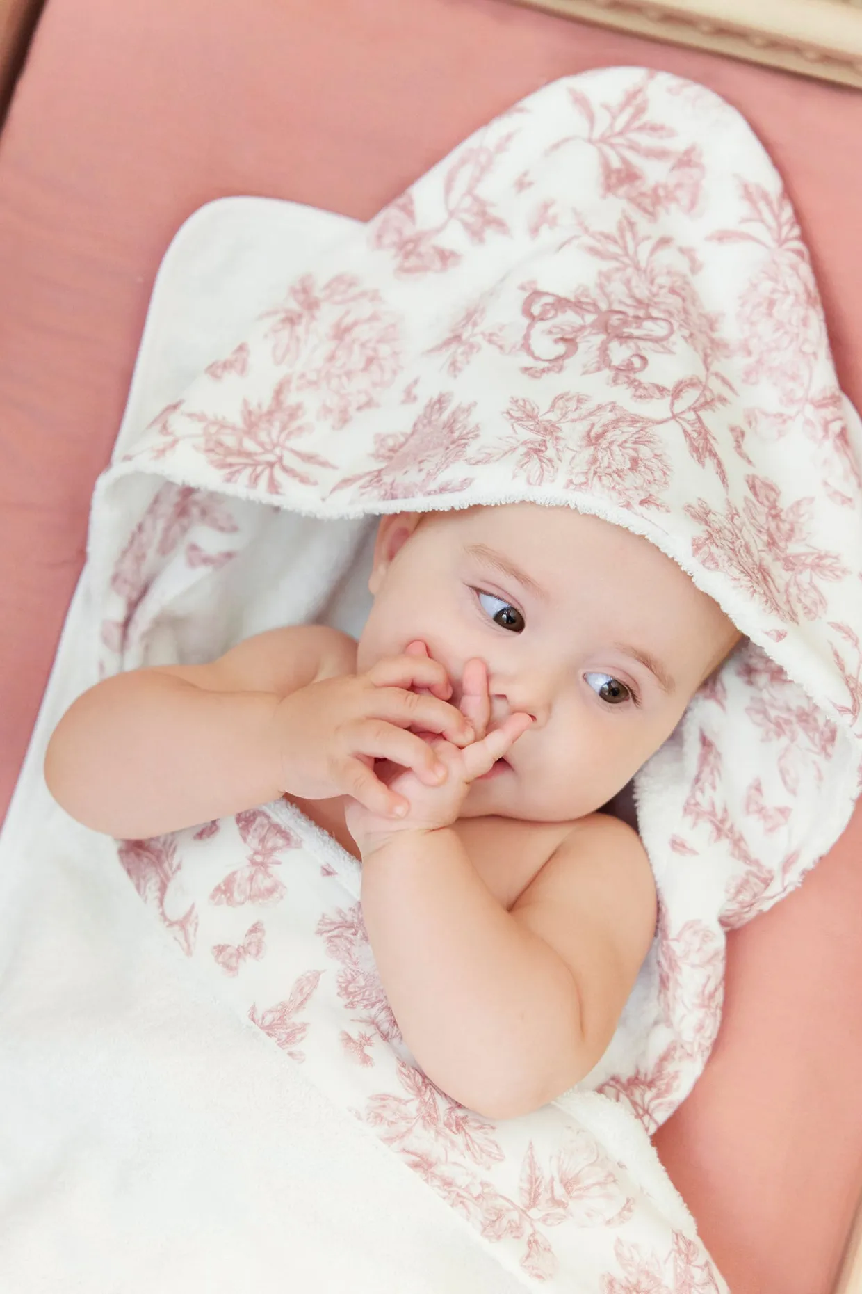 Cape de bain blanche bordée de l’imprimée inspiration Toile de Jouy dessiné par Tartine et Chocolat, en coton lange et éponge.Dimensions : 70 x 70 cm.