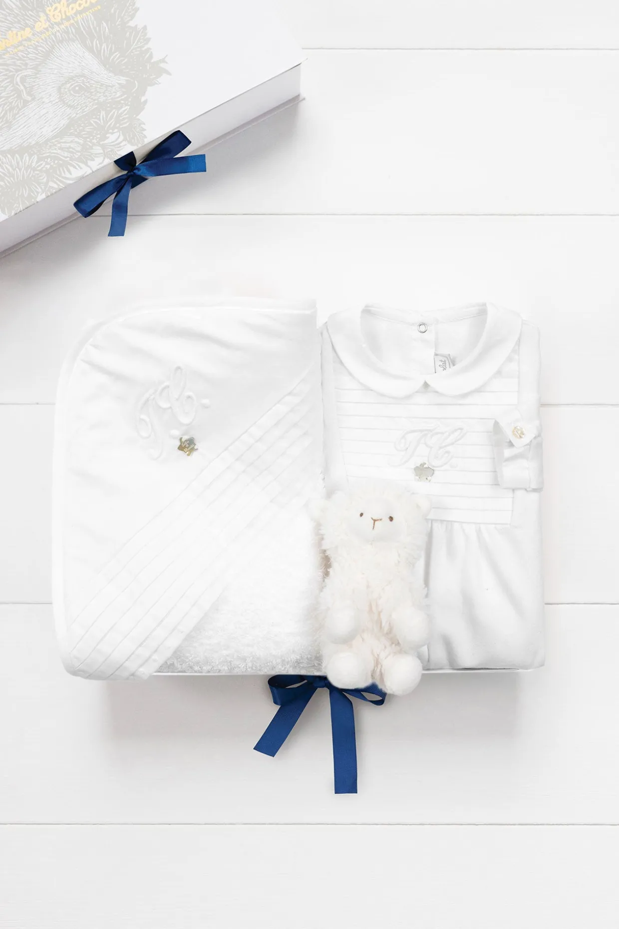 A glisser dans la valise de maternité ou pour offrir, ce coffret monogramme sera parfait pour la naissance de bébé. Etoiles effet nacre, plis religieux et broderies réhaussent avec délicatesse l’élégance et la pureté de la ligne monogramme. Discrète et chic, cette ligne pour fille ou garçon est un véritable cocon de blancheur. Le coffret se compose d’une cape de bain, d’un adorable pyjama et d’une petite peluche. On craque pour Edmon, le Mouton qui sera le premier compagnon de bébé. Un cadeau qui se transmettra de générations en générations et qui fera plaisir aux nouveaux parents !