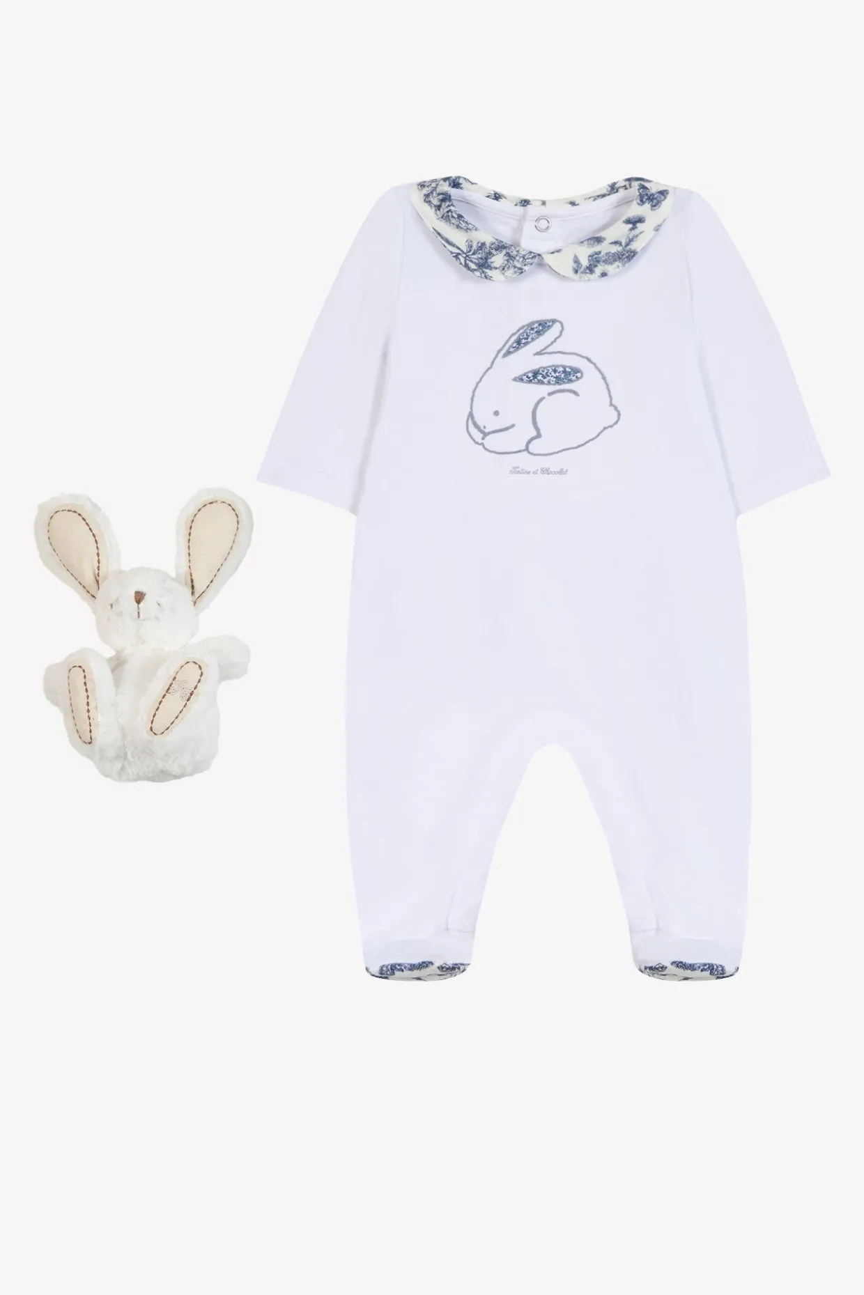 Un coffret délicat et poétique, pensé pour accompagner les tout premiers instants de bébé. Ce coffret naissance, idéal pour fille comme pour garçon, se compose d’un pyjama blanc orné d’un col inspiration Toile de Jouy bleu et d’une tendre illustration de lapin au centre, ainsi que d’un doudou lapin tout doux assorti. Un présent précieux, parfait pour célébrer une arrivée tout en douceur.
