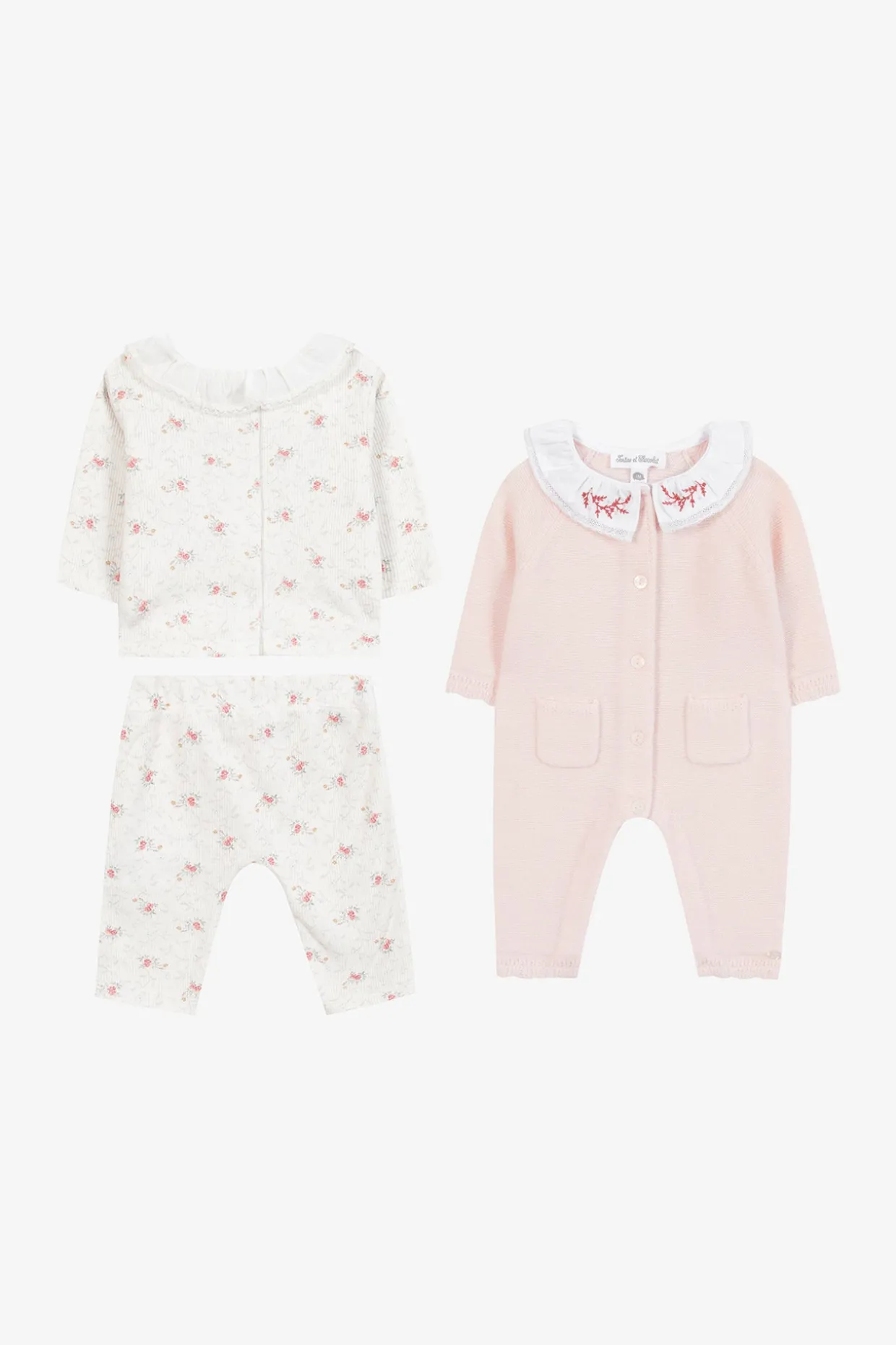 Un cocon de tendresse pour réchauffer bébé en hiver. Imaginé par Tartine et Chocolat, le Coffret Fleurie associe confort et raffinement avec des pièces aux détails délicats. Il se compose d’une combinaison longue en tricot de laine et cachemire rose pâle, sublimée par un col volanté orné d’une broderie florale, idéale pour envelopper bébé de douceur dès les premiers jours, et d’un ensemble en côte écru à l’imprimé floral délicat, composé d’un haut au col en dentelle raffinée et d’un pantalon assorti, pour un confort tendre et élégant.