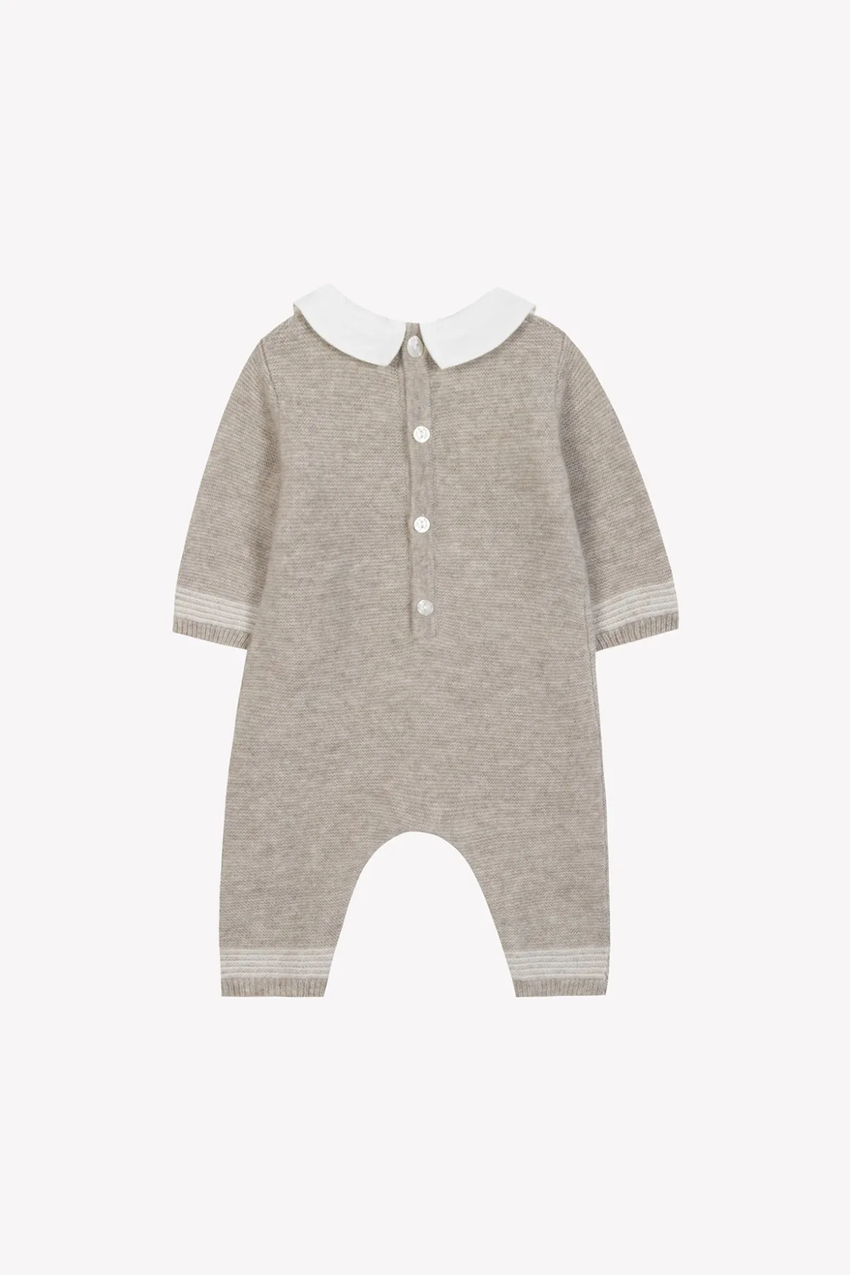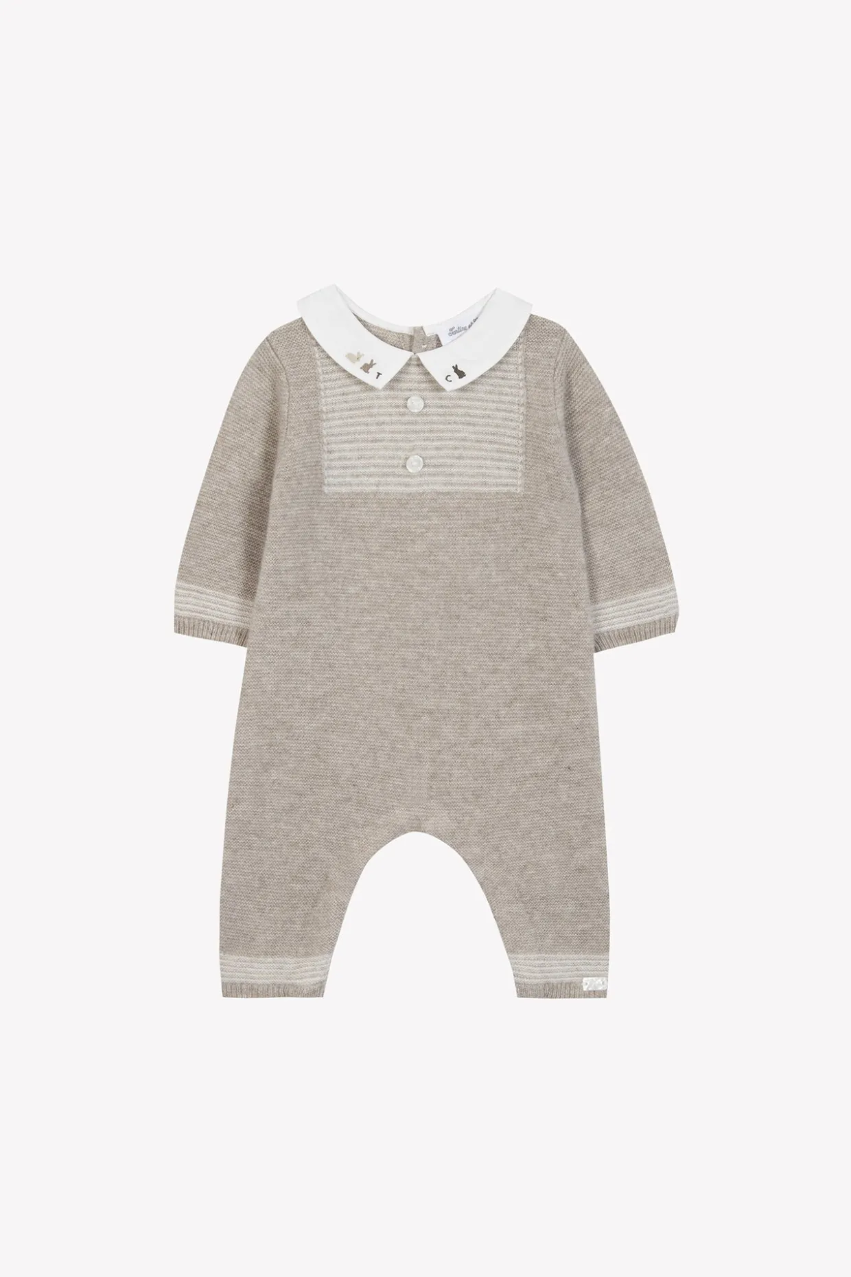 Cette combinaison longue pour naissance garçon, en coloris greige chiné, présente un col pointu orné d’une délicate broderie lapin ainsi que la signature TC brodée. Le smock en tricotage ajoute une touche raffinée et élégante à ce modèle, parfait pour les premiers instants avec douceur et style.