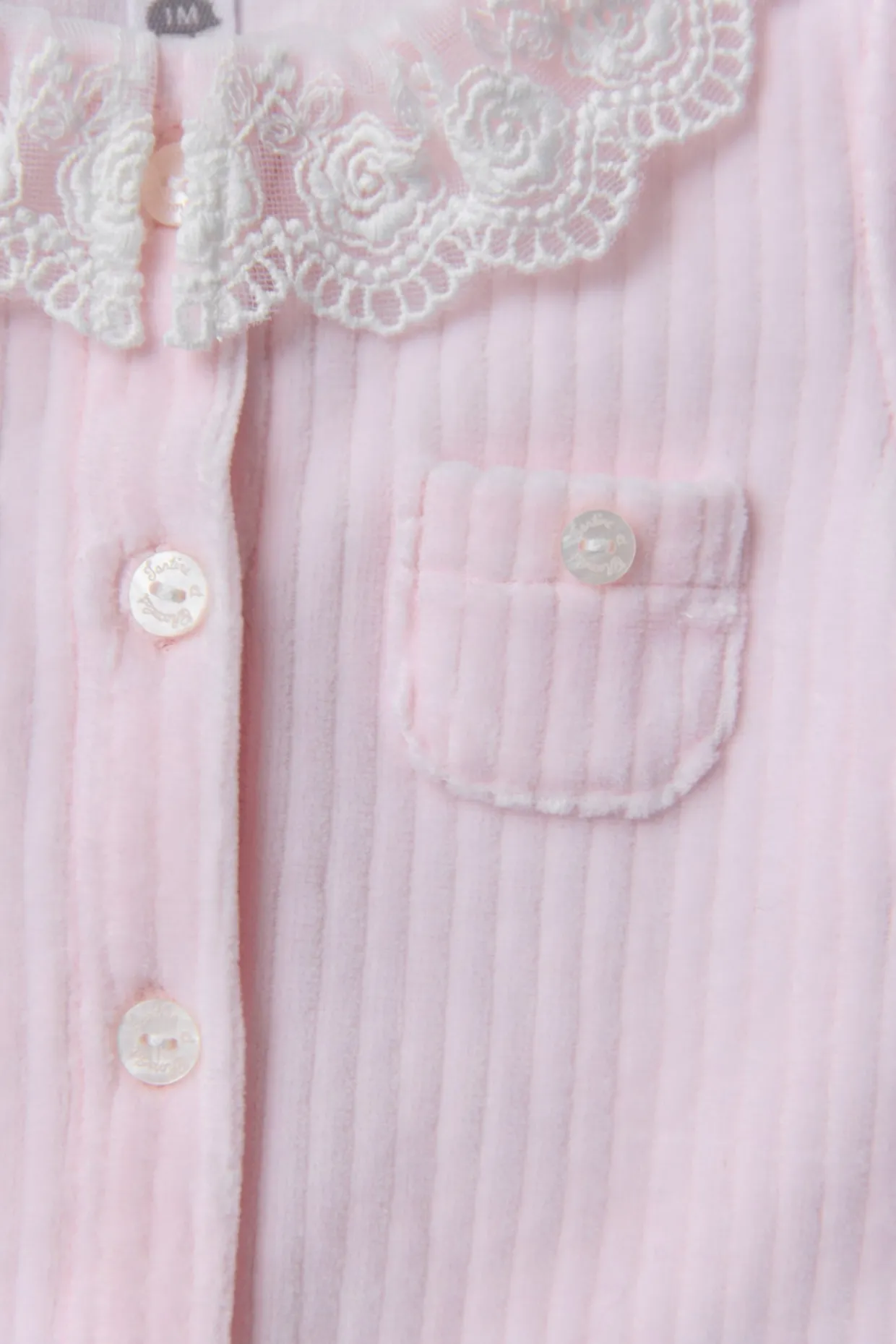 Cette combinaison longue pour naissance fille, en coloris rose pâle, est confectionnée en velours doux. Elle se distingue par son col volanté en dentelle, apportant une touche délicate et élégante, parfaite pour les premiers instants de bébé.