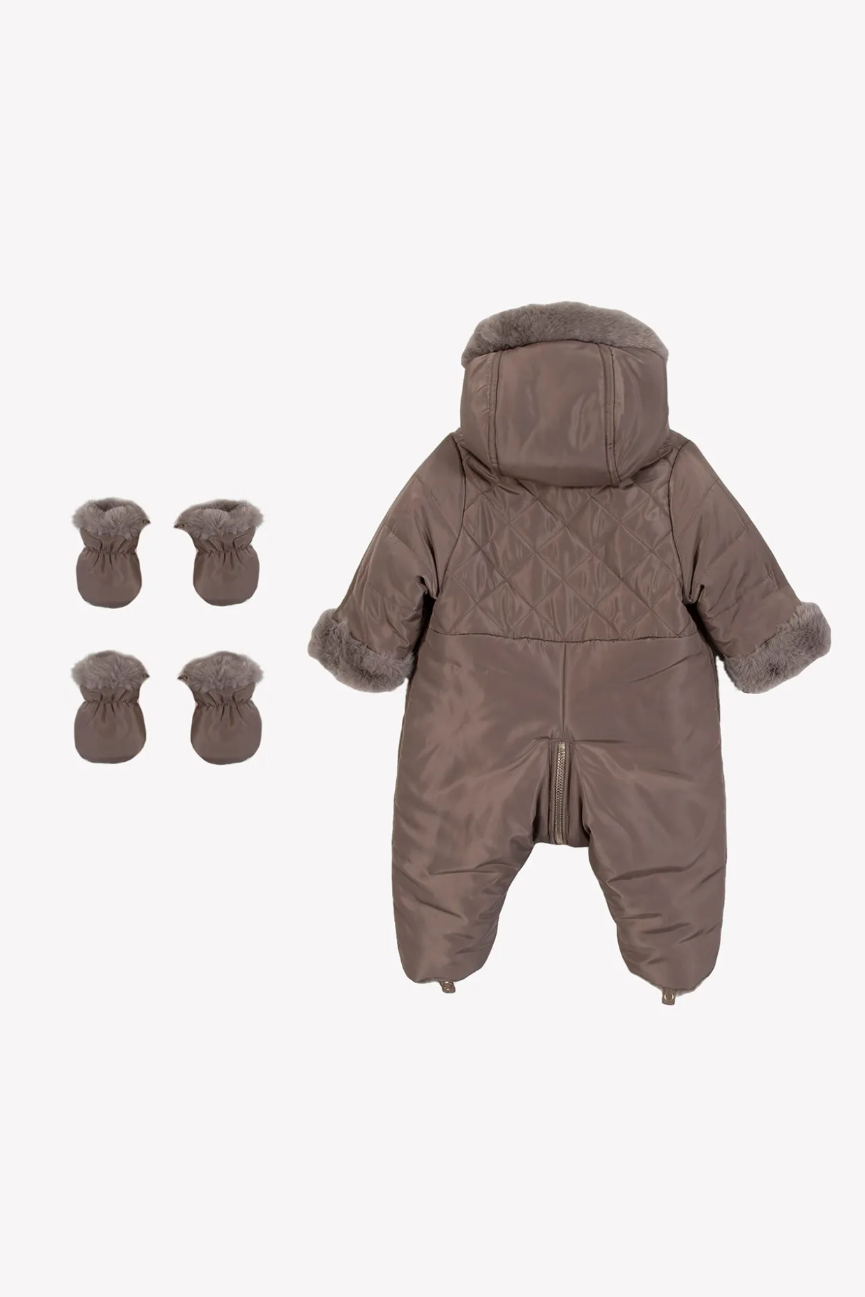 Ce pilote taupe pour bébé fille conjugue praticité et douceur grâce à sa version réversible. Le côté déperlant protège des intempéries, tandis que le revers en imitation fourrure offre un cocon chaleureux. Gants et chaussons intégrés complètent cette pièce pensée pour les premières sorties en hiver. Les chaussons ne sont pas inclus pour les tailles 18M et 2A.