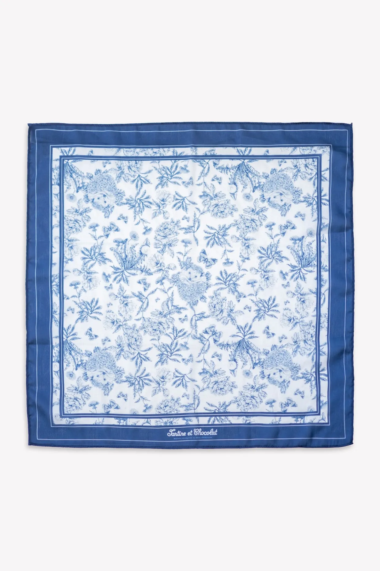 Ce joli foulard bleu Tartine et Chocolat, orné d’un délicat motif Toile de Jouy, évoque toute la douceur et le raffinement de la maison. Sa teinte tendre et intemporelle s’harmonise avec élégance à toutes les tenues, tandis que son format discret en fait un accessoire facile à nouer selon les envies : autour du cou, dans les cheveux ou en détail chic sur un sac. Un essentiel plein de charme pour rehausser chaque silhouette d’une touche poétique. Dimensions: 50x50cm.