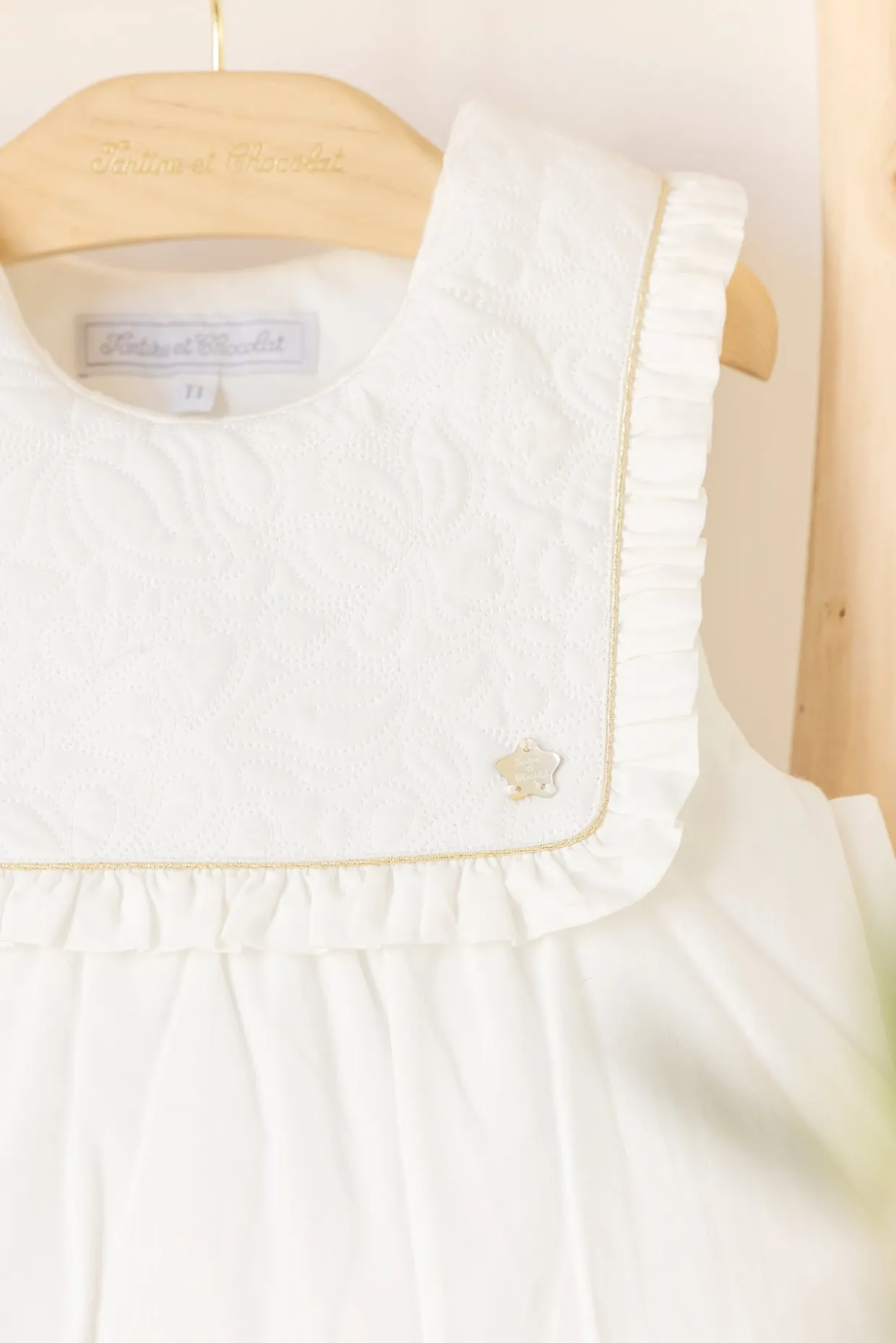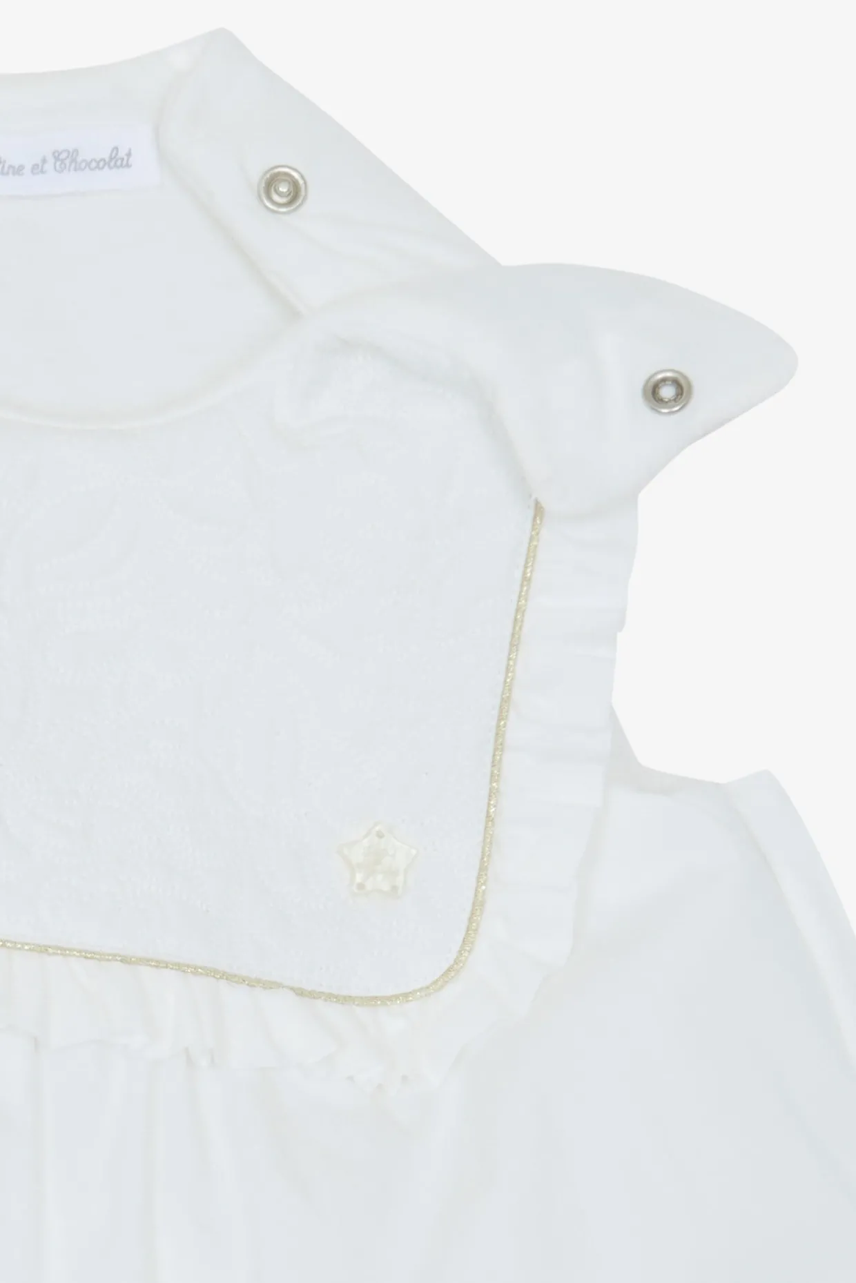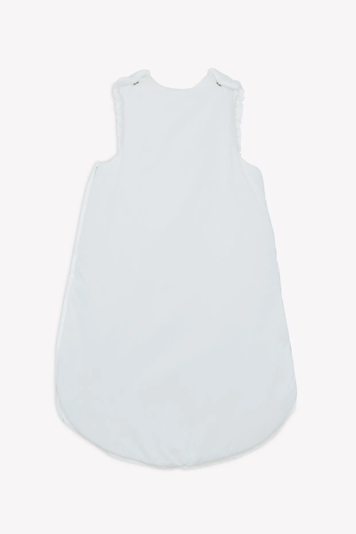 Gigoteuse Délicatesse nacre en percale de coton émerisé et broderies. Ouverture zippée sur le côté. La ligne Délicatesse : Le raffinement et l’élégance de cette ligne illuminent l’univers féérique de la petite fille. Plastron en percale brodée, fils d’or et signature nacrée réhaussent avec modernité les lignes épurées de cette collection. Nous préconisons une utilisation de nos gigoteuses dans une température de chambre entre 19 et 22 degrés.Longueur 70 cm : 3 – 9 mois.Gigoteuse TOG 2. Fabriqué au Portugal.