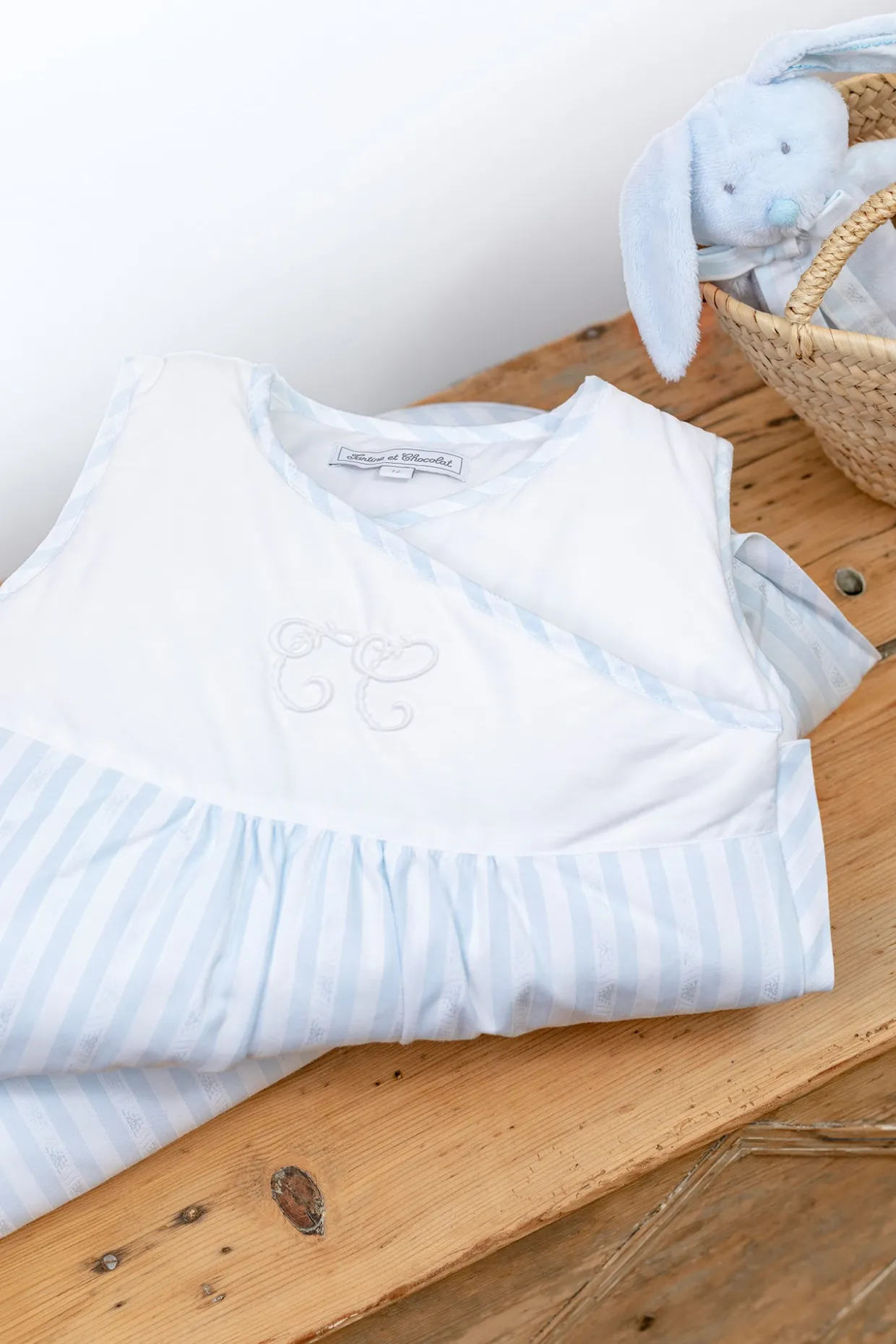 Gigoteuse Garda bleu ciel, en popeline et coton piqué et fil à fil. Doublure en jersey. T2 – longueur 90 cm : 1 – 2 ans. La ligne Garda : une ligne emblématique qui symbolise tout l’esprit Tartine et Chocolat. Des rayures chics et élégantes, associées aux couleurs pastel de l’enfance, un écusson finement brodé, des tissus doux et tendres. Gigoteuse TOG 2. Fabriqué au Portugal.