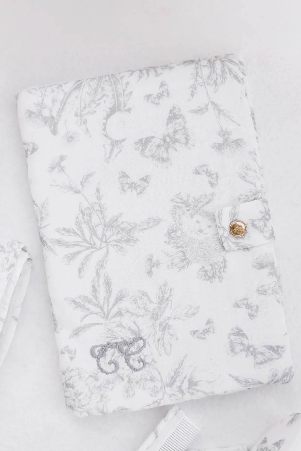 Housse de carnet de santé imprimé inspiration Toile de Jouy gris, dessinée par Tartine et Chocolat. Élégante et pratique, elle protège le carnet de santé de votre enfant tout en ajoutant une touche de charme classique. Dimensions : 16 x 23 cm.