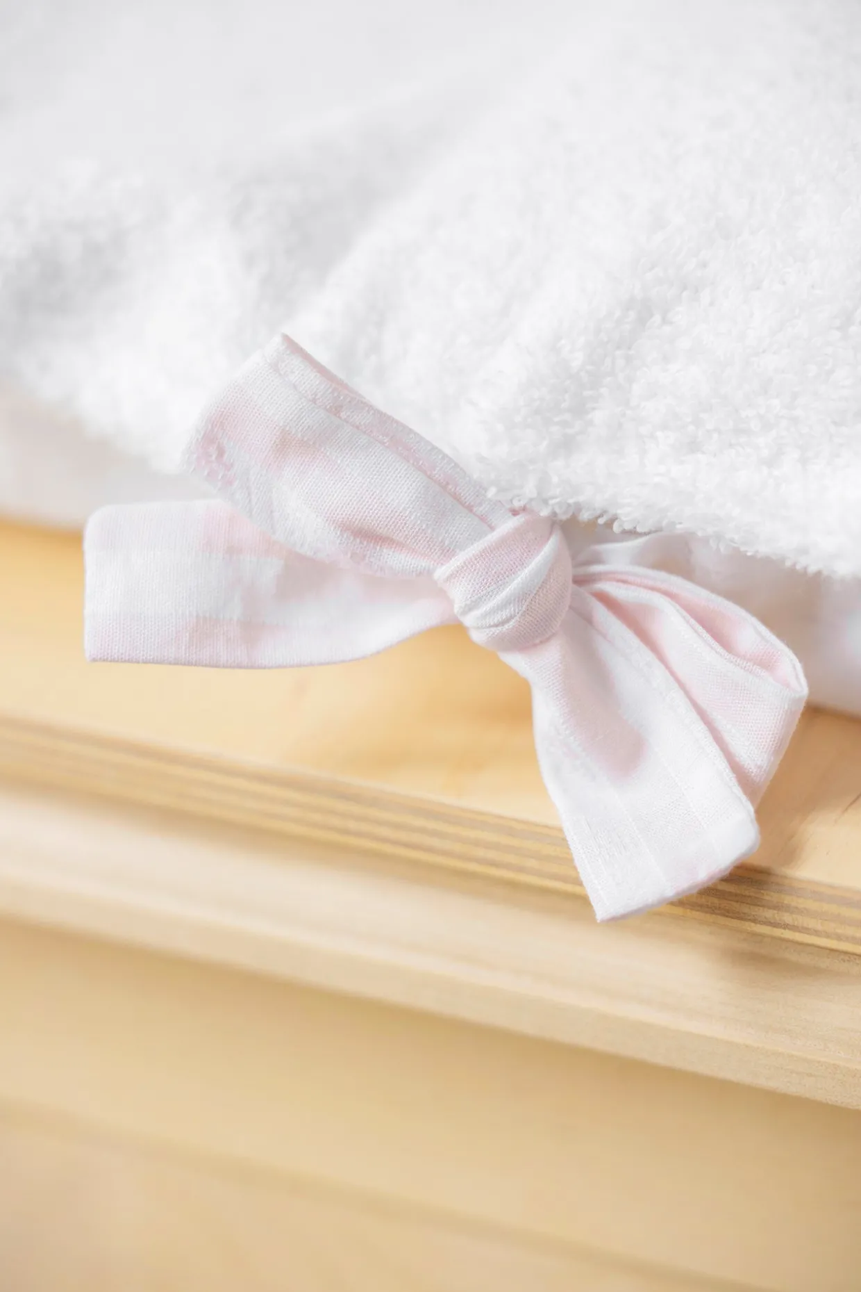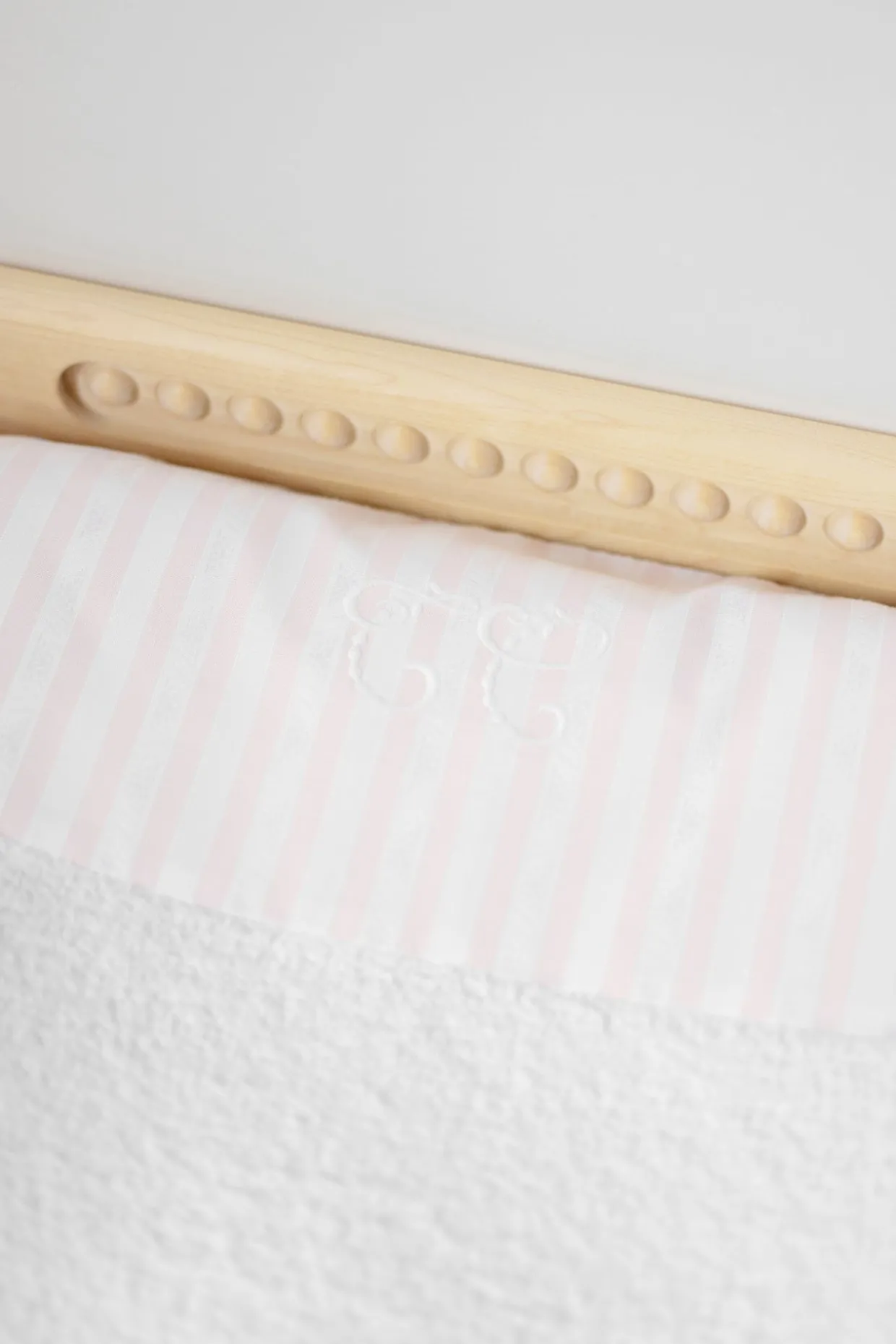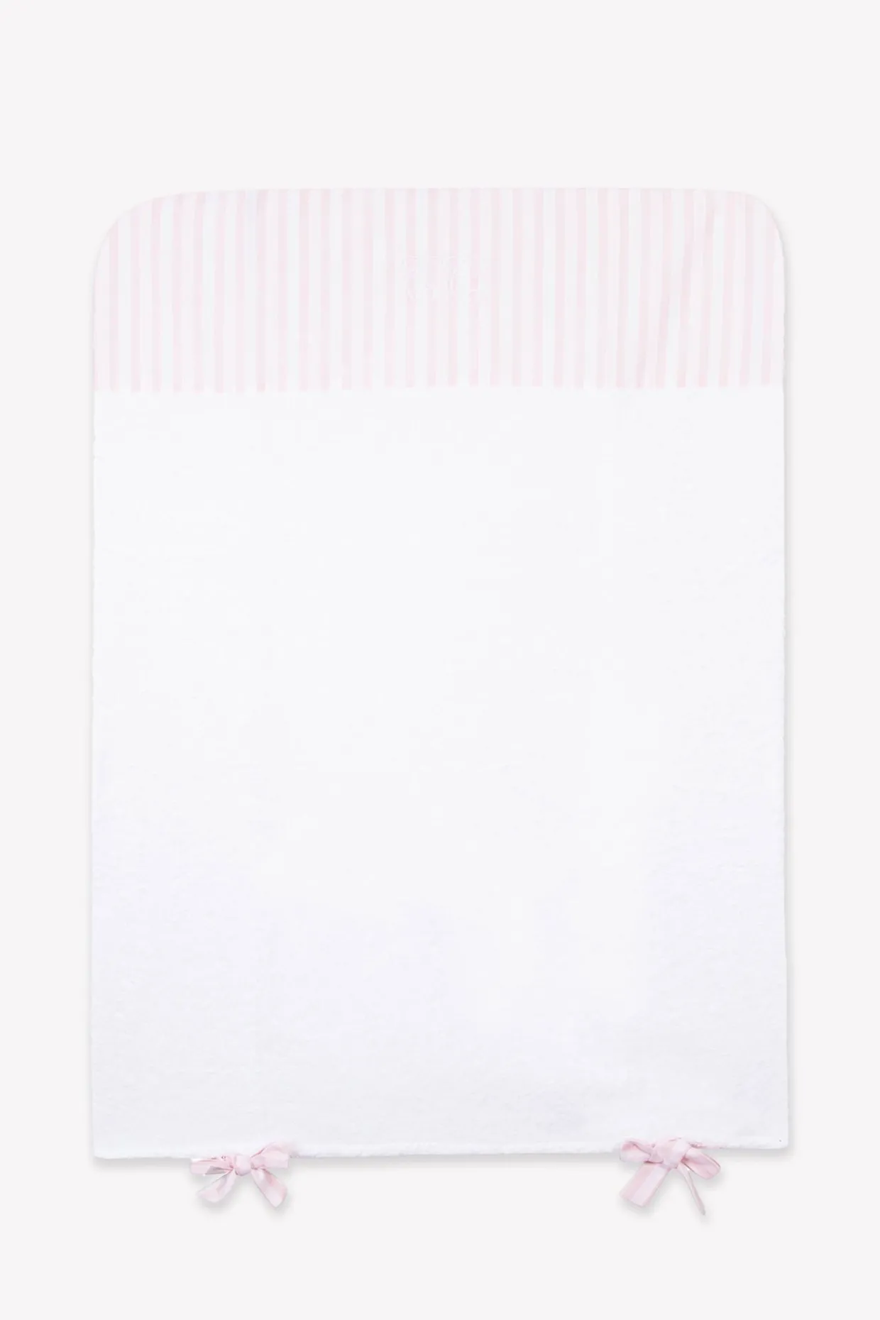 Housse de matelas à langer Garda rose pâle, en popeline de coton et éponge. Ouverture par noeuds délicats. Dimensions : 55 x 75 cm. A associer à notre matelas à langer T179001 et le protège matelas T279101. La ligne Garda : une ligne emblématique qui symbolise tout l’esprit Tartine et Chocolat. Des rayures chics et élégantes, associées aux couleurs pastel de l’enfance, un écusson finement brodé, des tissus doux et tendres. Fabriqué au Portugal.
