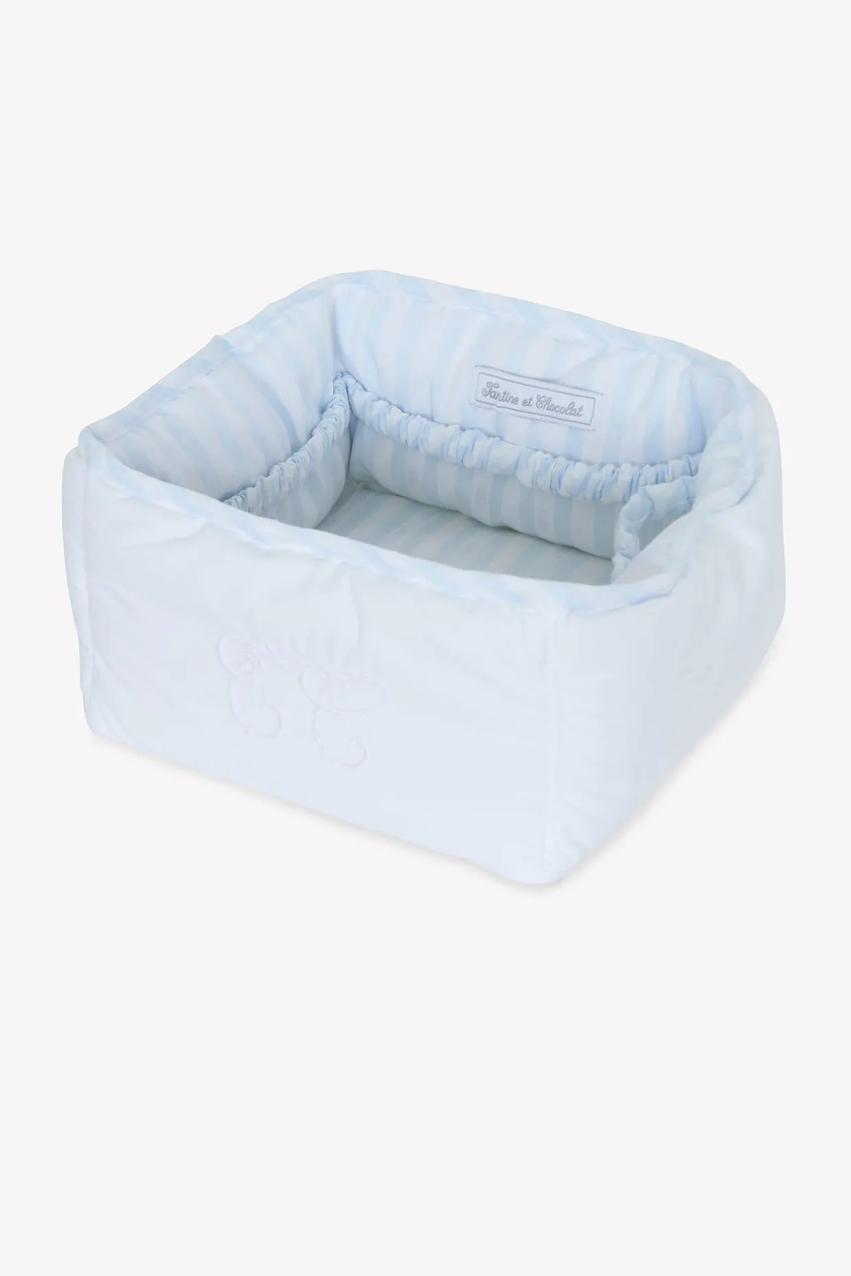 Panière Garda bleu ciel, en popeline et coton piqué et fil à fil. Compartiments élastiqués. Dimensions : 23 x 23 cm. La ligne Garda : une ligne emblématique qui symbolise tout l’esprit Tartine et Chocolat. Des rayures chics et élégantes, associées aux couleurs pastel de l’enfance, un écusson finement brodé, des tissus doux et tendres. Fabriqué au Portugal.