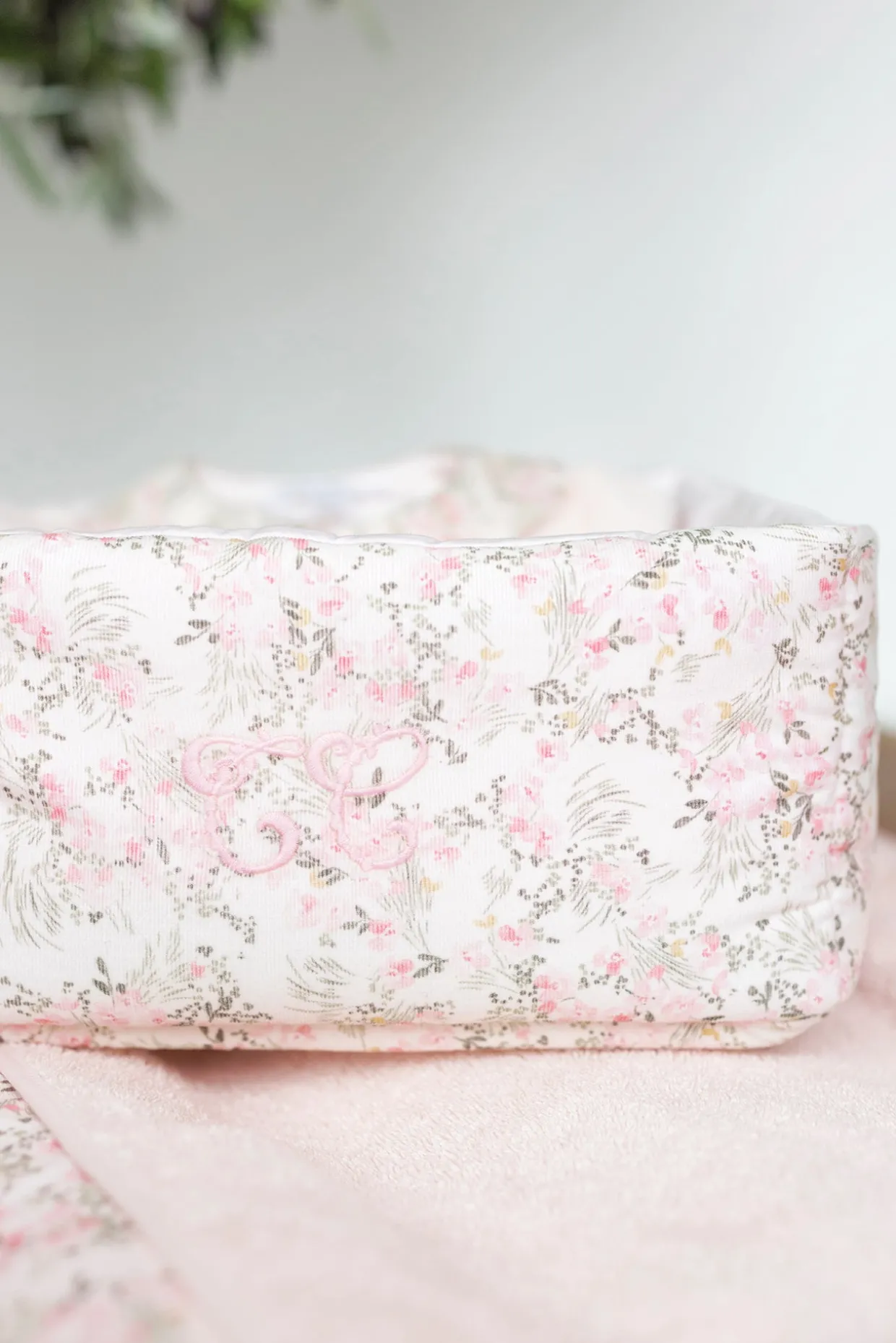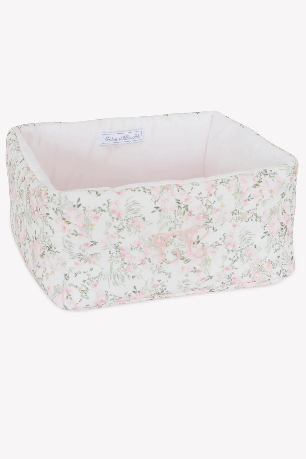 Panière en imprimé fleuri inspiré d’un Jardin Hivernal pour ranger tous les essentiels de bébés sur la table à langer. Dimensions : 25 x 25 x 13 cm.
