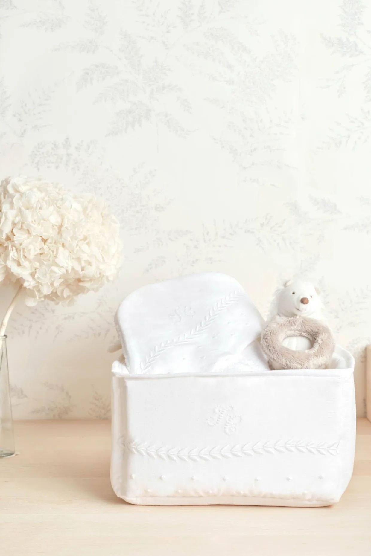 La panière en lin et coton blanc blanc aux broderies anciennes et délicates ton sur ton. Dimensions : 25x25x13 cm. L’élégance revisitée pour cette ligne de puériculture pure et raffinée. Fabriqué au Portugal. Un lin doux et brodé en ton sur ton pour un rendu tout en délicatesse.
