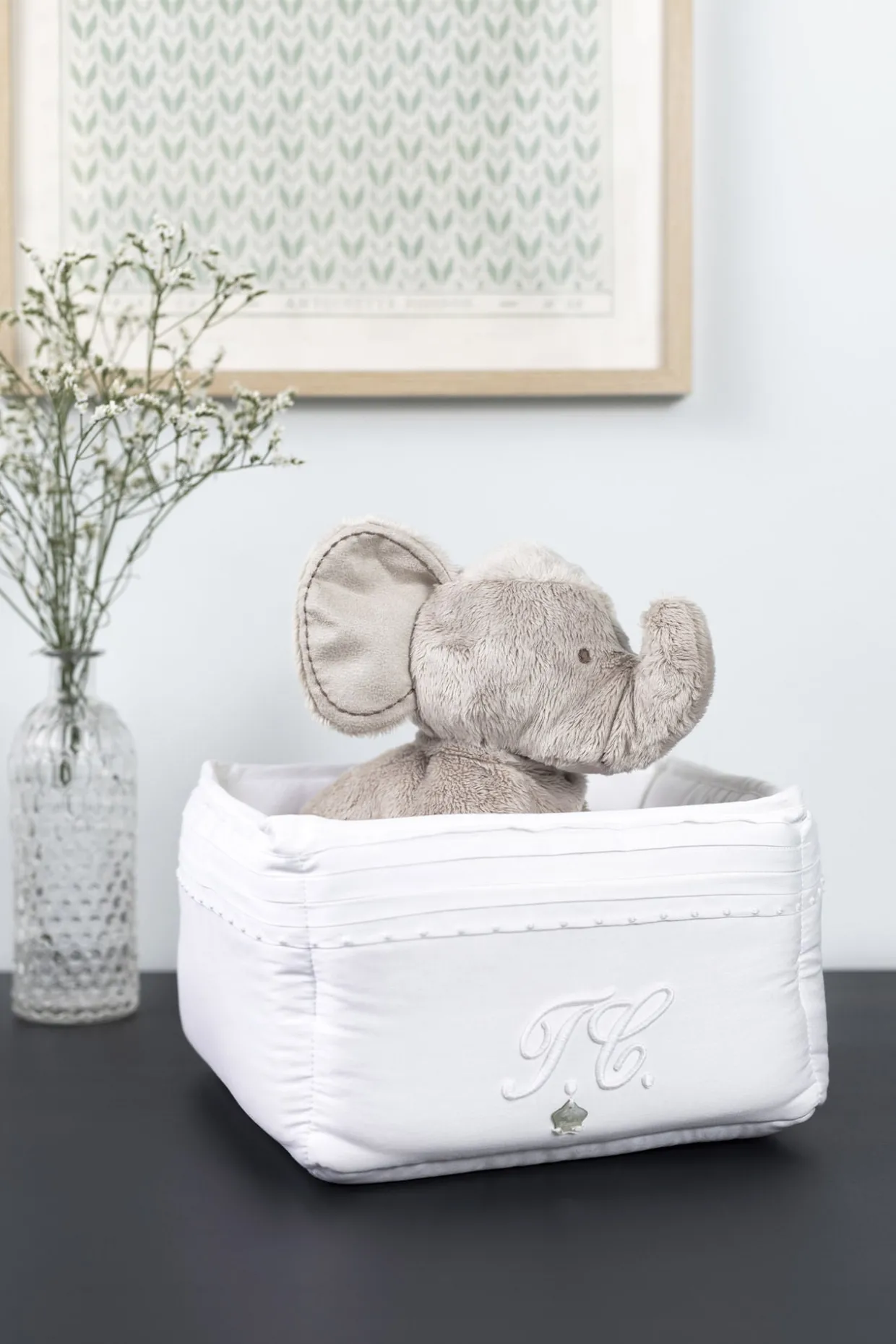 Panière Monogramme blanche, en popeline de coton piqué et fil à fil. Compartiments élastiqués. Dimensions : 25 x 25 cm. La ligne Monogramme : Etoiles de nacre, plis religieux et broderies réhaussent avec délicatesse l’élégance et la pureté de cette ligne. Discret et chic, cette ligne pour fille ou garçon est un véritable cocon de blancheur. Fabriqué au Portugal