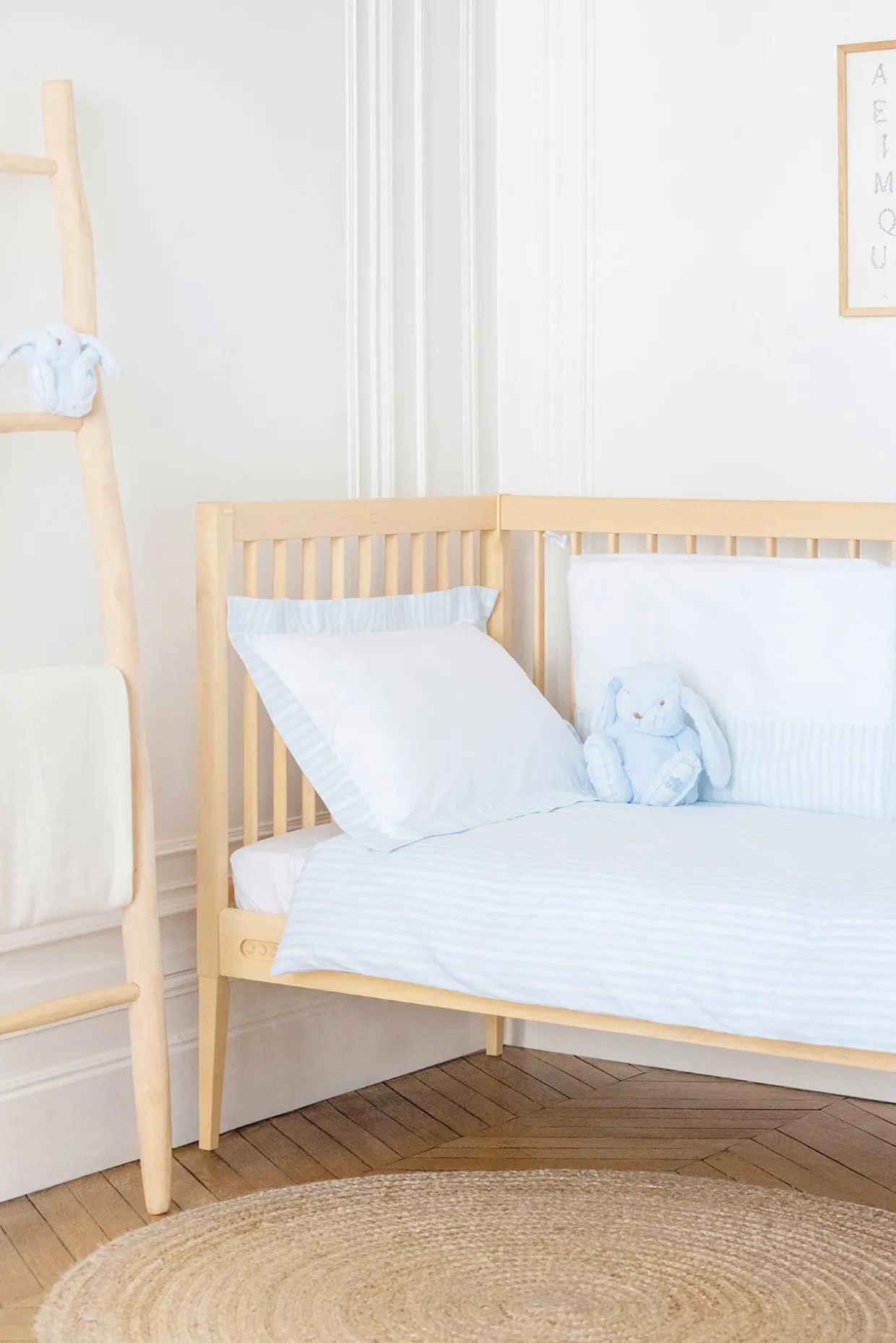 Parure de lit Garda bleu ciel composée d’une housse de couette et d’une taie d’oreiller en popeline de coton, piqué et fil à fil. Dimensions housse de couette : 140 x 90 cm. Dimensions taie d’oreiller : 47 x 66 cm. La ligne Garda : une ligne emblématique qui symbolise tout l’esprit Tartine et Chocolat. Des rayures chics et élégantes, associées aux couleurs pastel de l’enfance, un écusson finement brodé, des tissus doux et tendres. Fabriqué au Portugal