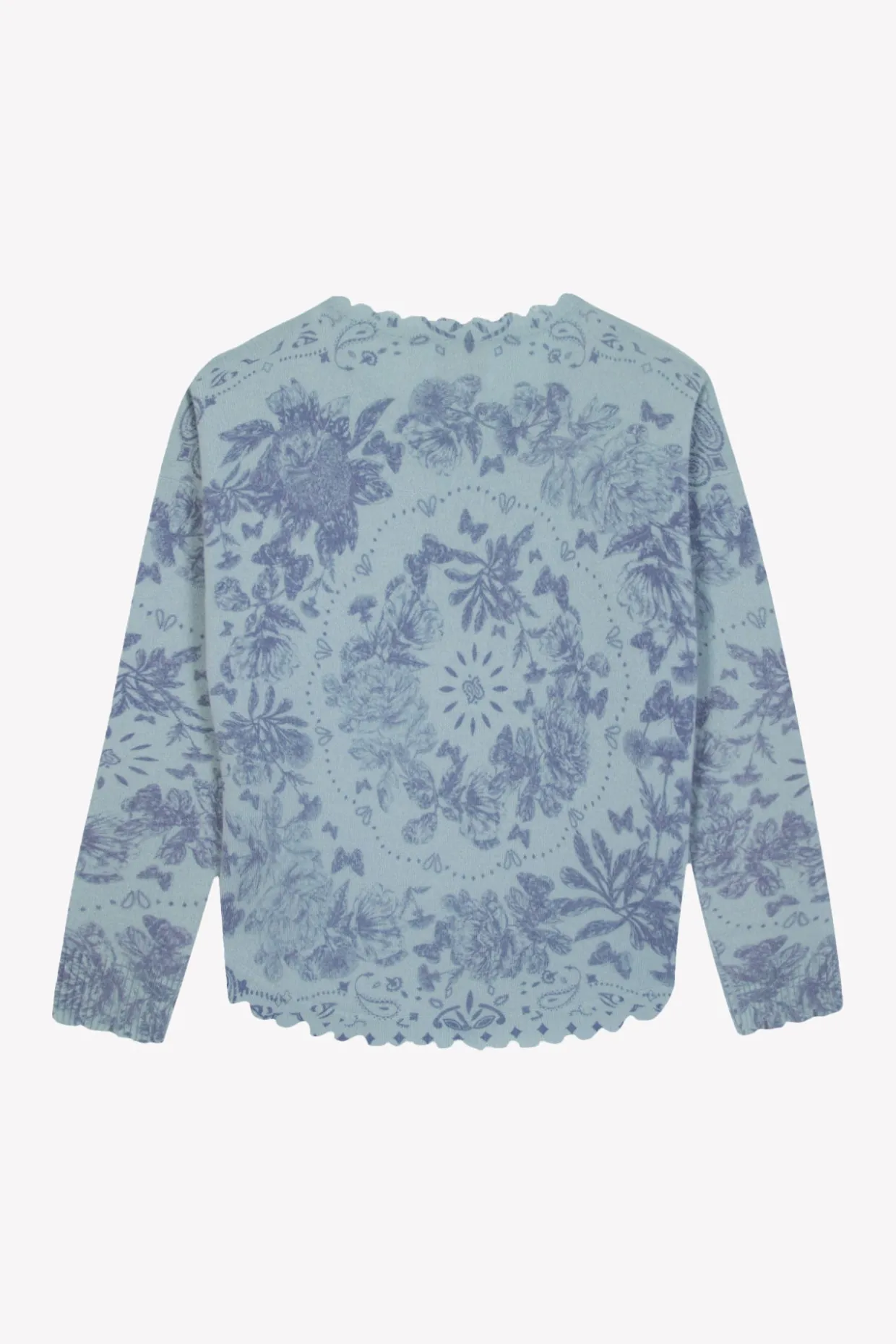 Une collaboration qui allie douceur et élégance ! Tartine et Chocolat s’associe à Kujten pour une collection en cachemire d’exception. Ce pull femme en cachemire bleu, orné d’un imprimé délicat, présente des finitions découpées au bout des manches, du col et du bas, ajoutant une touche unique à cette pièce. Sa matière douce en fait un indispensable pour allier confort et sophistication.