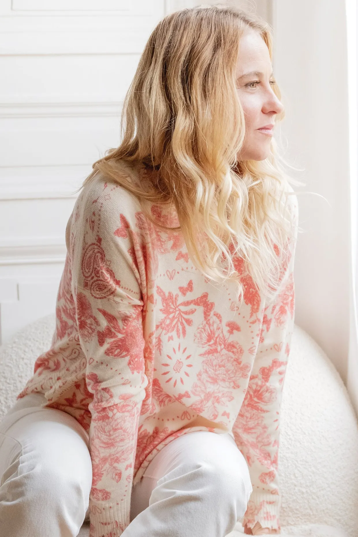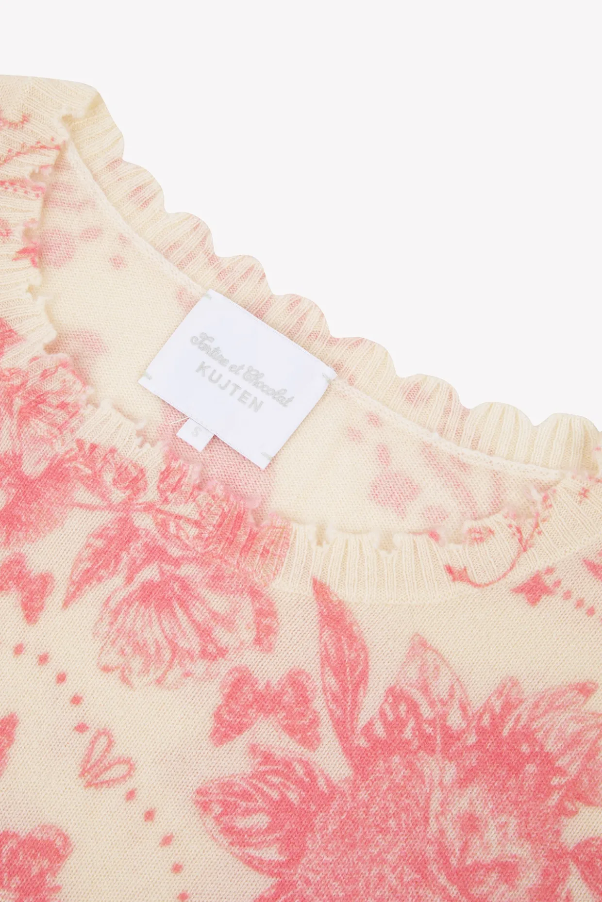 Une collaboration qui allie douceur et élégance ! Tartine et Chocolat s’associe à Kujten pour une collection en cachemire d’exception. Ce pull femme en cachemire rose, orné d’un imprimé délicat, présente des finitions découpées au bout des manches, du col et du bas, ajoutant une touche unique à cette pièce. Sa matière douce en fait un indispensable pour allier confort et sophistication.