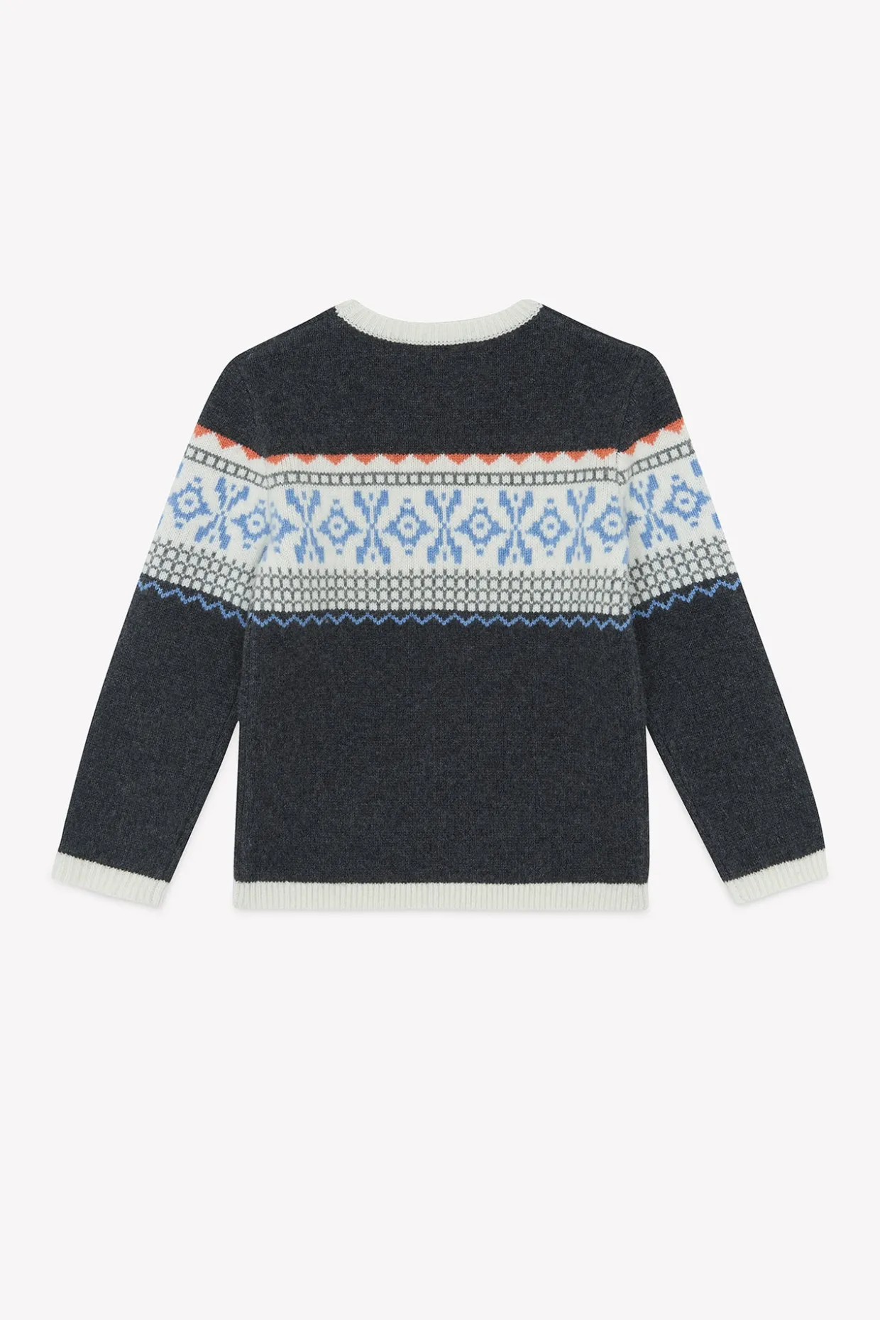 Ce pull pour junior garçon, en coloris gris foncé chiné, se distingue par son motif jacquard sur le devant, apportant une touche graphique et chaleureuse à son look. Confectionné en laine douce, il est parfait pour les journées fraîches. Un essentiel confortable et stylé, idéal pour compléter une tenue avec élégance et confort.