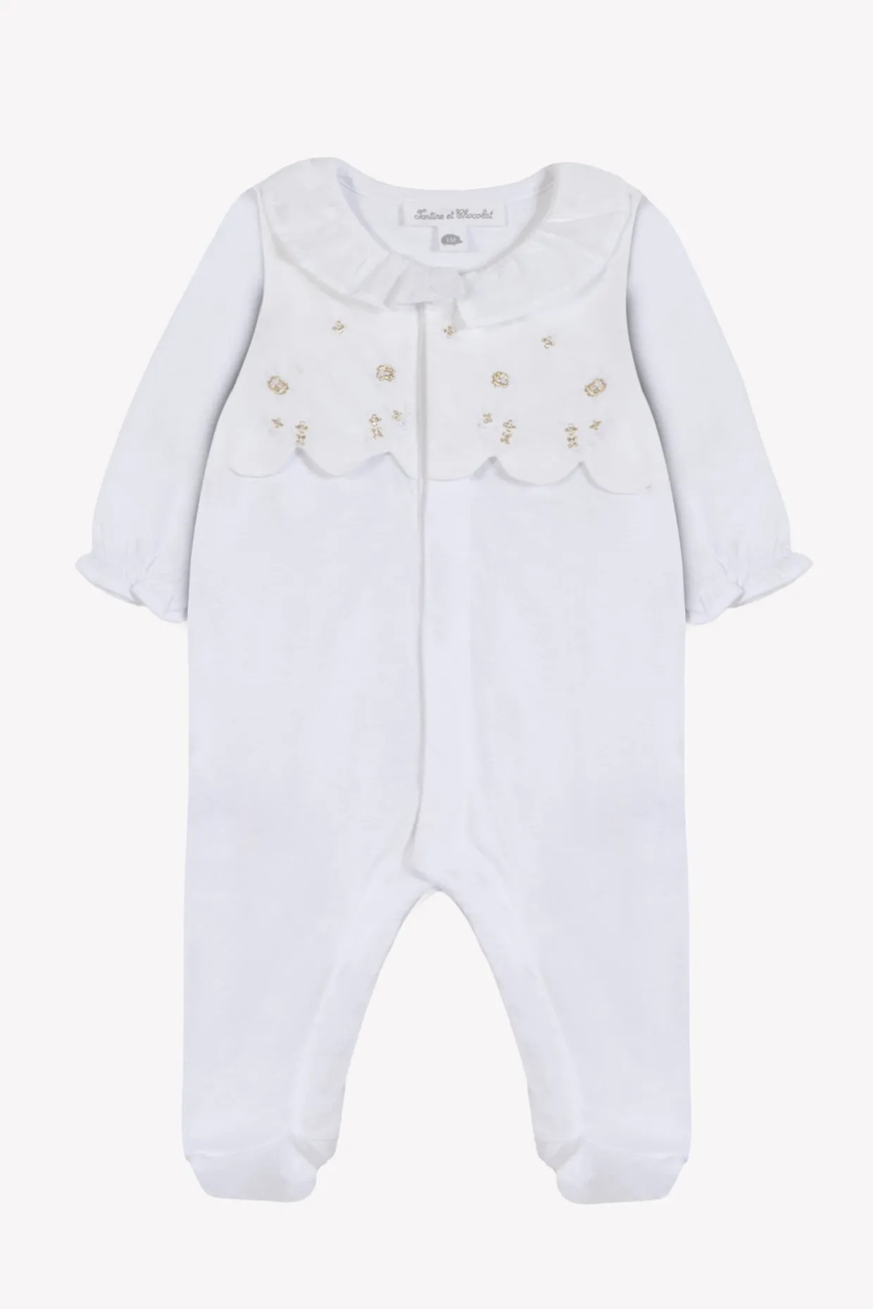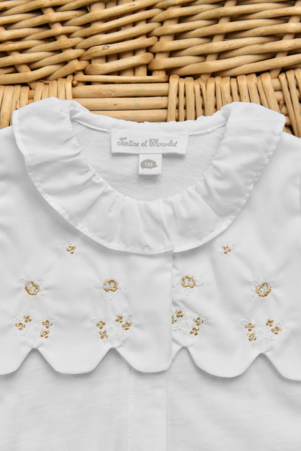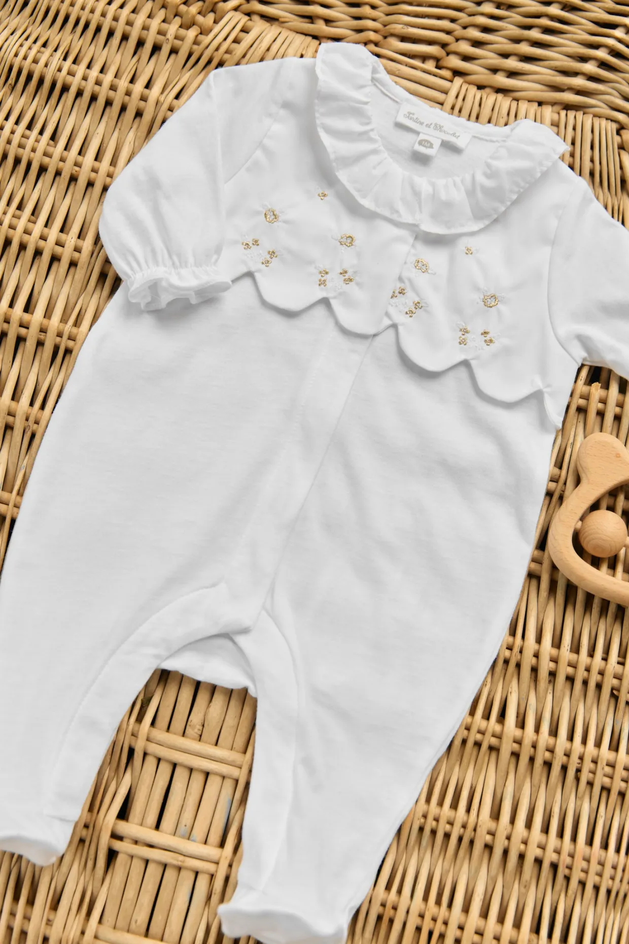 Ce pyjama blanc, pensé pour les petites filles dès la naissance, charme par son raffinement délicat. Son col volanté, rehaussé de détails dorés, apporte une touche précieuse, tandis que les manches légèrement resserrées au bout offrent confort et douceur. Un modèle poétique pour accompagner les premiers rêves.