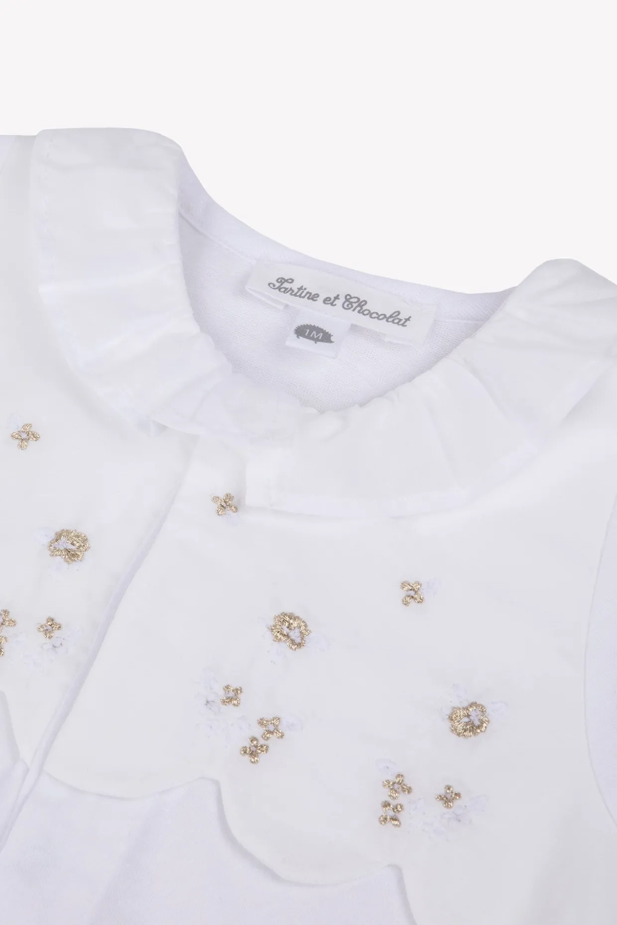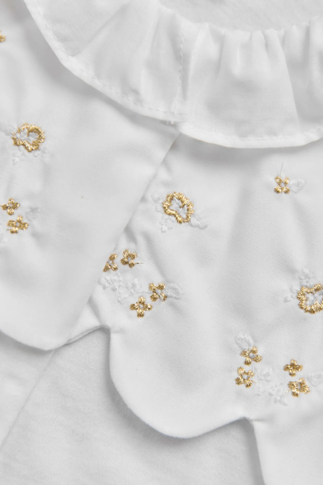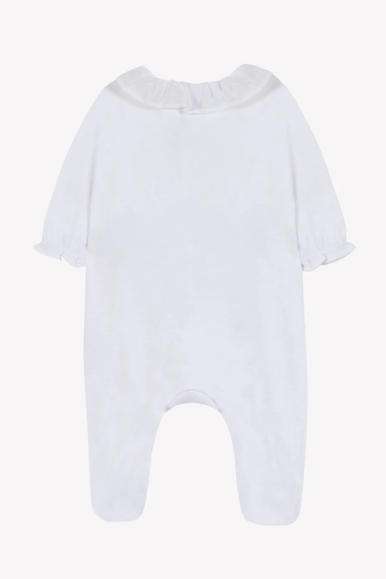 Ce pyjama blanc, pensé pour les petites filles dès la naissance, charme par son raffinement délicat. Son col volanté, rehaussé de détails dorés, apporte une touche précieuse, tandis que les manches légèrement resserrées au bout offrent confort et douceur. Un modèle poétique pour accompagner les premiers rêves.