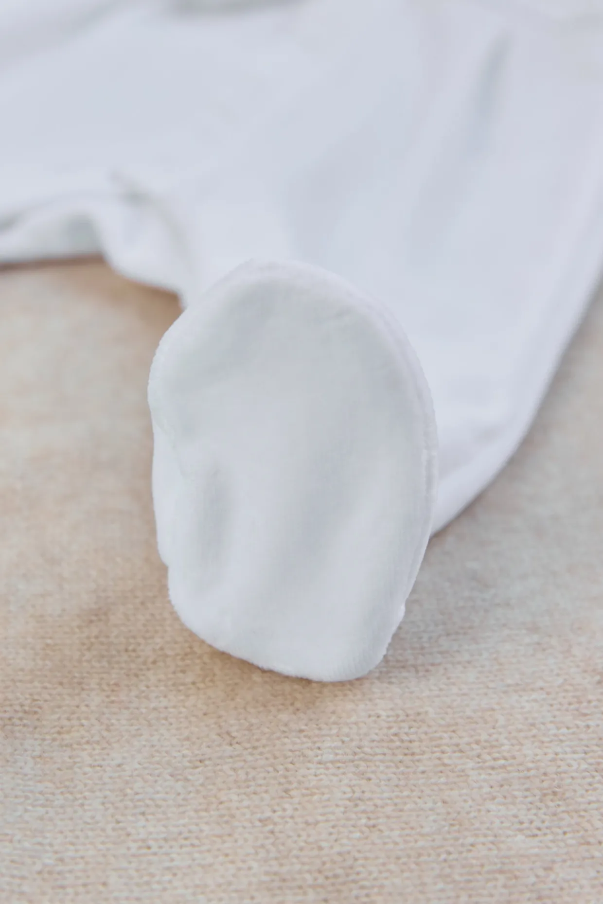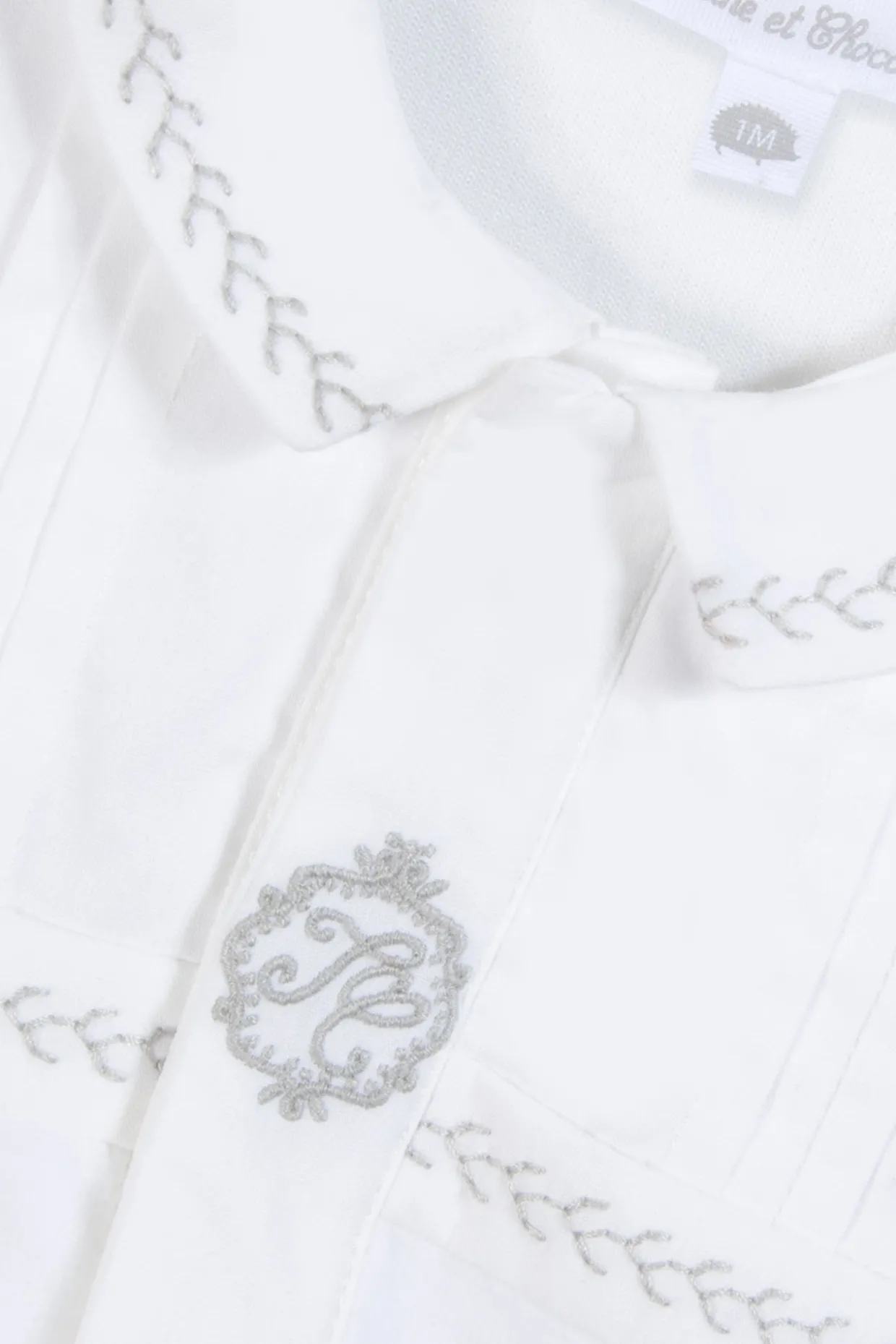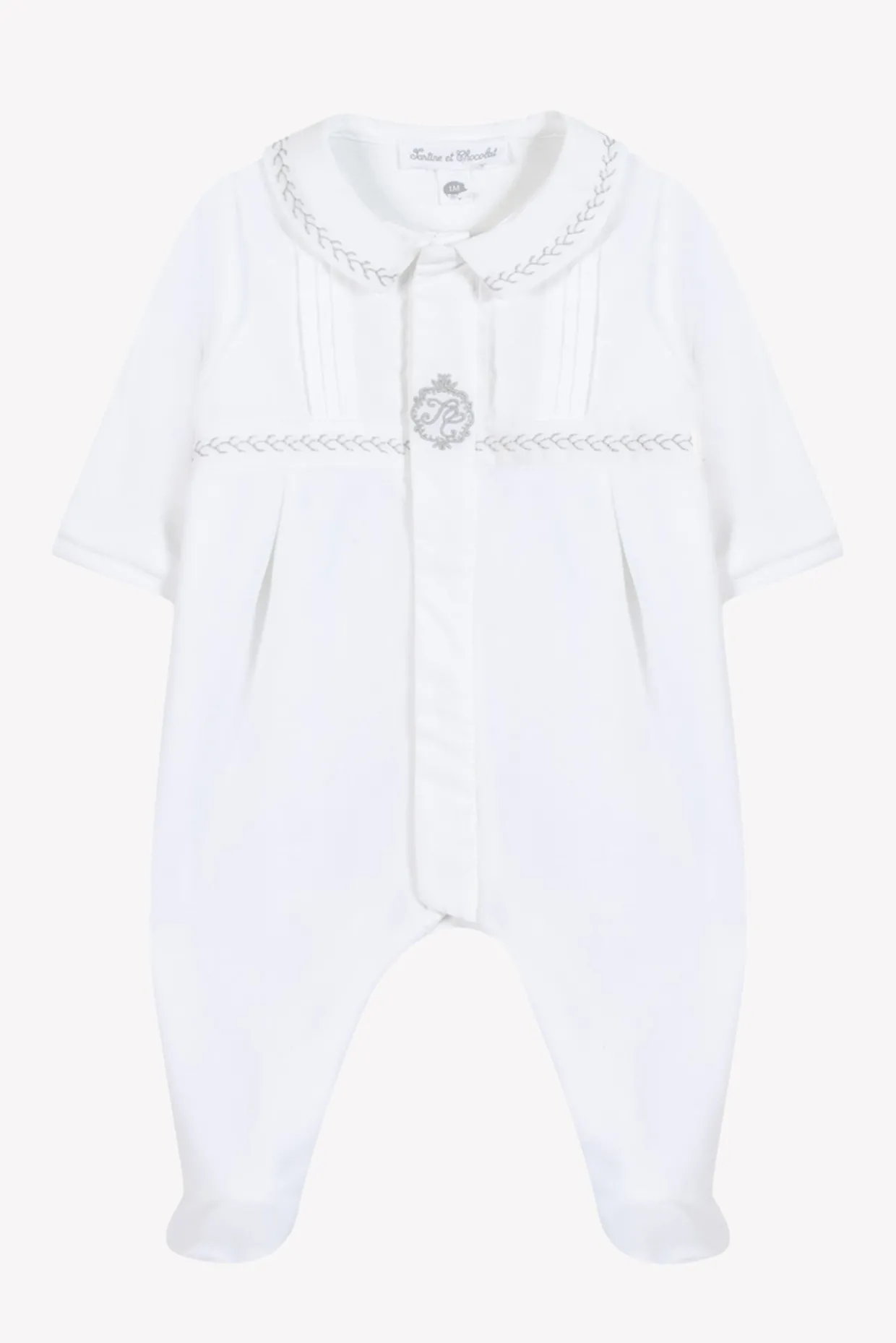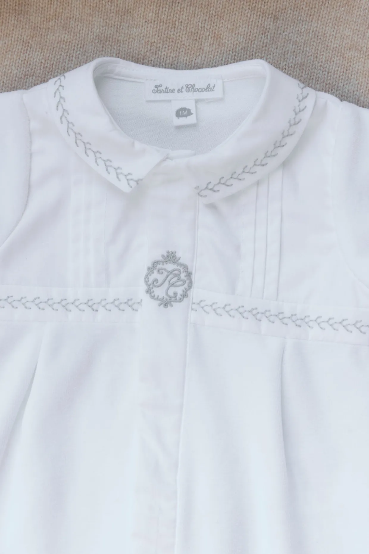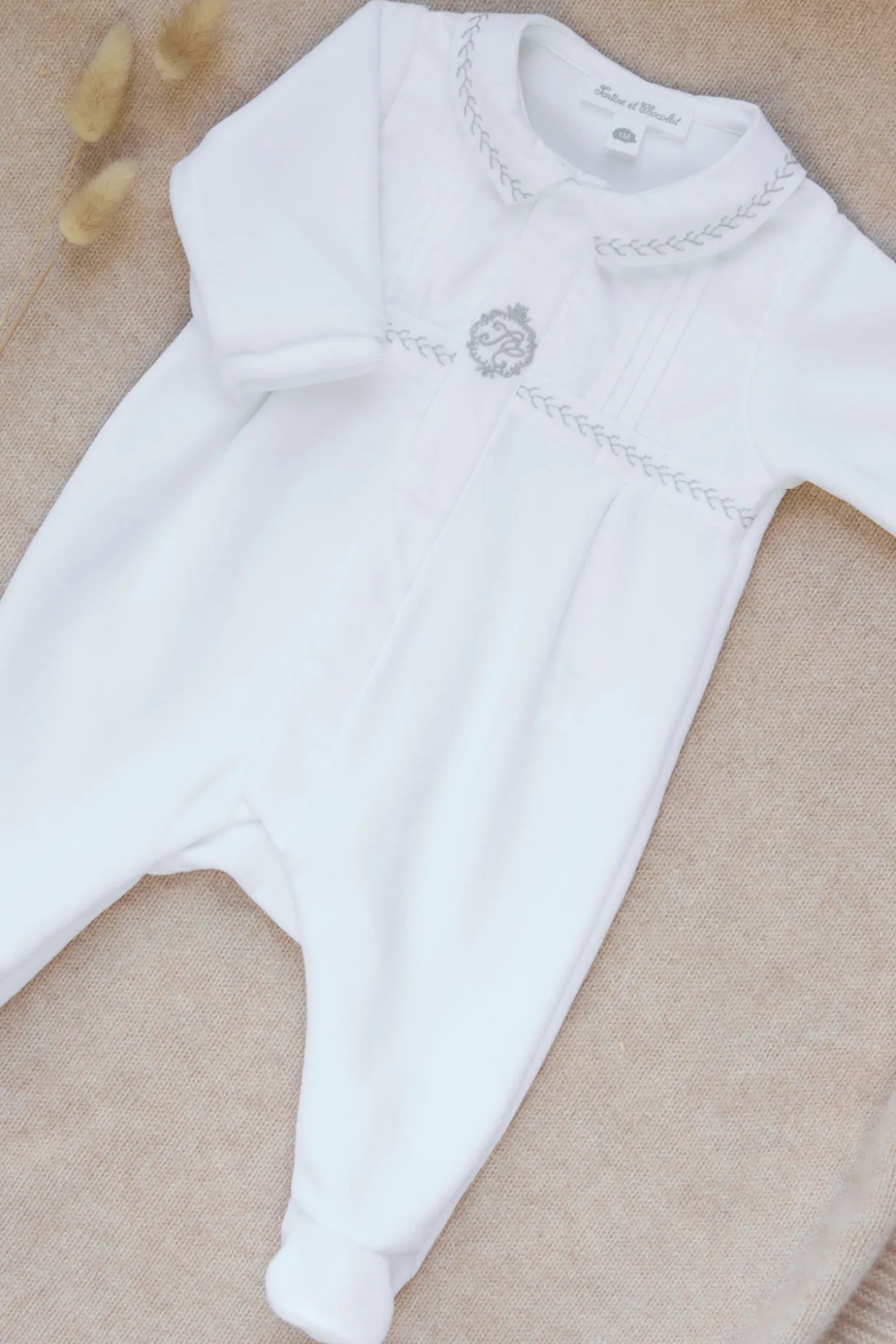 Ce pyjama blanc en velours pour naissance garçon joue la douceur à chaque détail. Les plis religieux apportent une touche délicate, tandis que le col pointu se pare de broderies gris subtils, pour un raffinement tout en douceur. Un essentiel confortable et élégant, pensé pour les premiers jours.