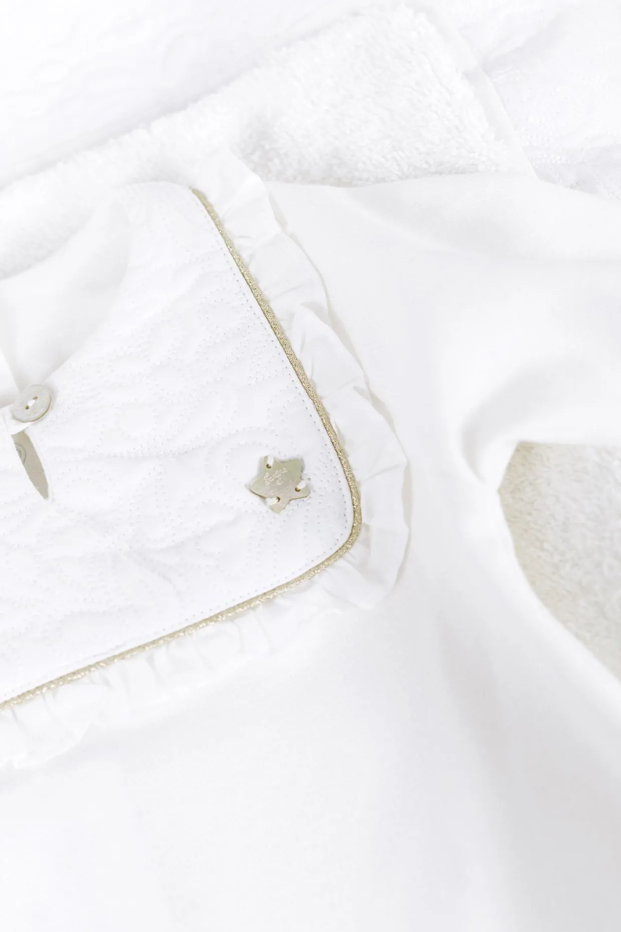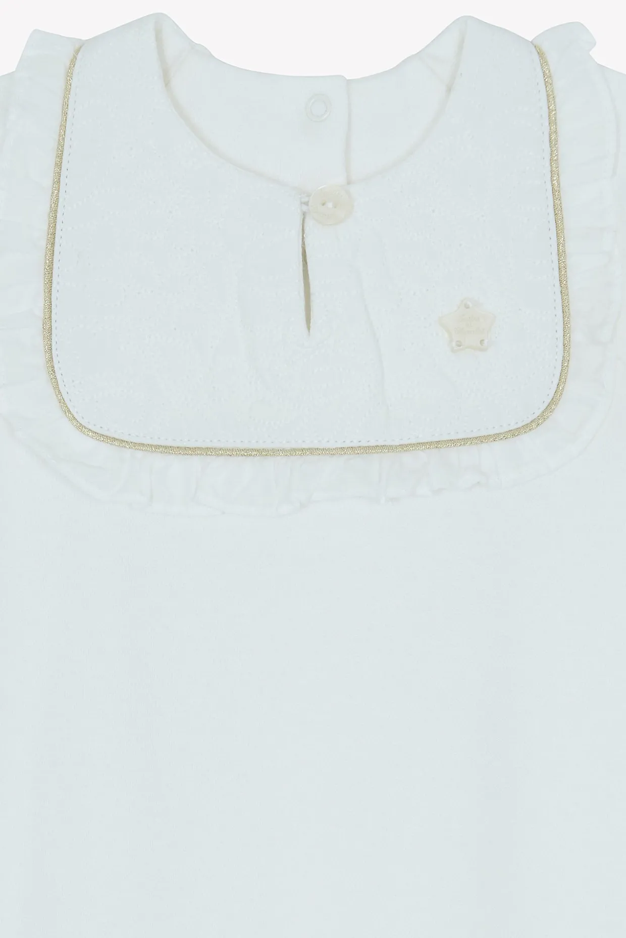 Dors-bien Délicatesse nacre en percale de coton émerisée. Ouvertures par boutons pression dos et entrejambe. La ligne Délicatesse : Le raffinement et l’élégance de cette ligne illuminent l’univers féérique de la petite fille. Plastron en percale brodée, fils d’or et signature nacrée réhaussent avec modernité les lignes épurées de cette collection. Fabriqué au Portugal.