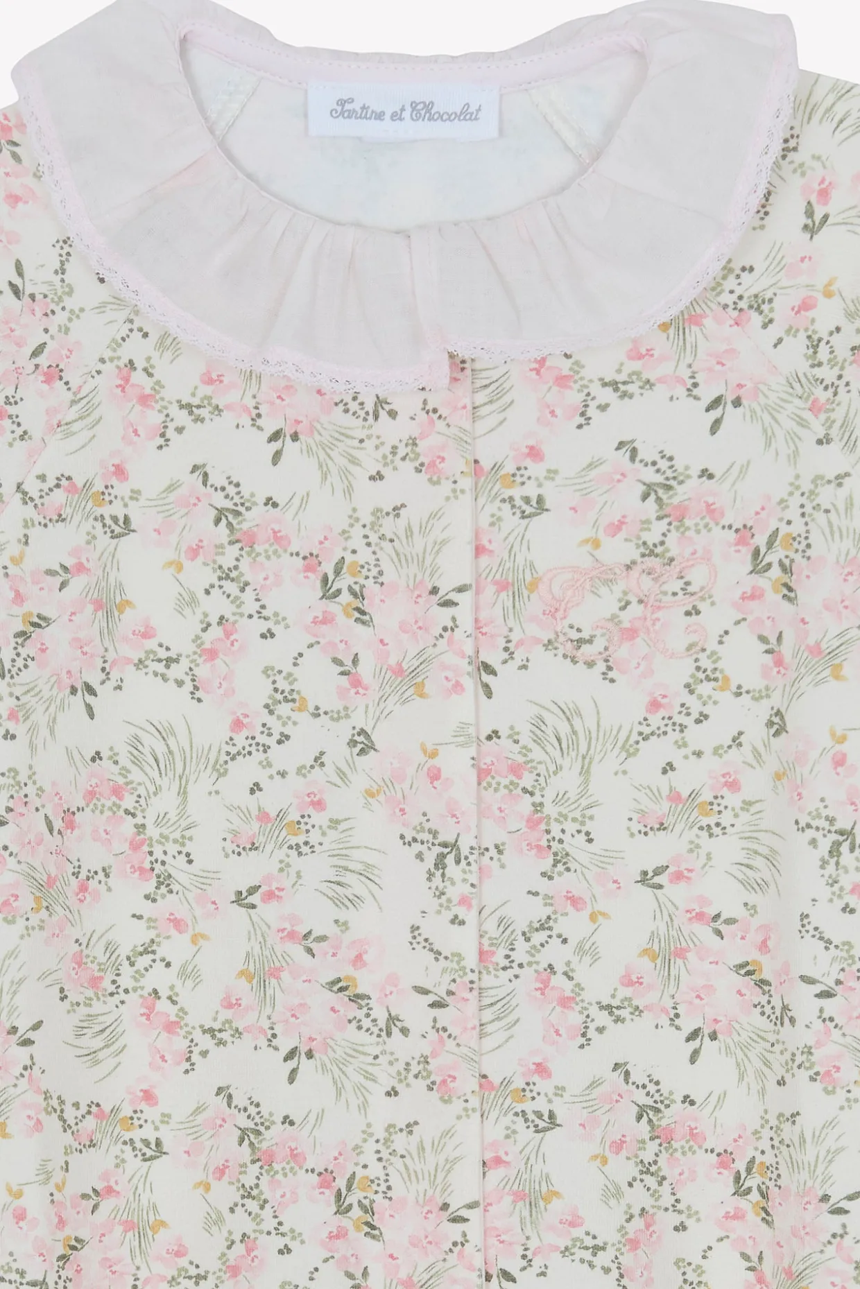 Pyjama en coton doux et confortable, orné d’un imprimé fleuri inspiré d’un Jardin Hivernal avec ouverture par boutons pressions sur le devant. On craque pour son col volanté en dentelle fine.