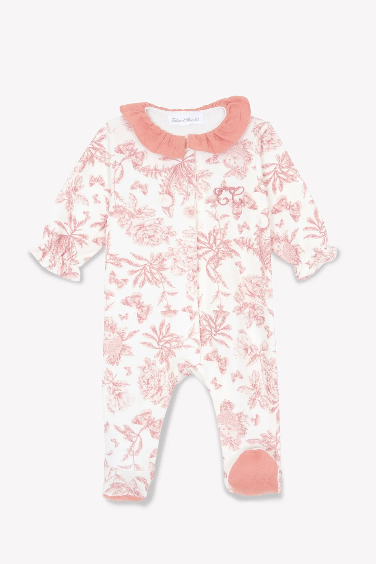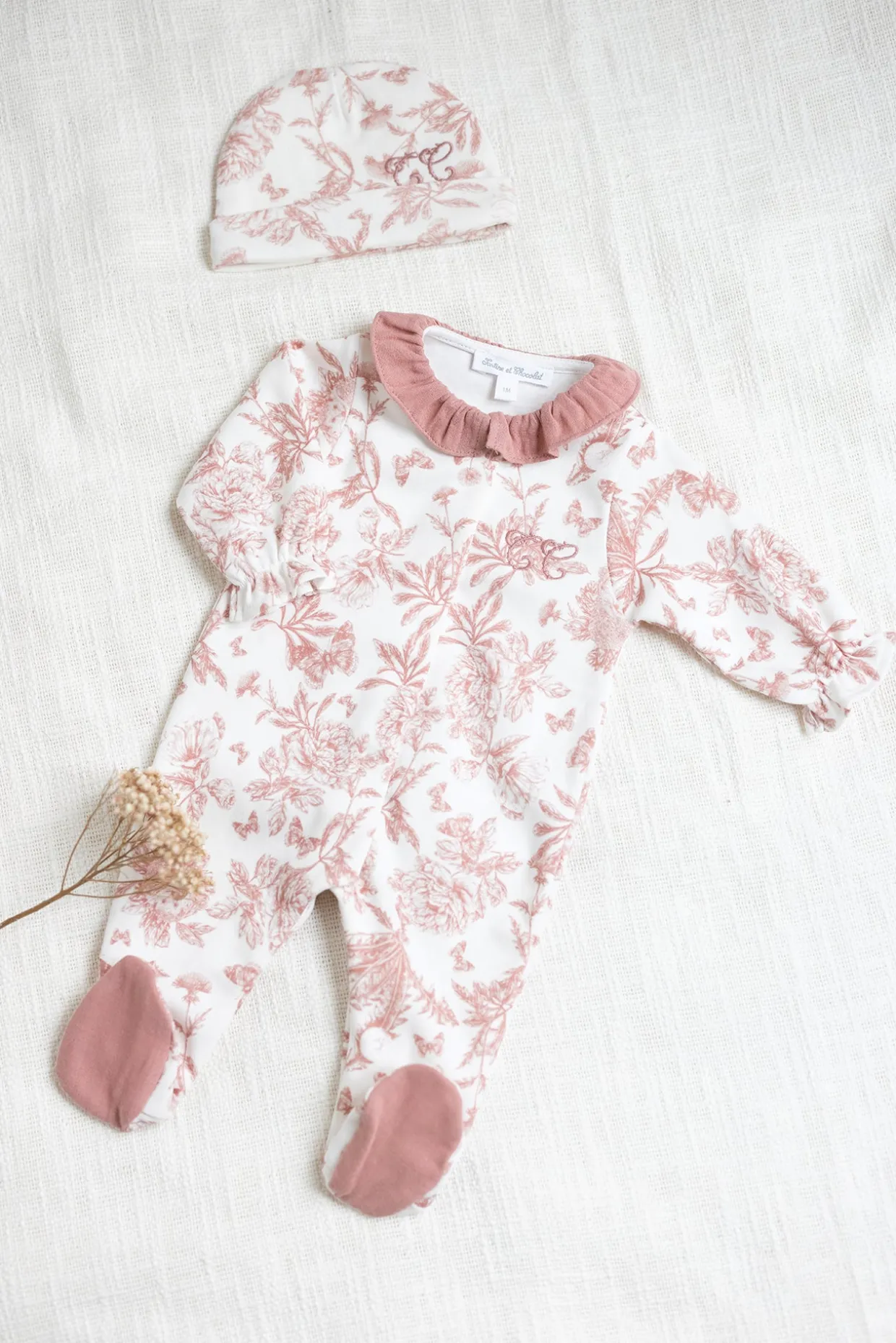 Pyjama imprimé coup de cœur inspiration Toile de Jouy dessiné par Tartine et Chocolat en coton avec ouverture par boutons pressions sur le devant. On craque pour son col volanté en lange rose et le rappel sous les pieds. Bonnet vendu séparément.
