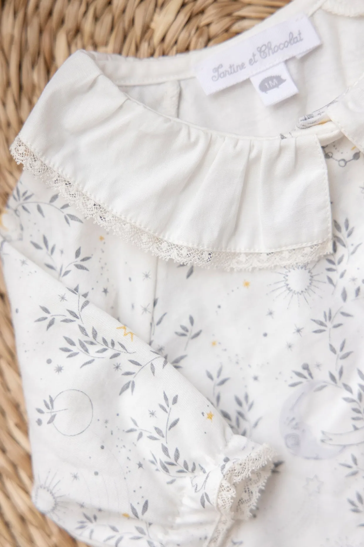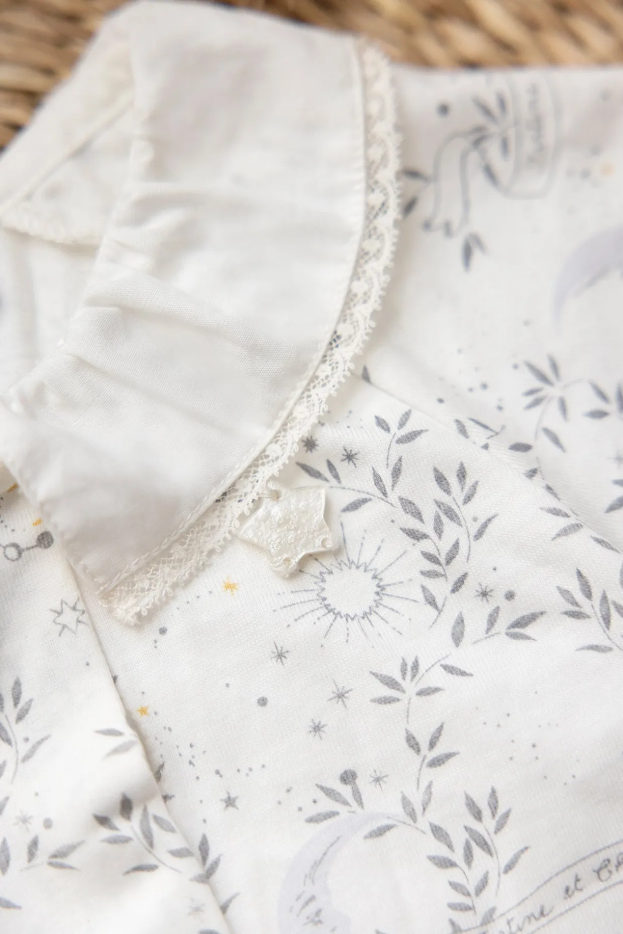 Pyjama imprimé coup de cœur inspiration Rêve Étoilé, dessiné par Tartine et Chocolat en coton, avec ouverture par boutons pressions sur le devant. On craque pour son col volanté, délicat et confortable, ainsi que le rappel sous les pieds. Bonnet vendu séparément.