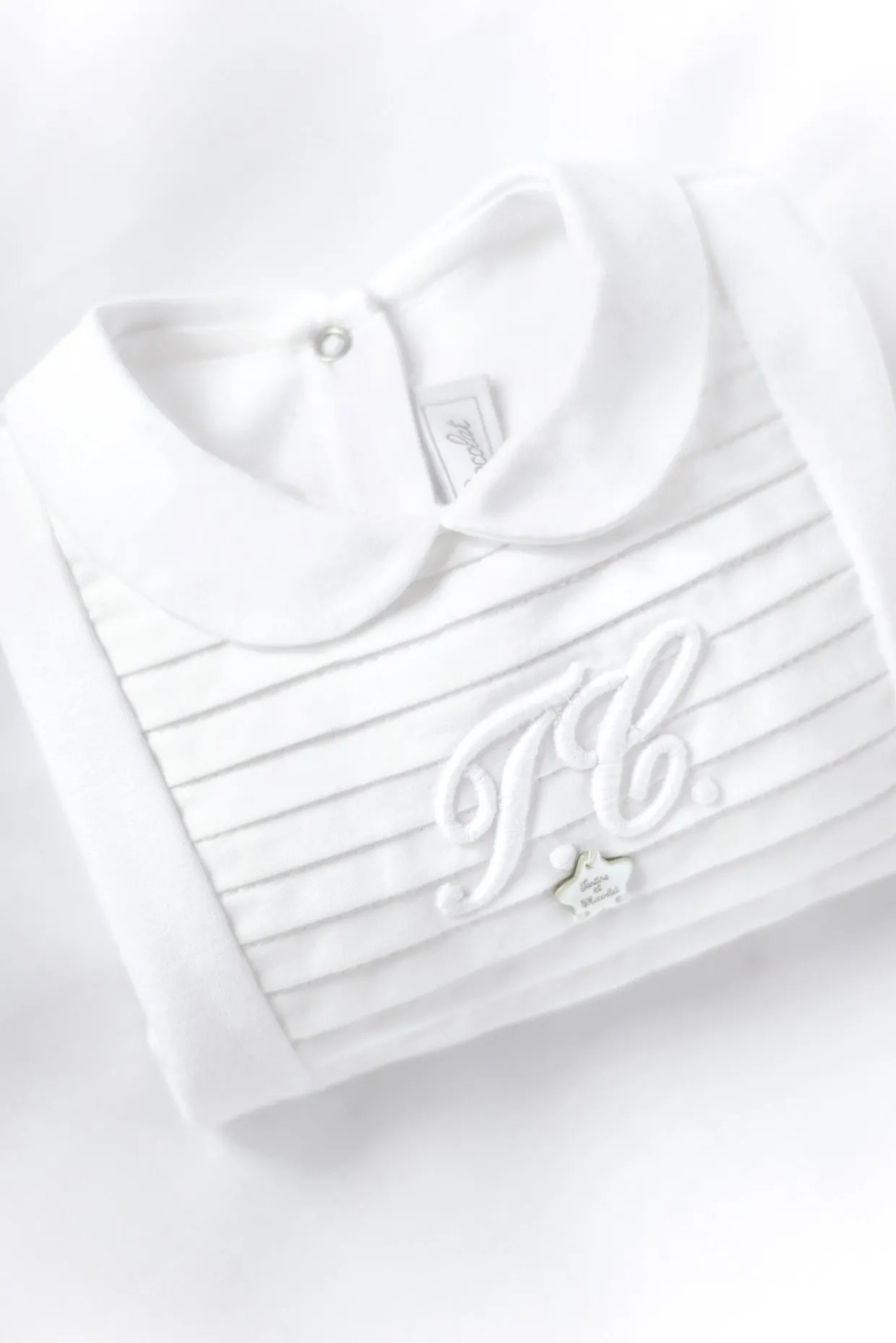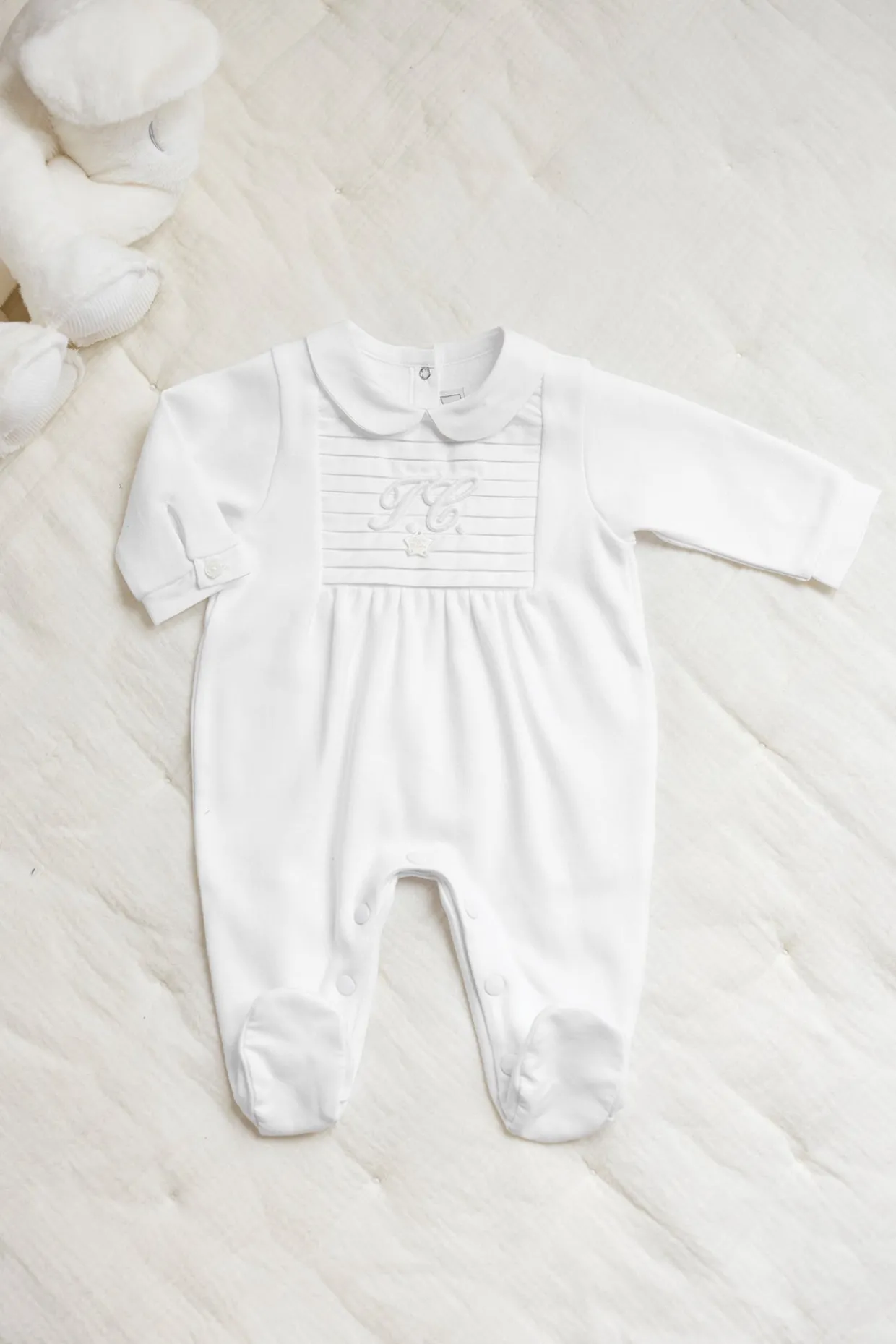 Dors-bien blanc en coton interlock émerisé. Col claudine, plastron plis religieux et broderies MONOGRAMME. Fermeture pressions dos et entrejambe. Fabriqué au Portugal.
