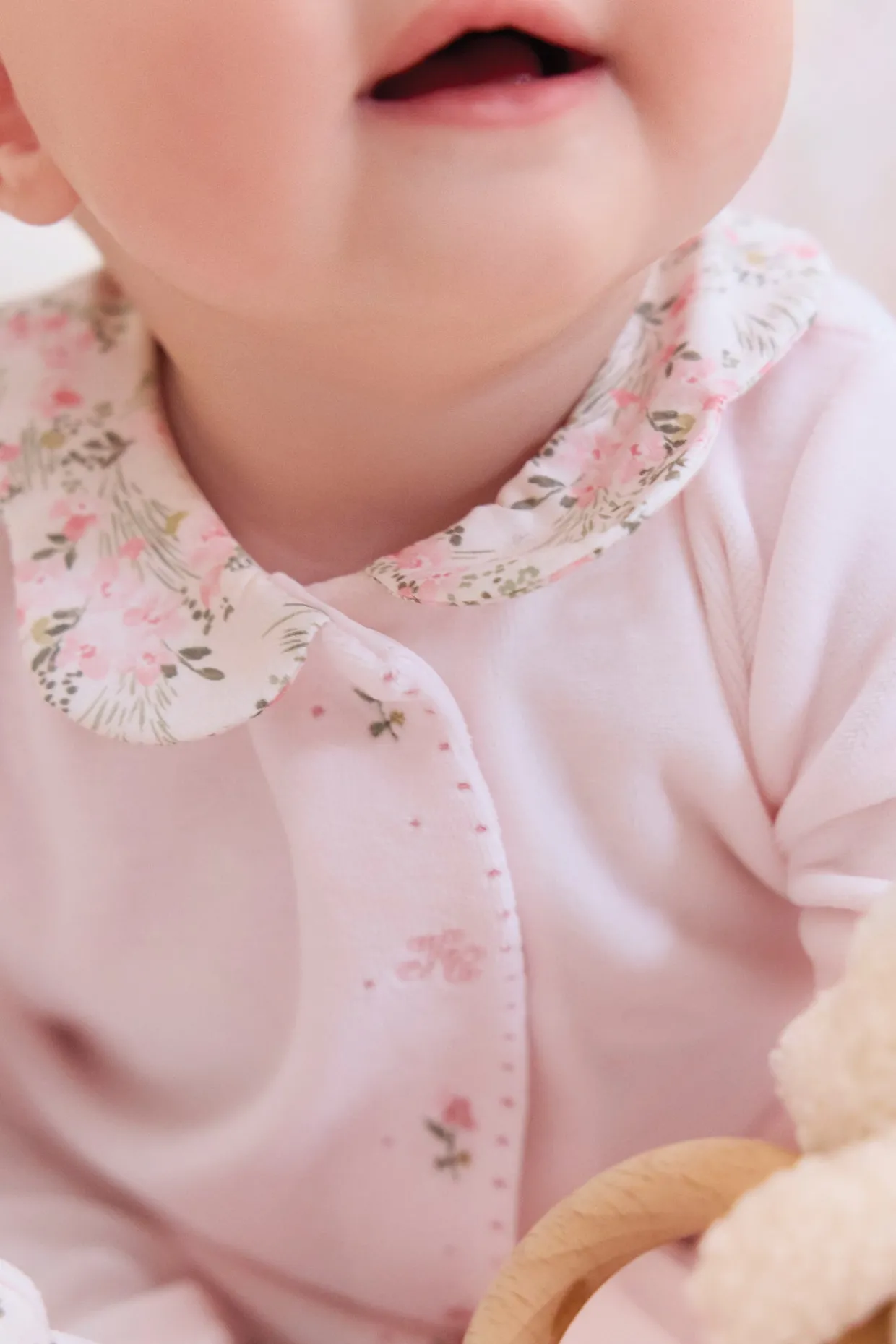 Pyjama en velours rose pâle avec ouverture par boutons pressions sur le devant. On craque pour son col claudine à l’imprimé fleuri inspiré d’un Jardin Hivernal et le rappel sous les pieds.