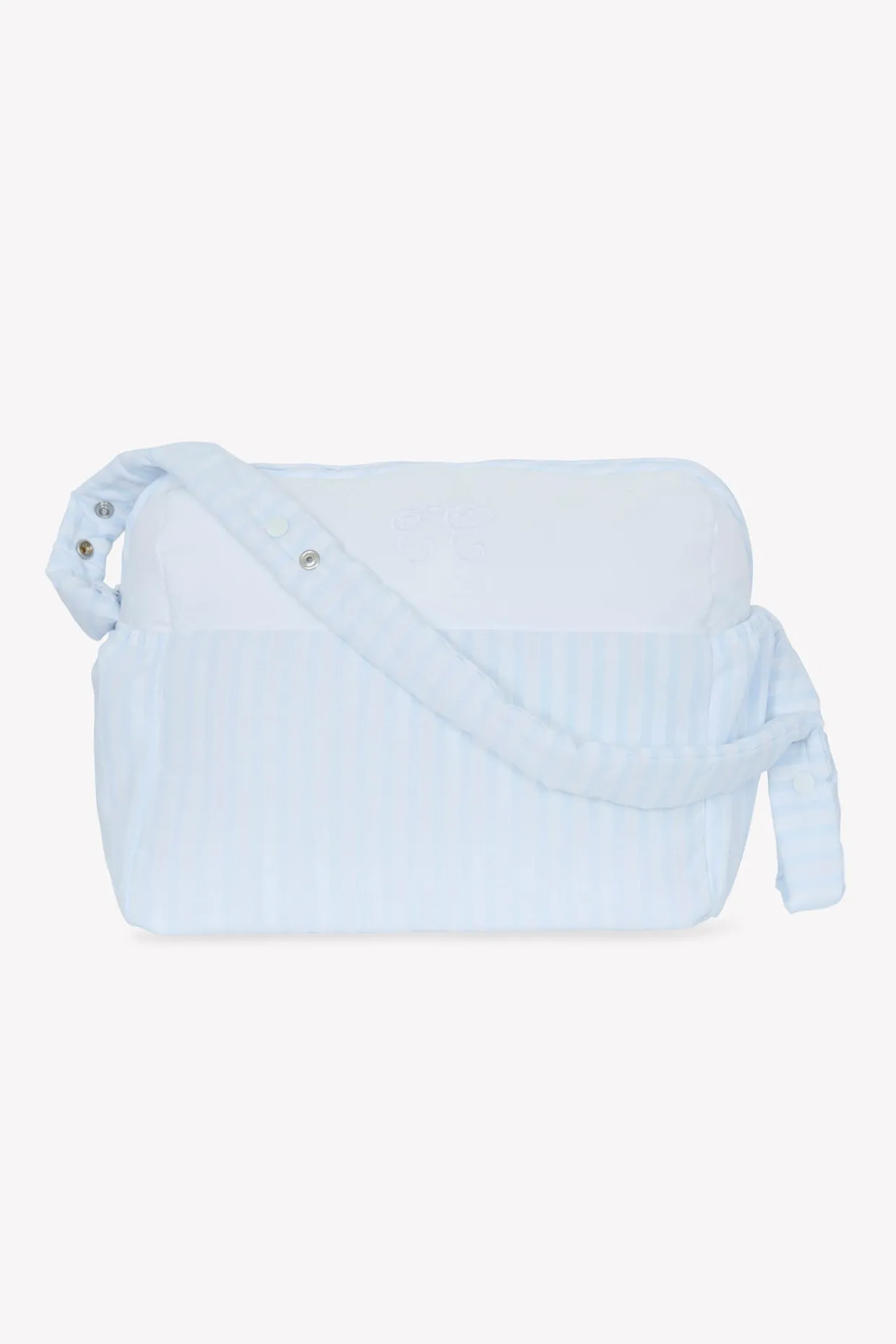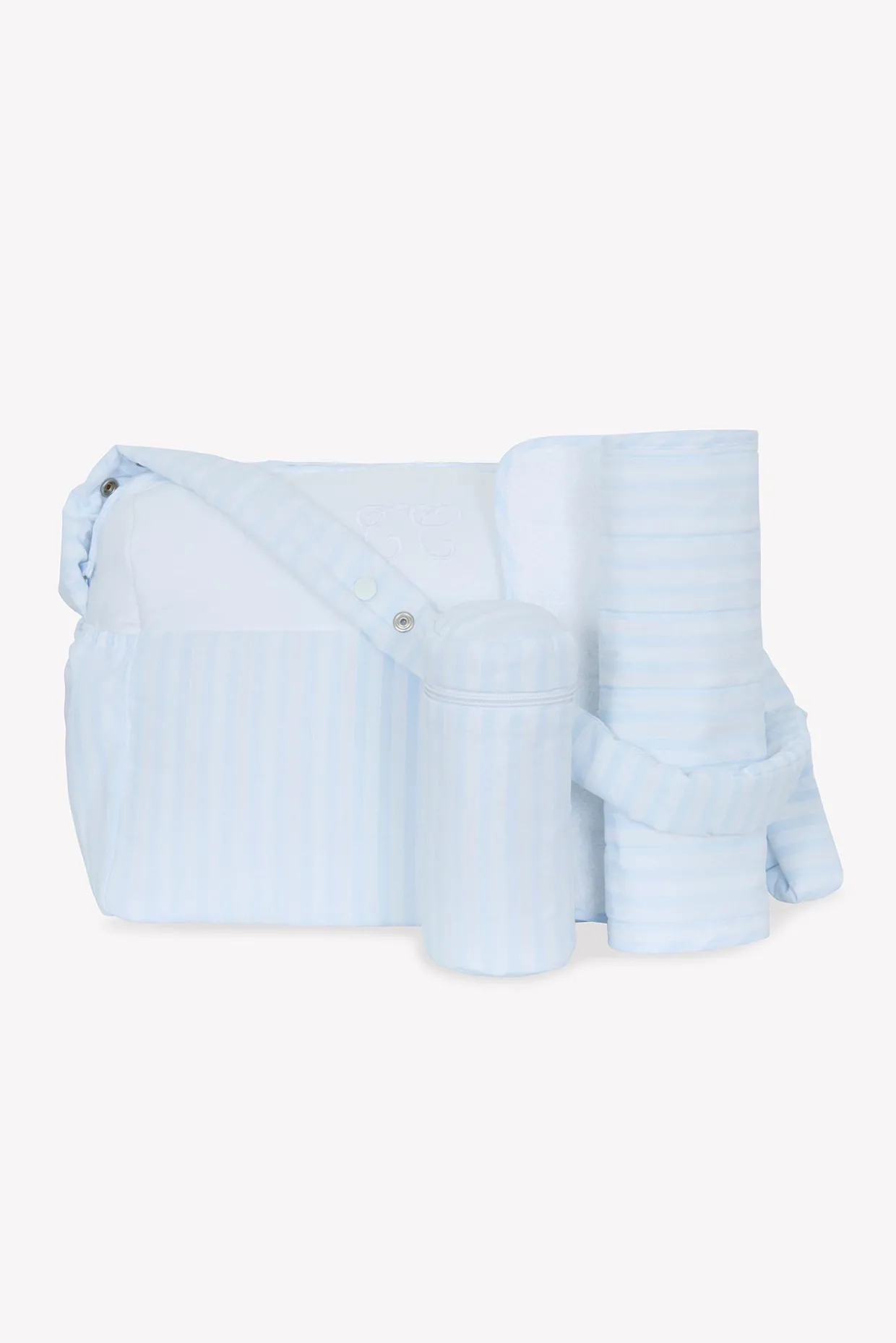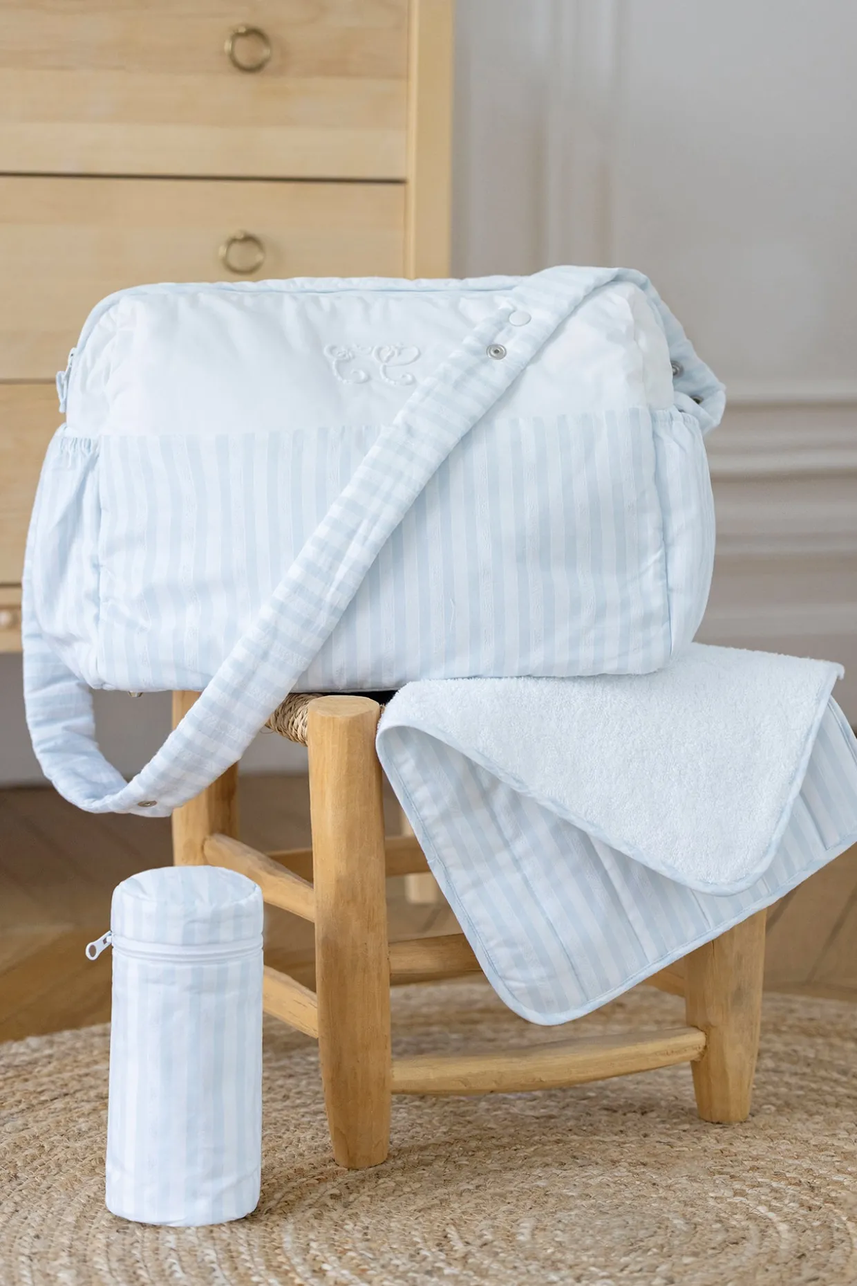 Sac à langer Garda bleu ciel, en popeline de coton avec doublure imperméable. Plusieurs compartiments à l’intérieur et poches élastiquées sur chaque côté. Fond du sac renforcé et amovible pour faciliter le lavage. Livré avec un matelas à langer et un protège-biberon isotherme. Dimensions : 38 x 33 cm. La ligne Rayure Garda : une ligne emblématique qui symbolise tout l’esprit Tartine et Chocolat. Des rayures chics et élégantes, associées aux couleurs pastel de l’enfance, un écusson finement brodé, des tissus doux et tendres. Fabriqué au Portugal.