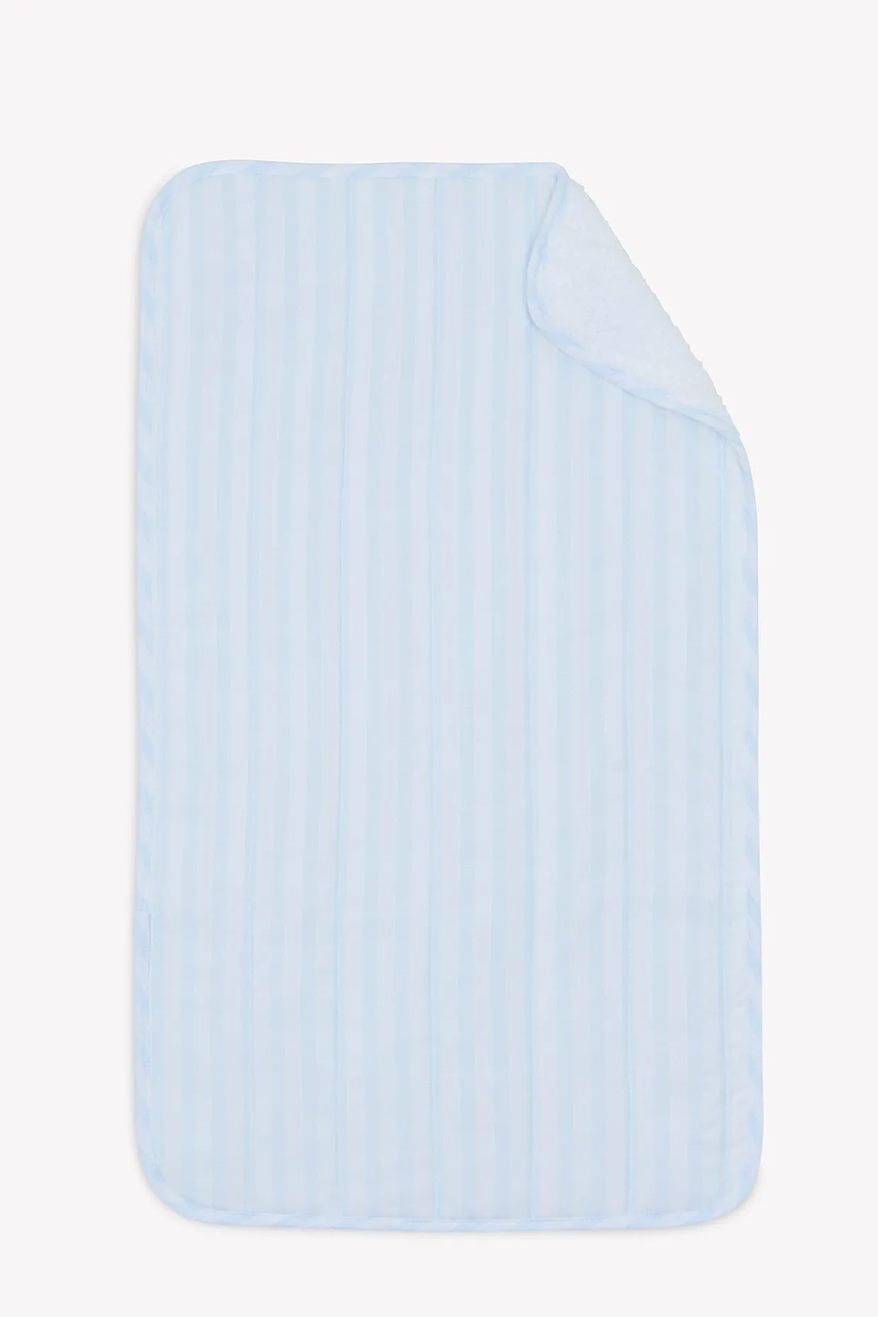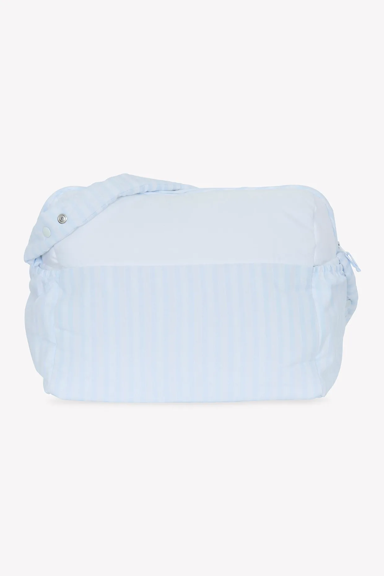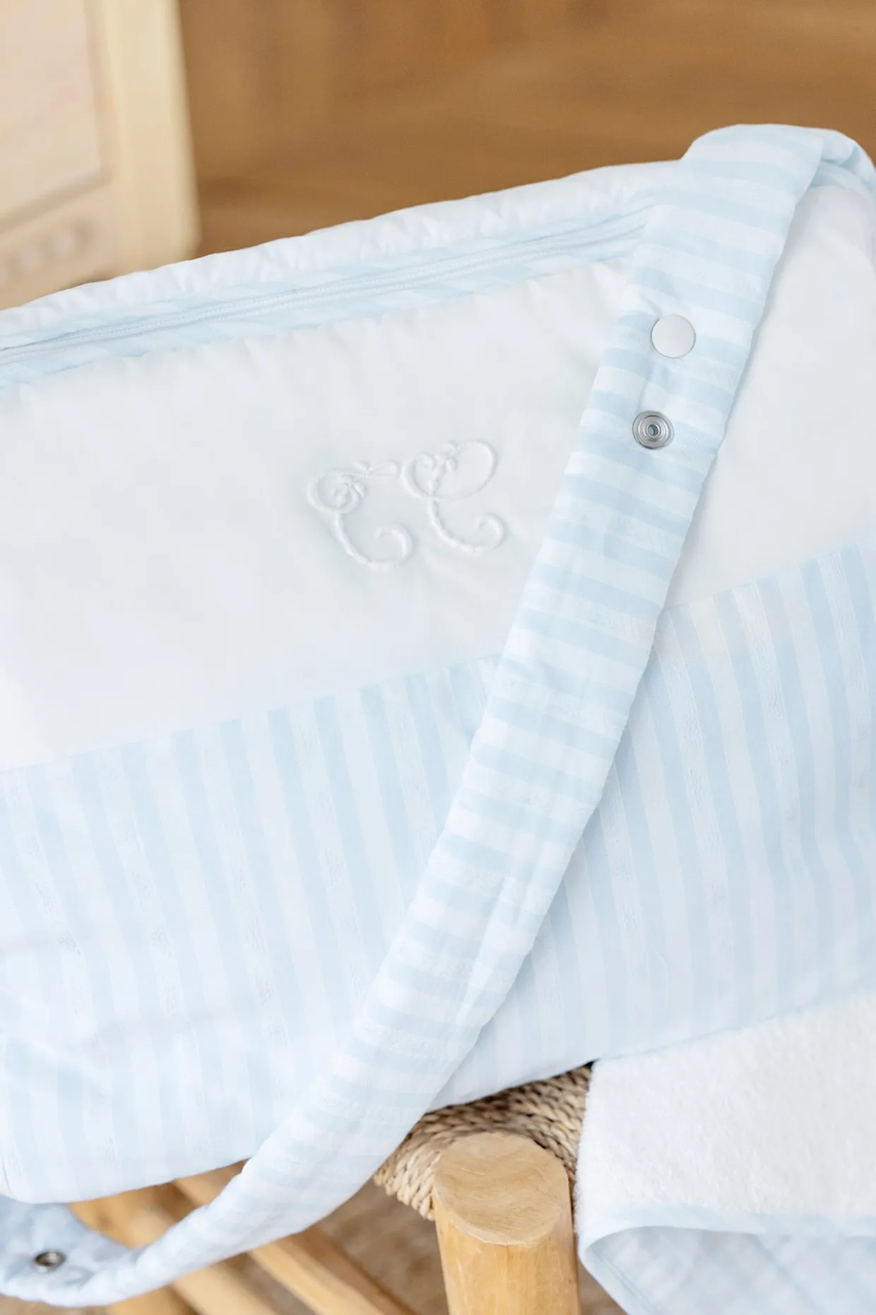 Sac à langer Garda bleu ciel, en popeline de coton avec doublure imperméable. Plusieurs compartiments à l’intérieur et poches élastiquées sur chaque côté. Fond du sac renforcé et amovible pour faciliter le lavage. Livré avec un matelas à langer et un protège-biberon isotherme. Dimensions : 38 x 33 cm. La ligne Rayure Garda : une ligne emblématique qui symbolise tout l’esprit Tartine et Chocolat. Des rayures chics et élégantes, associées aux couleurs pastel de l’enfance, un écusson finement brodé, des tissus doux et tendres. Fabriqué au Portugal.
