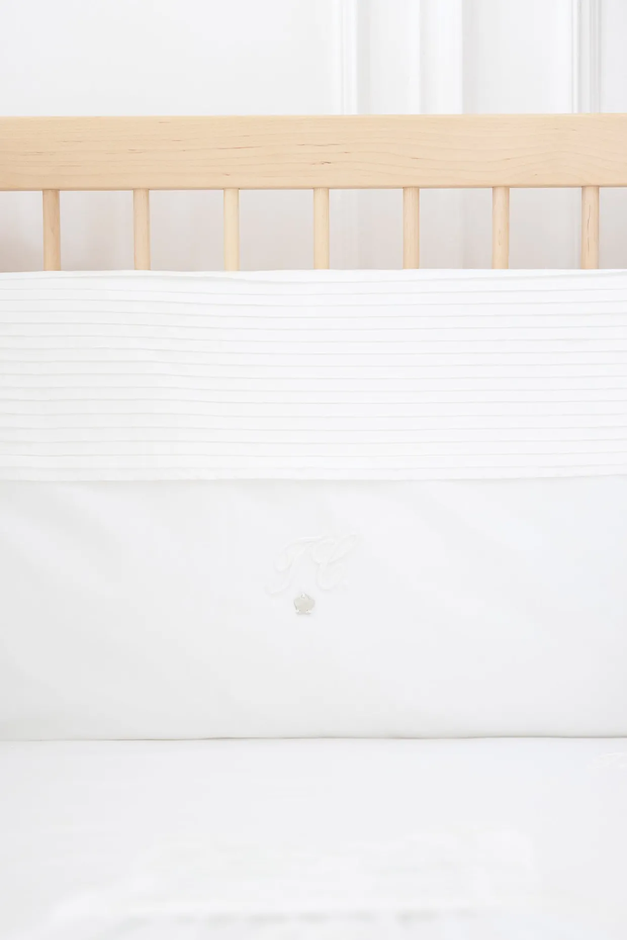 Tour de lit adaptable Monogramme en popeline de coton, piqué et fil à fil. Déhoussable et lavable en machine. Se fixe aux barreaux du lit par de petits noeuds. Compatible pour lits de 60 x 120 cm, ou lits de 70 x 140 cm. La ligne Monogramme : Etoiles de nacre, plis religieux et broderies réhaussent avec délicatesse l’élégance et la pureté de cette ligne. Discret et chic, cette ligne pour fille ou garçon est un véritable cocon de blancheur. Fabriqué au Portugal.