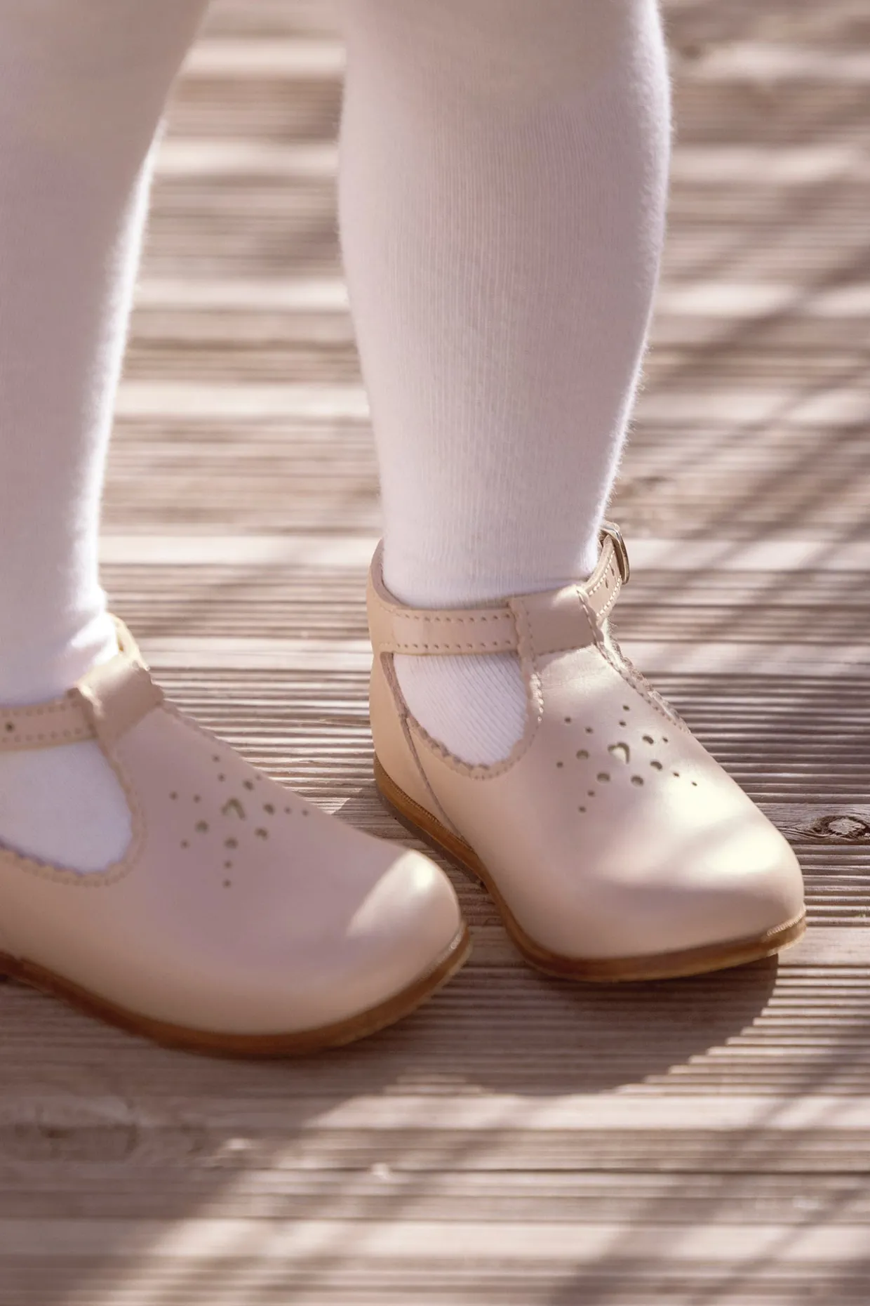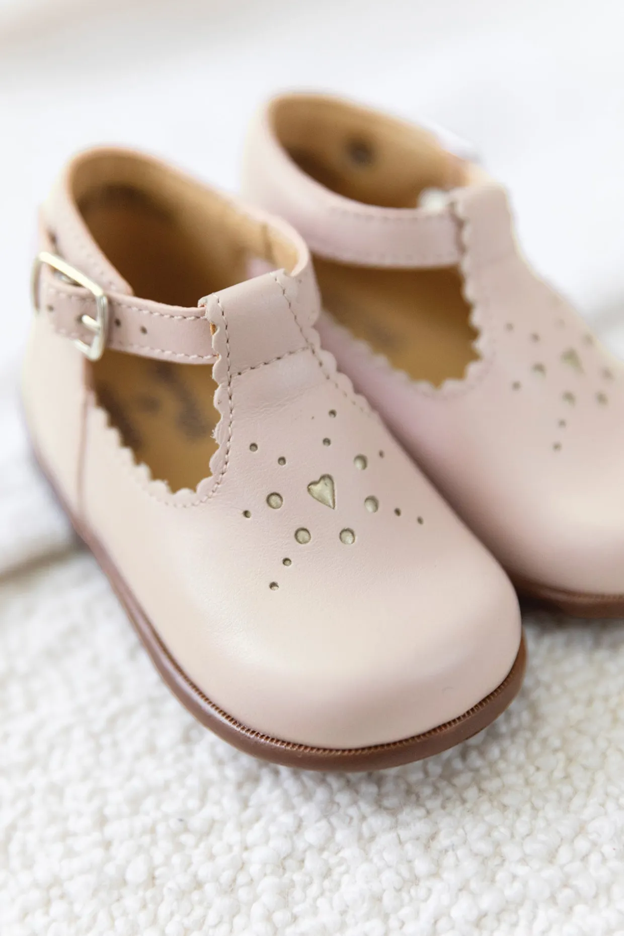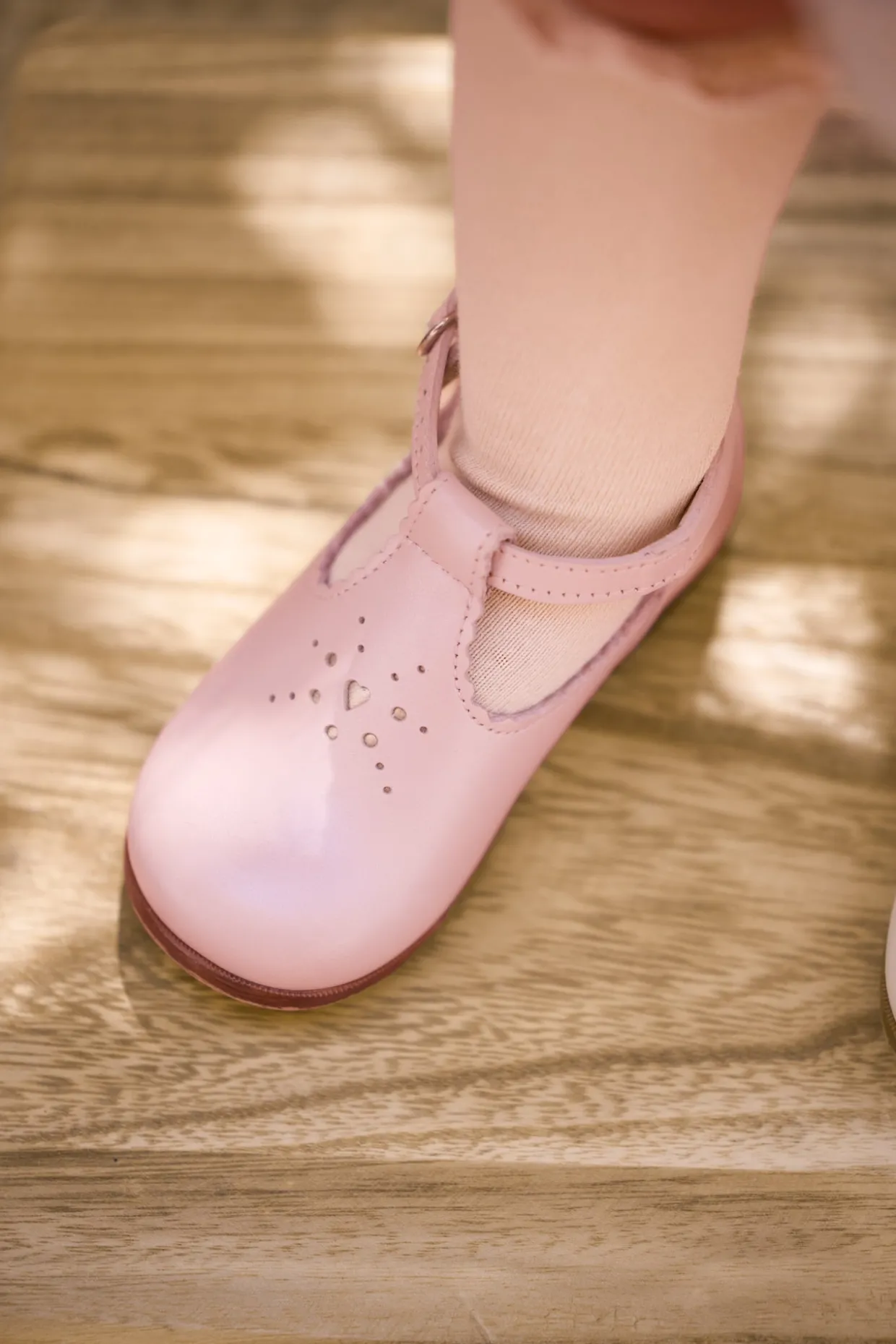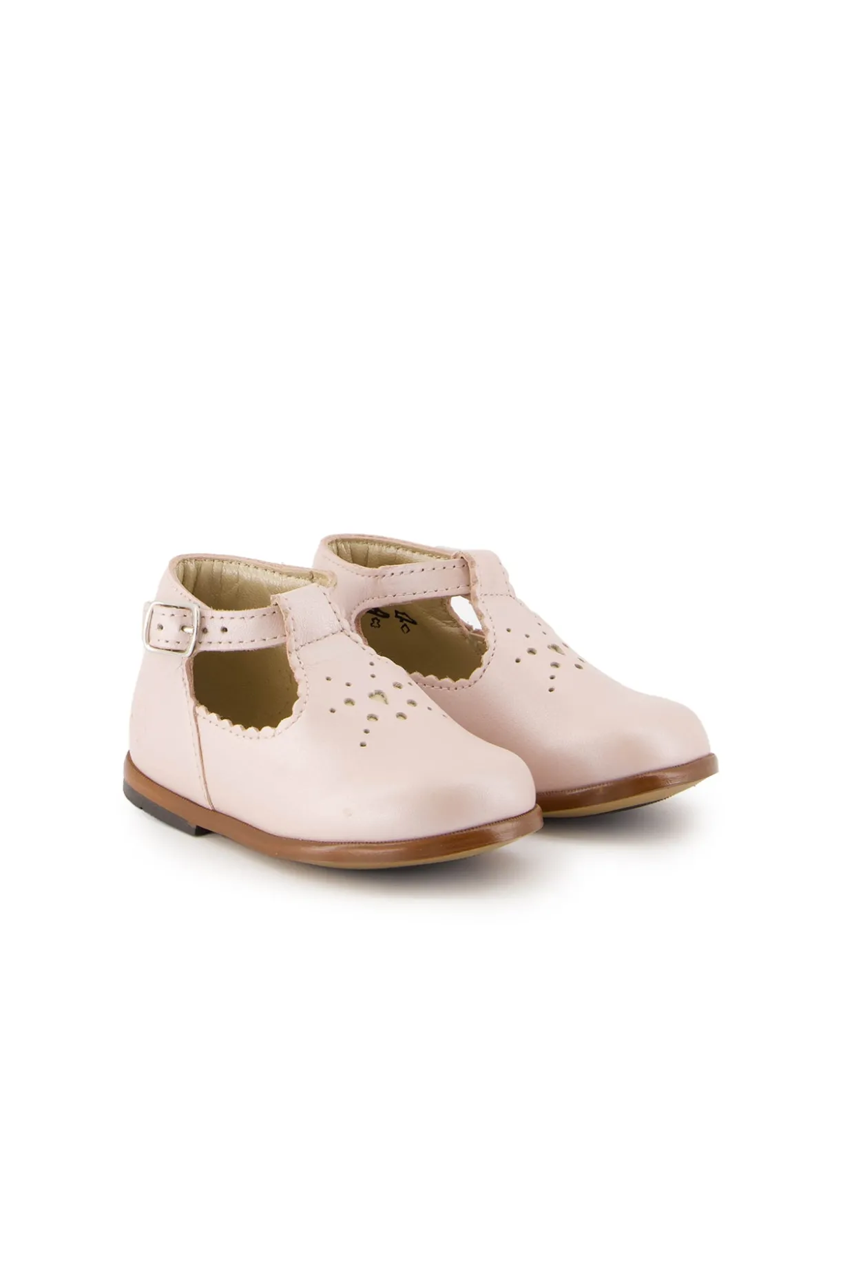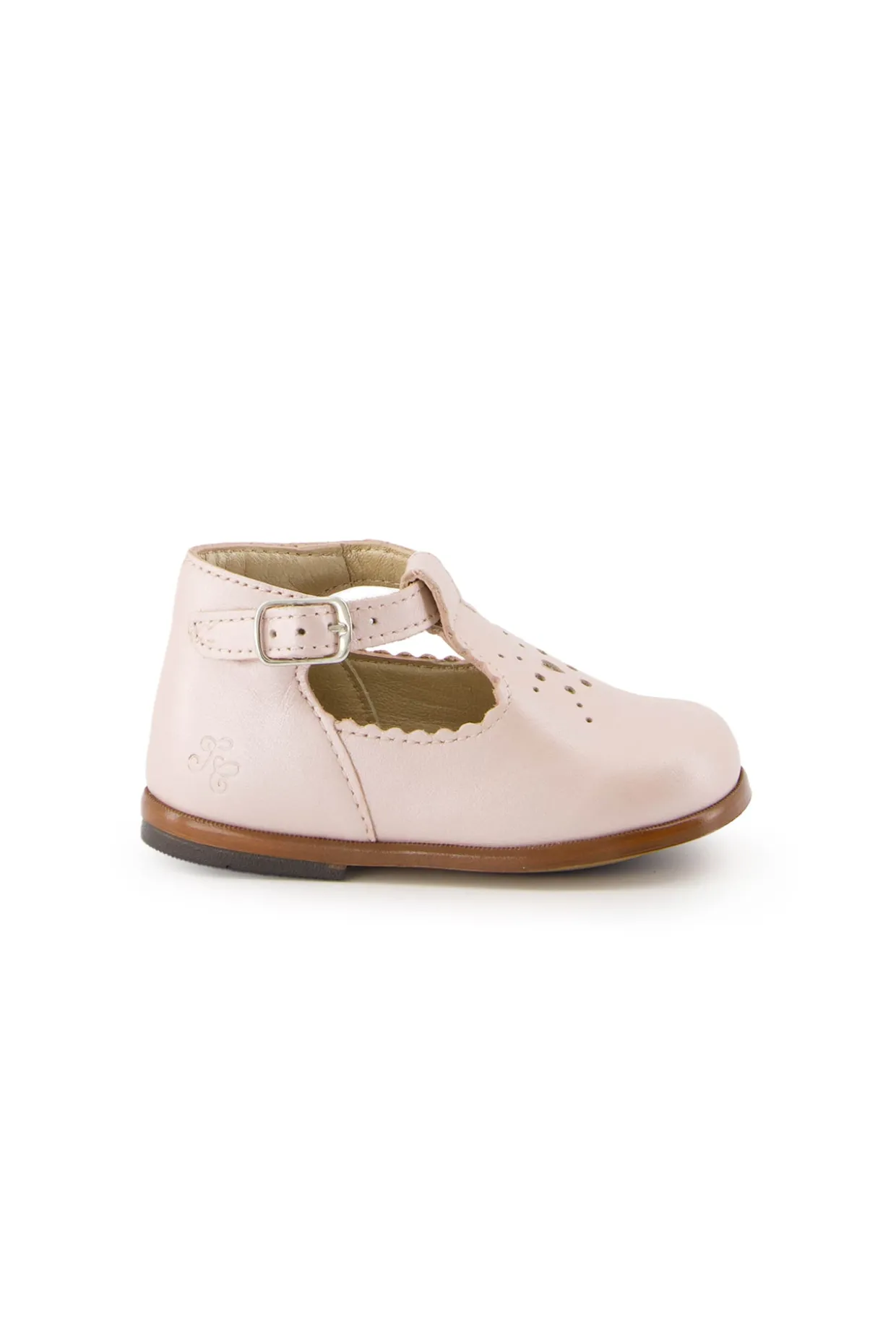 Ces salomés premiers-pas sont présentés dans une version en cuir lisse rose, avec des perforations sur le dessus. Ils sont conçus avec des matériaux de qualité pour le bon développement du pied et l’apprentissage de la marche. Dotés d’un contrefort asymétrique et d’un emboîtage arrière fin, ils se chaussent facilement grâce à une boucle réglable permettant un bon ajustement et un maintien de la cheville. La semelle intérieure ne possède pas de voûte plantaire afin de laisser le pied se muscler librement. Ces délicates babies avec leur design élégant et leur confort optimal, seront parfaites pour accompagner votre petite princesse dans ses premières aventures.
