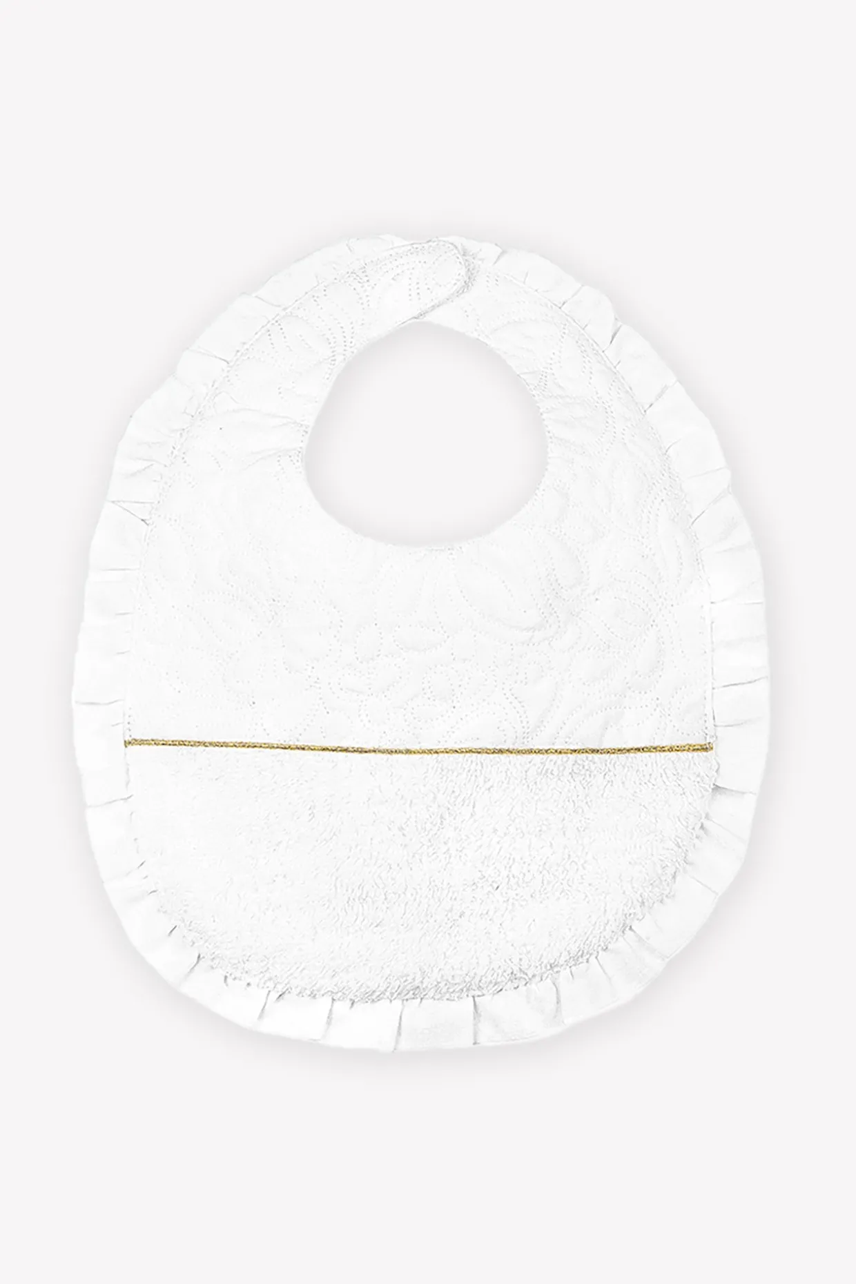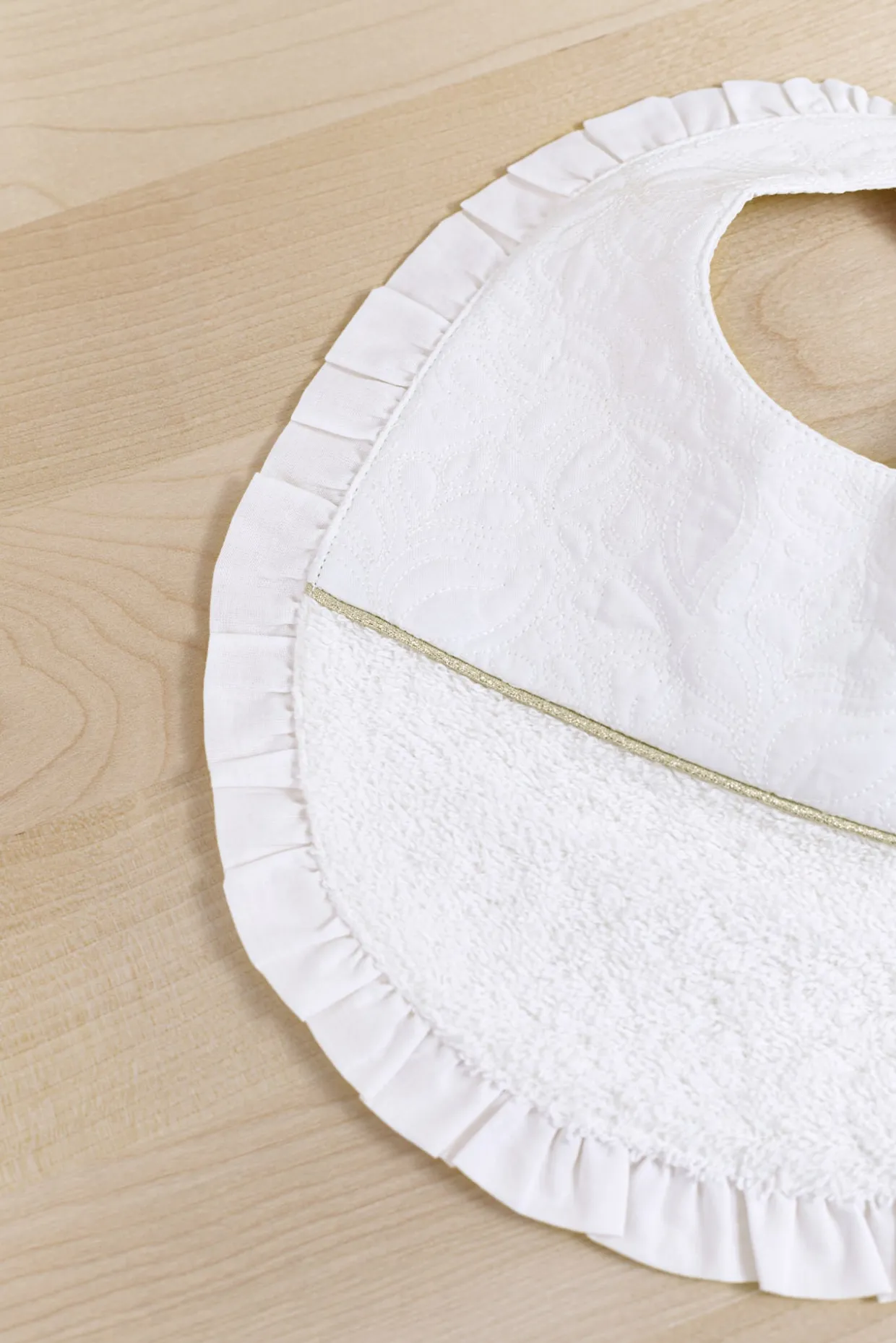 Bavoir Délicatesse nacre en percale de coton émérisée et broderies. Livré dans une pochette en organza. Ouverture par un bouton pression. Dimensions : 21 x 27,5 cm. La ligne Délicatesse : Le raffinement et l’élégance de cette ligne illuminent l’univers féérique de la petite fille. Plastron en percale brodée, fils d’or et signature nacrée réhaussent avec modernité les lignes épurées de cette collection. Fabriqué au Portugal.