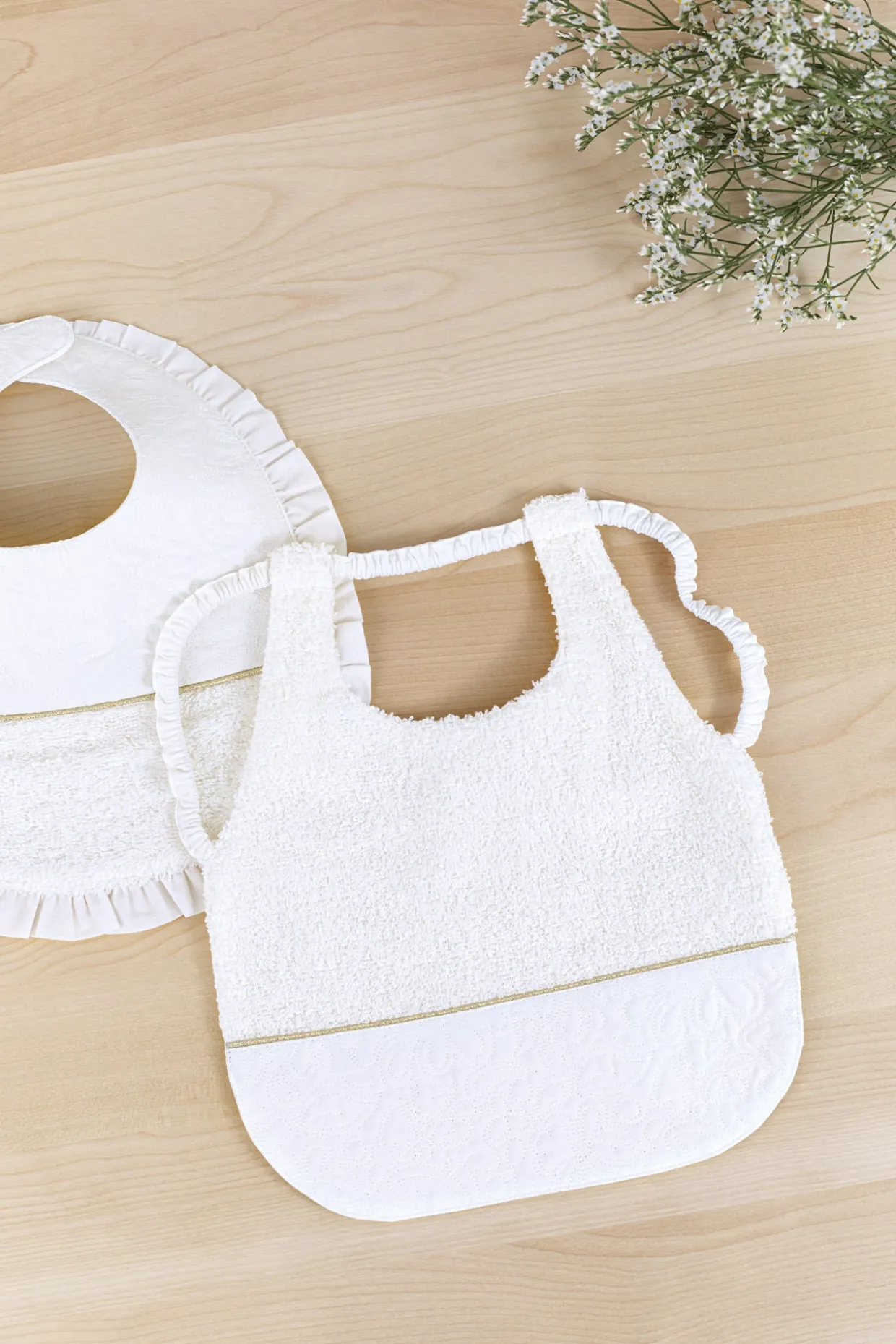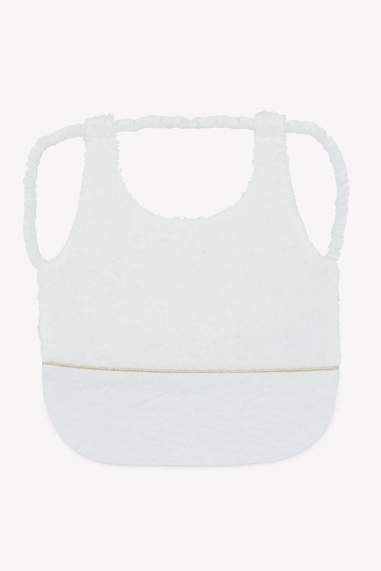 Bavoir Délicatesse nacre en percale de coton émérisée et broderies. Livré dans une pochette en organza. Passage pour les bras et la tête. Dimensions : 24 x 28 cm. La ligne Délicatesse : Le raffinement et l’élégance de cette ligne illuminent l’univers féérique de la petite fille. Plastron en percale brodée, fils d’or et signature nacrée réhaussent avec modernité les lignes épurées de cette collection. Fabriqué au Portugal.