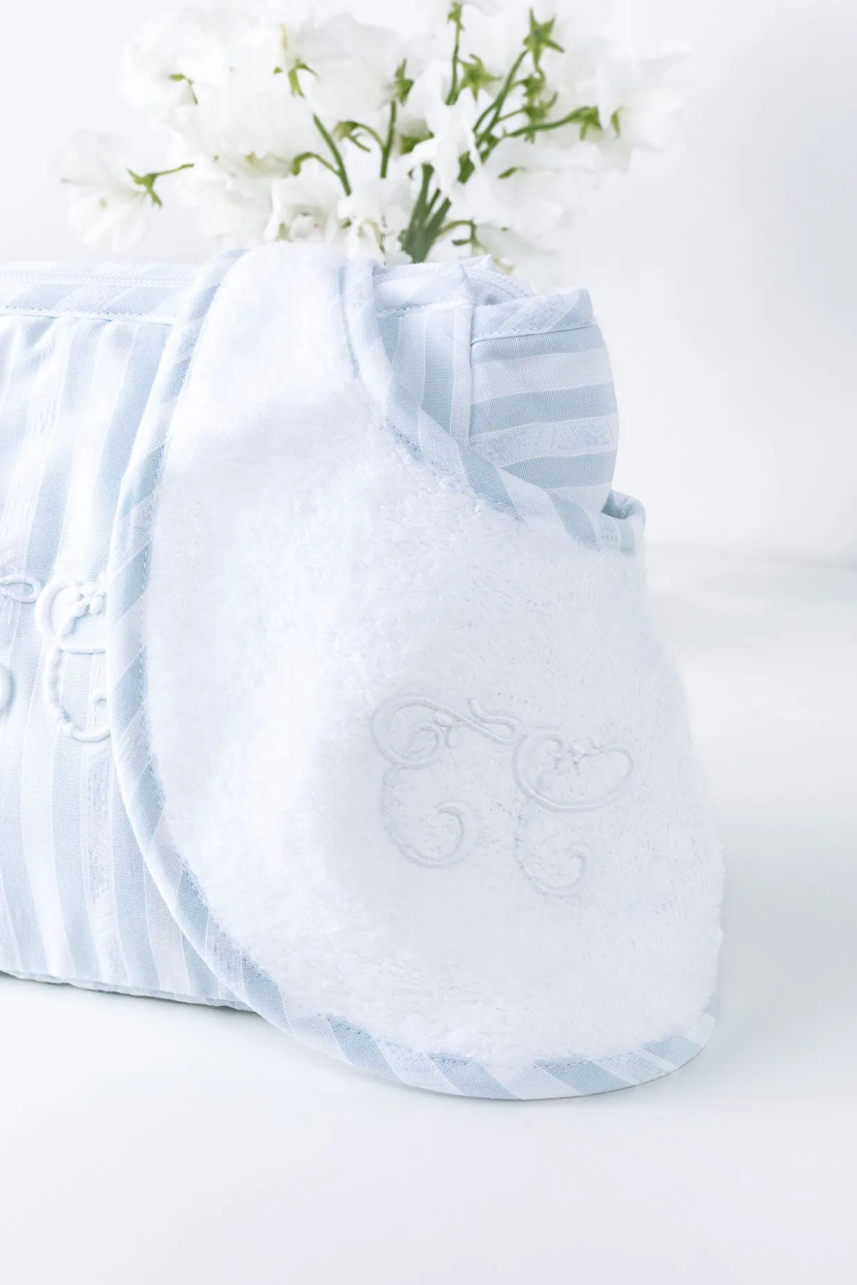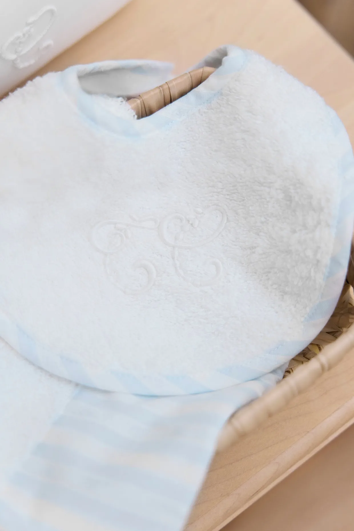 Bavoir Garda bleu ciel en popeline de coton, piqué fil à fil et éponge. Livré dans une pochette Garda rose pâle. Ouverture par un bouton pression. Dimensions : 15 x 20 cm. La ligne Garda : une ligne emblématique qui symbolise tout l’esprit Tartine et Chocolat. Des rayures chics et élégantes, associées aux couleurs pastel de l’enfance, un écusson finement brodé, des tissus doux et tendres. Fabriqué au Portugal.