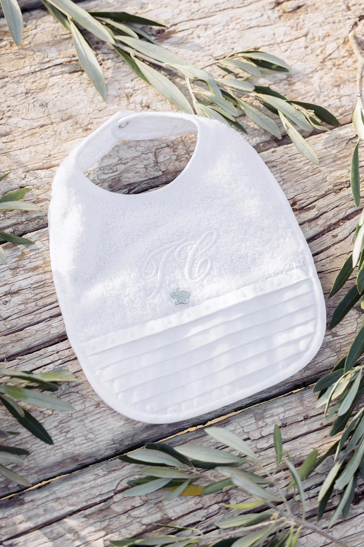 Bavoir Monogramme blanc en popeline de coton, piqué et fil à fil. Ouverture par un noeud. Dimensions : 15 x 20 cm La ligne Monogramme : Etoiles de nacre, plis religieux et broderies réhaussent avec délicatesse l’élégance et la pureté de cette ligne. Discret et chic, cette ligne pour fille ou garçon est un véritable cocon de blancheur. Composition : 100% coton Fabriqué au Portugal