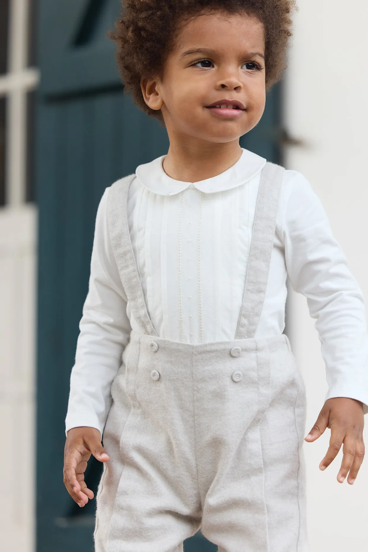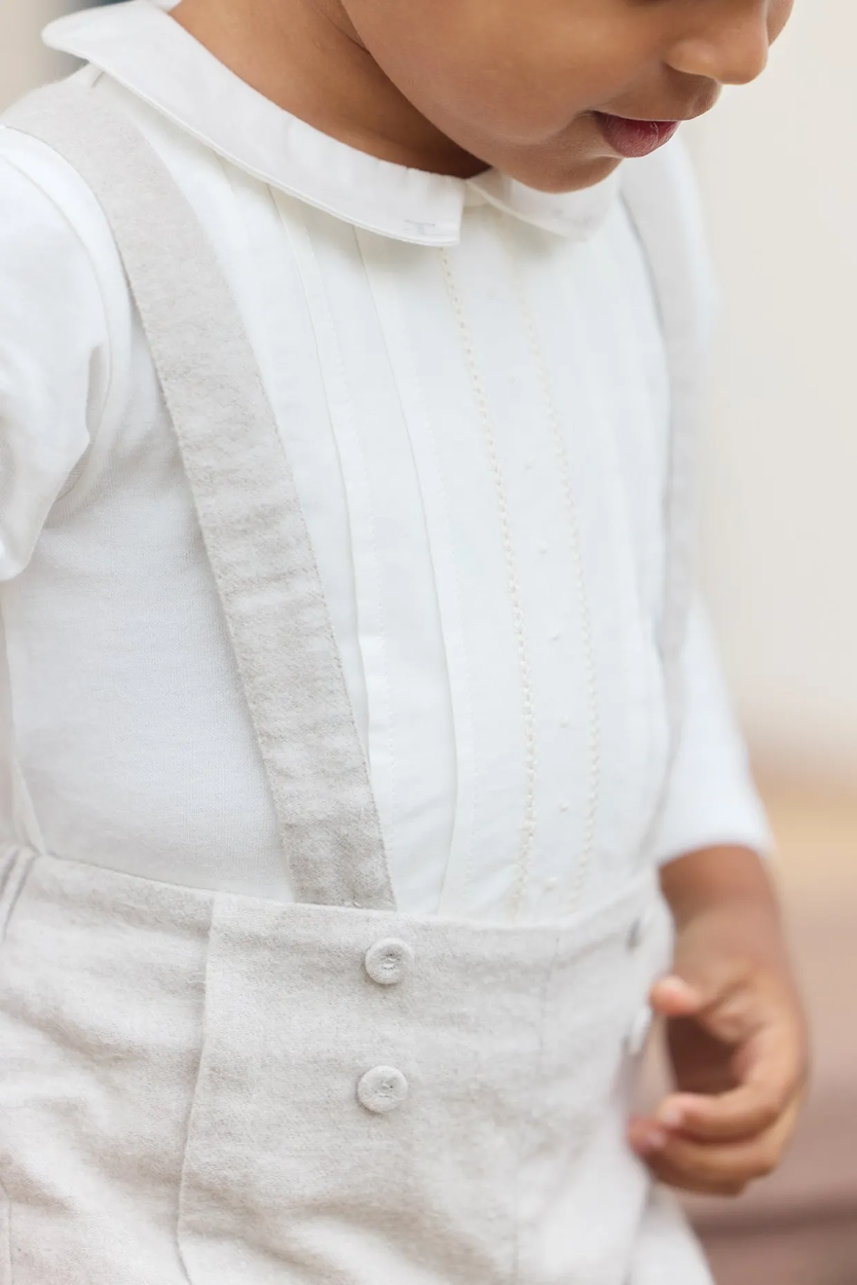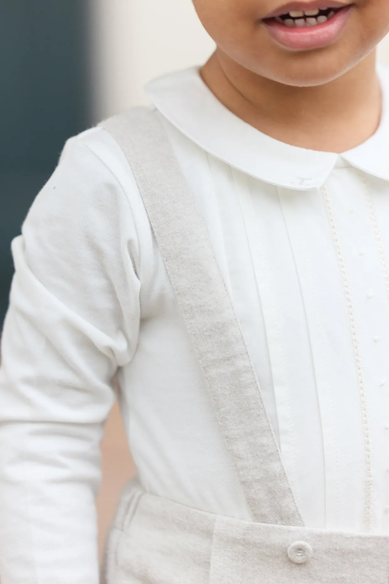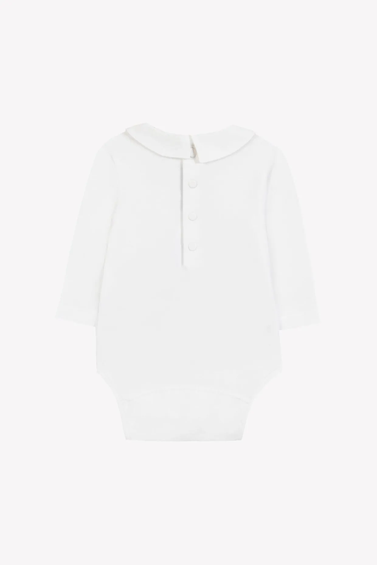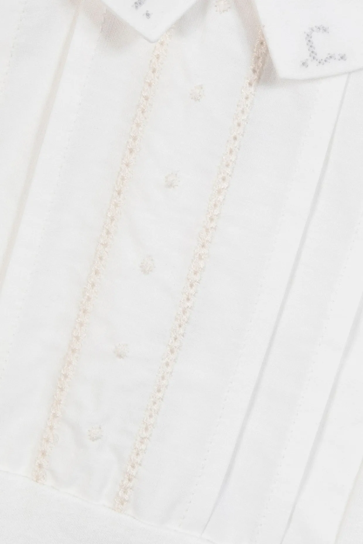 Idéal pour une cérémonie, ce body nacre à manches longues pour bébé garçon est sublimé par des plis religieux et un monogramme TC brodé sur le col, ajoutant une touche de raffinement intemporel. Confectionné en coton doux pour le confort de bébé, il s’associe parfaitement avec les pièces de la collection cérémonie pour un ensemble chic et harmonieux.